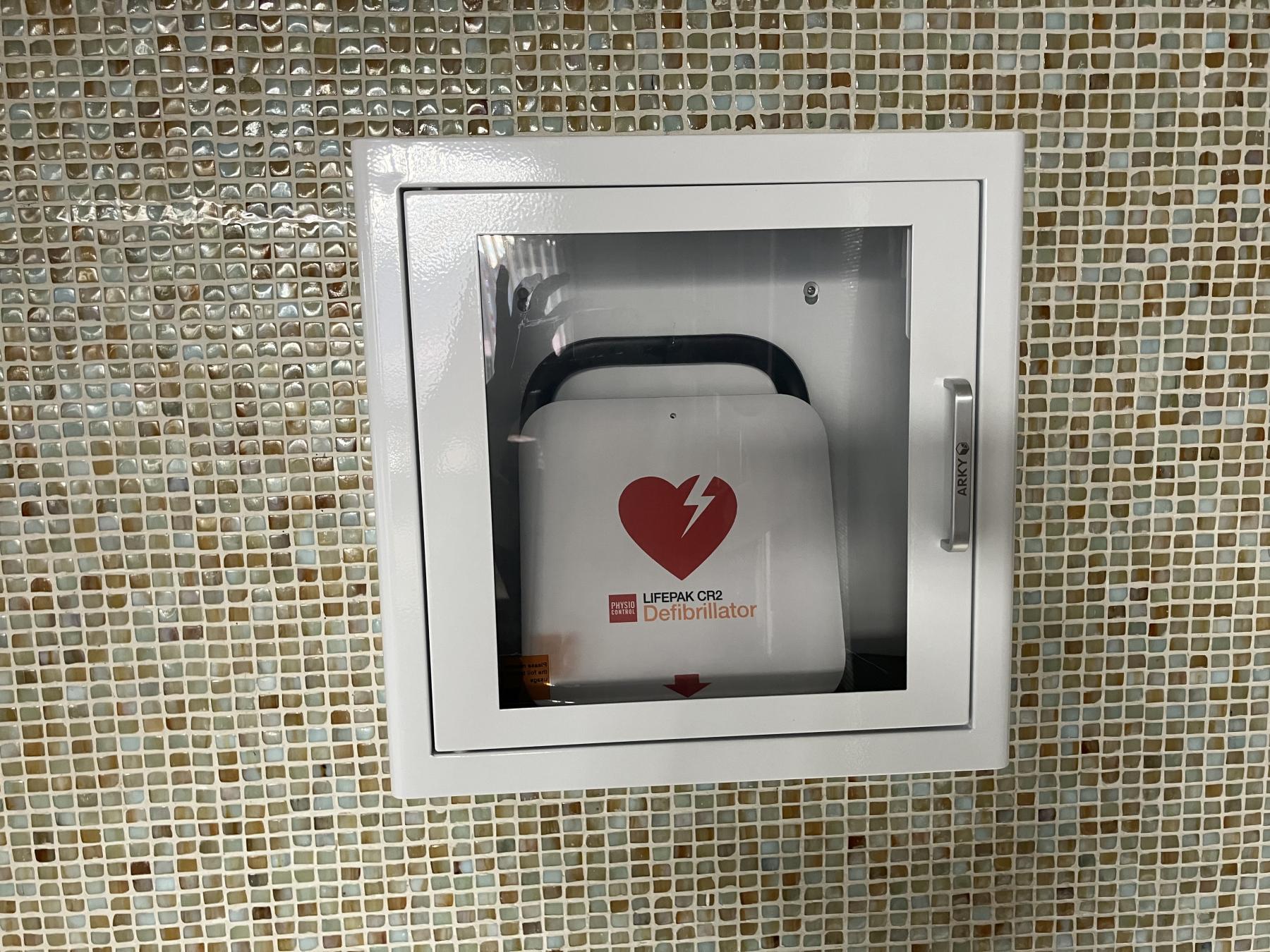 Oba přístroje jsou uloženy v bílých nezamčených skříňkách. Otevření dvířek automaticky aktivuje hlasitý alarm, která upozorní okolí na mimořádnou situaci; po jejich zavření se alarm opět vypne.