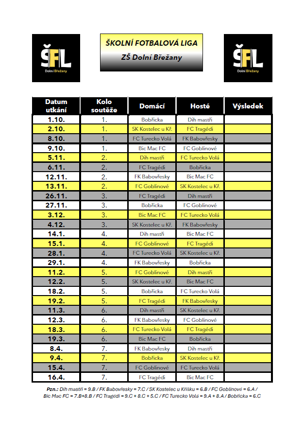 Tento rok se na škole po úspěšném 1. ročníku bude konat opět Školní fotbalová liga. Celkem 8 družstev napříč 5.-9. ročníky se utká o titul mistra školy v průběhu celého školního roku, kdy vítěz bude korunován na konci školního roku ve velkém finále.