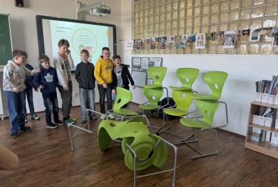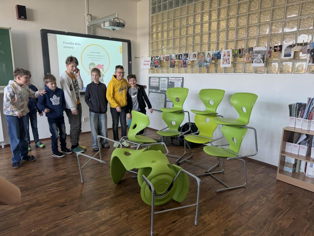 V pondělí 23. března se páťáci věnovali v Kiva lekci tématu Šikana a kolektiv. Zopakovali si, jaké role může mít jednotlivec při šikaně. Dozvěděli se, jak se jednotlivci v rolích chovají a jak se cítí. Zkusili si namodelovat šikanu při hře za pomoci židlí a okomentovat ji.
