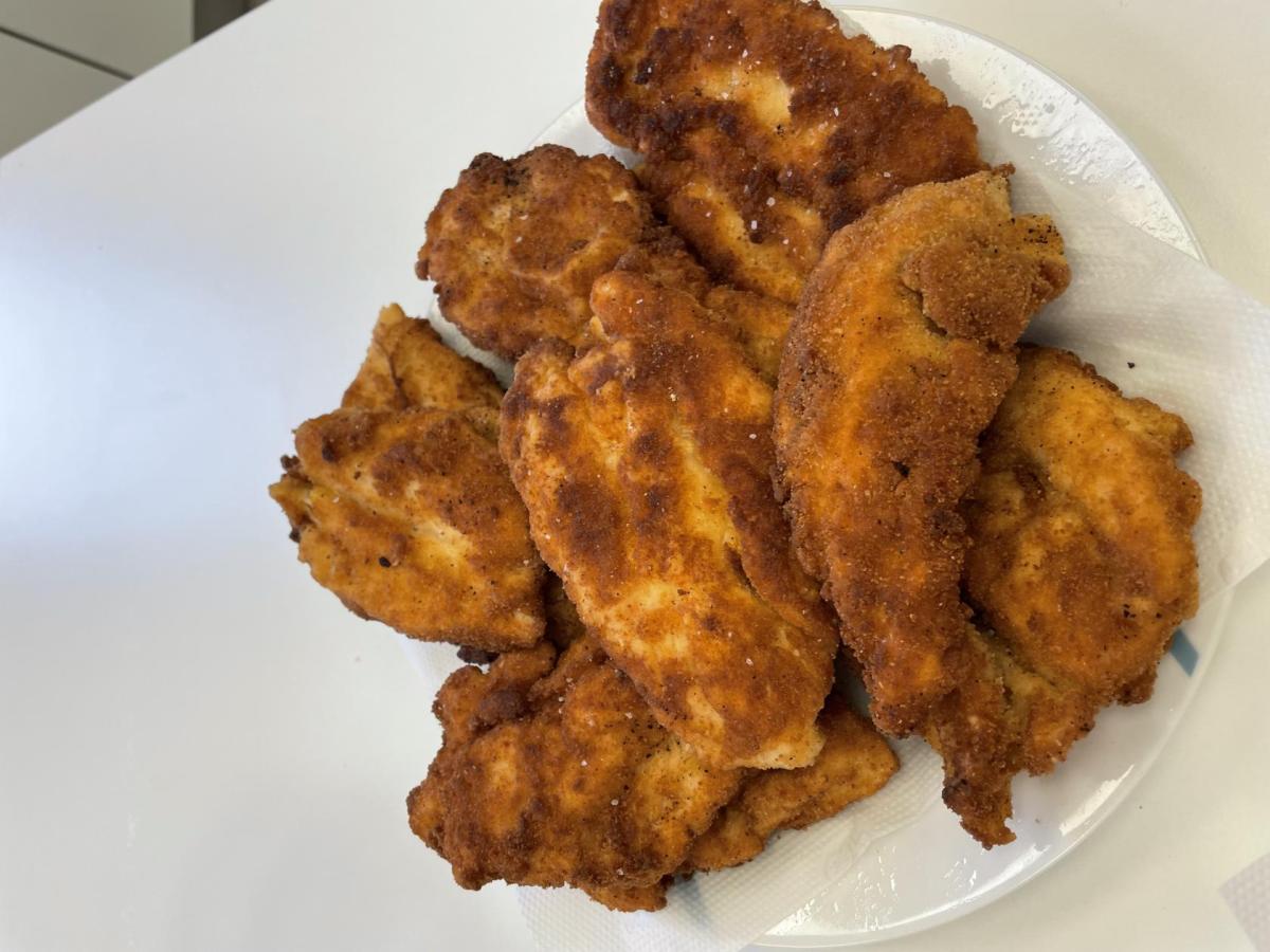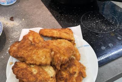 menu: kuřecí řízky, vařené brambory, piškot a kynuté housky - Kaiserky
