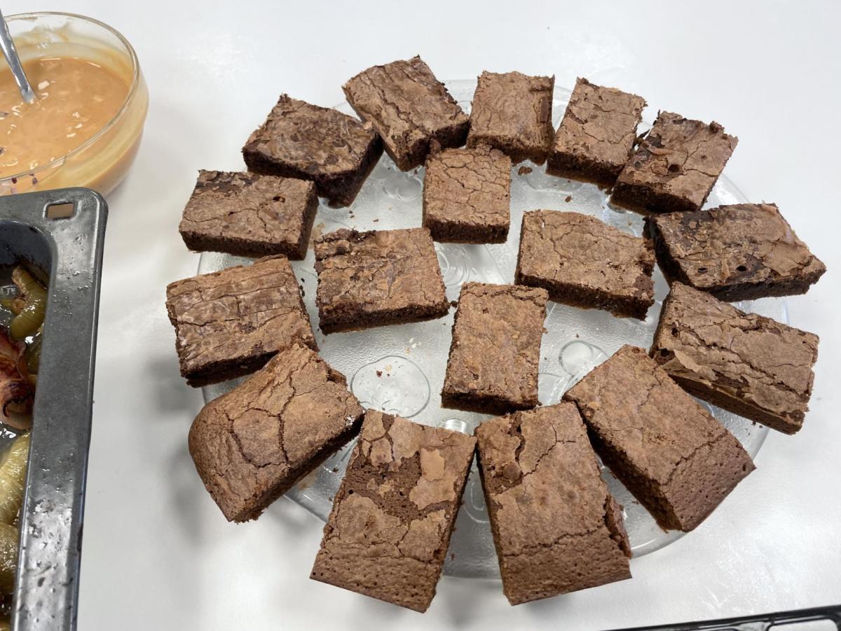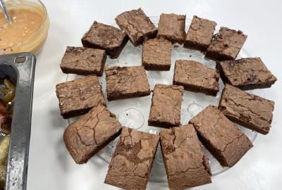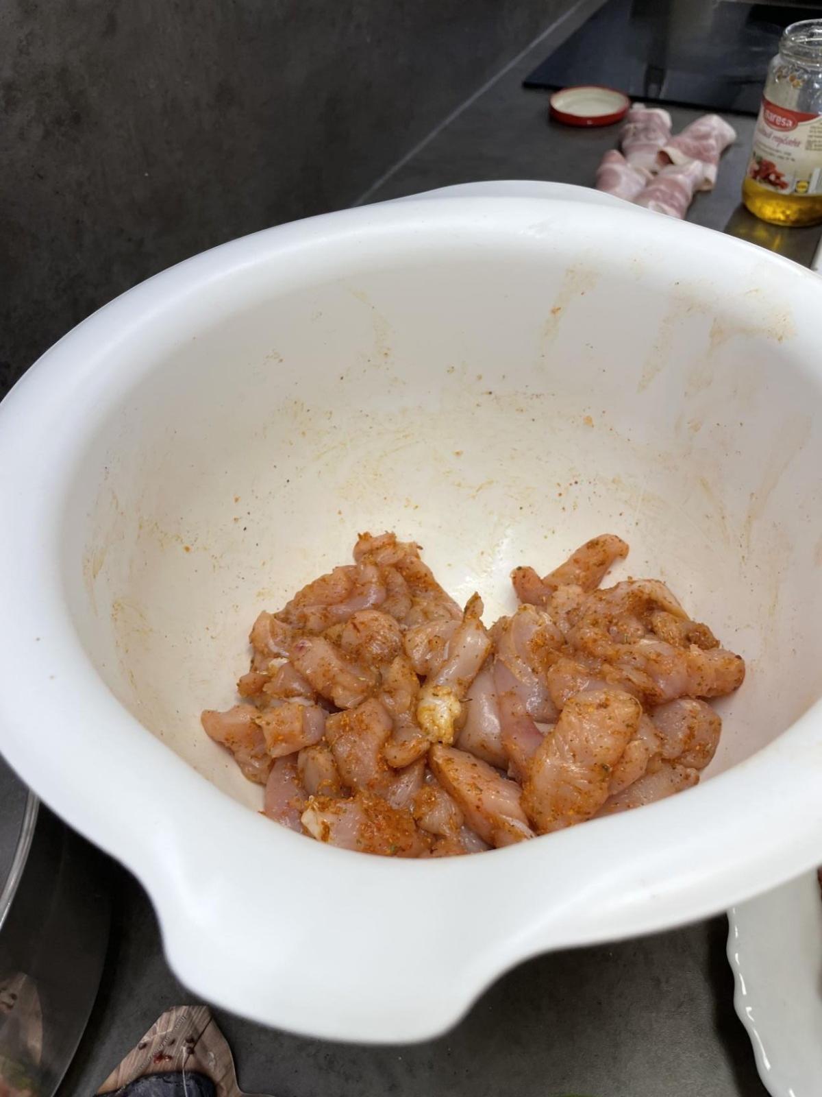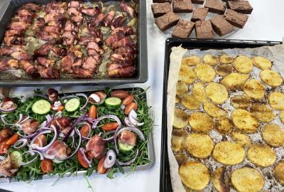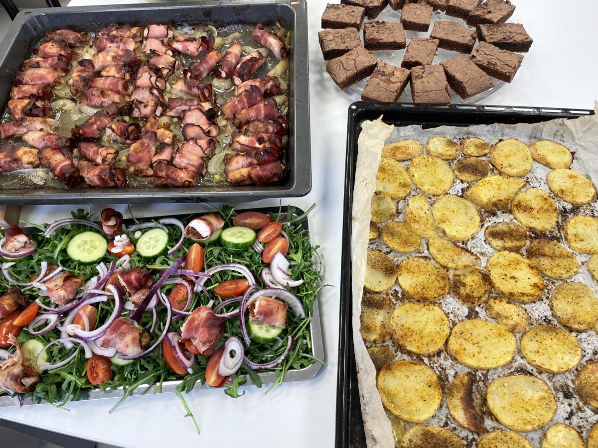 Kuřecí se sušeným rajčetem v slaninovém kabátku, americké brambory, Brownies, zeleninový salát a dva dipy...