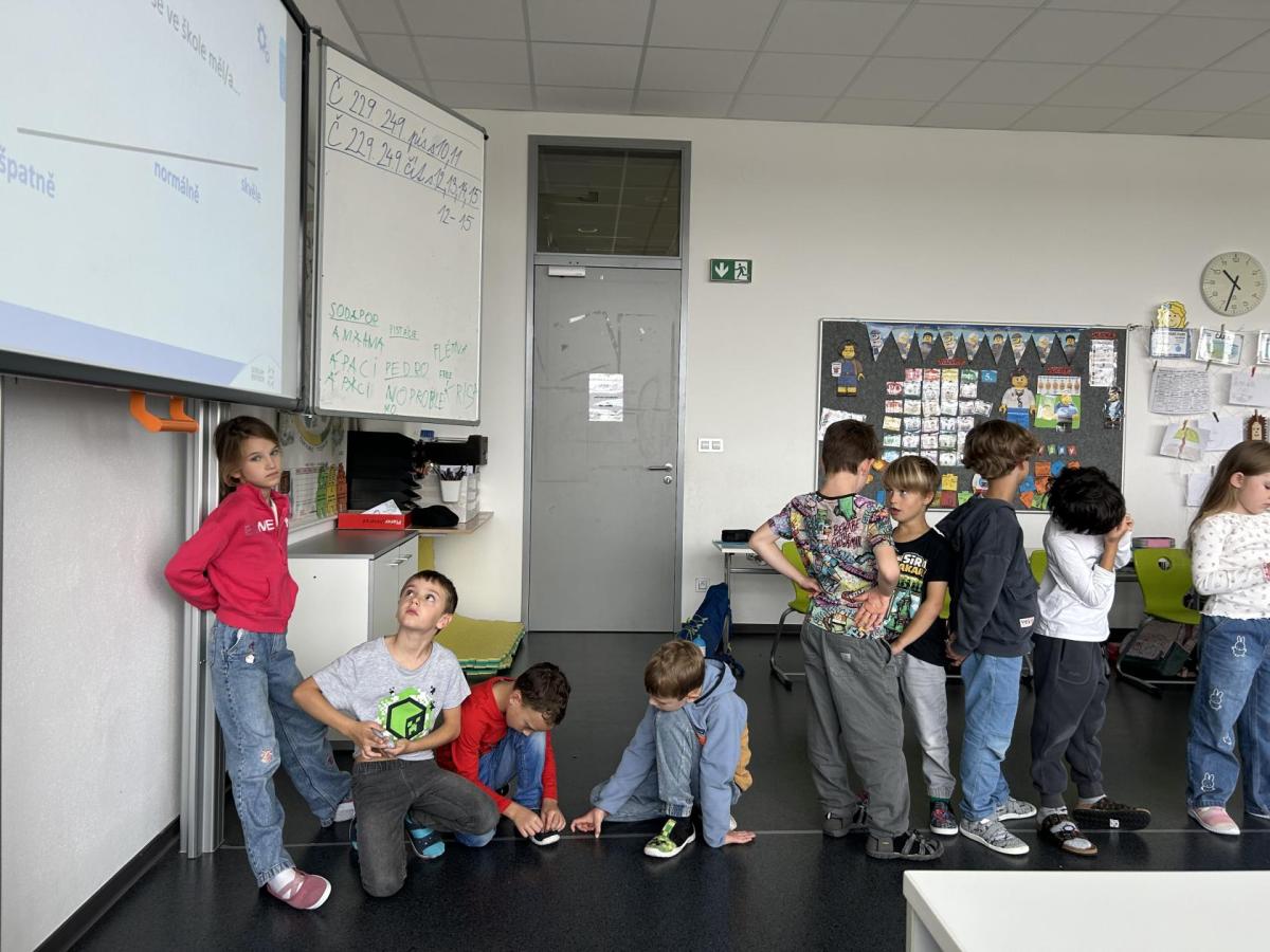 Nejprve jsme se postavili na pomyslnou čáru a hráli hru „Postav se na čáru“. Děti si porovnávaly své pocity z běžných zážitků (např. kdo se hodně/málo nasnídal, kdo měl dobrý/špatný týden…). Byla to aktivita, která děti hned vtáhla.