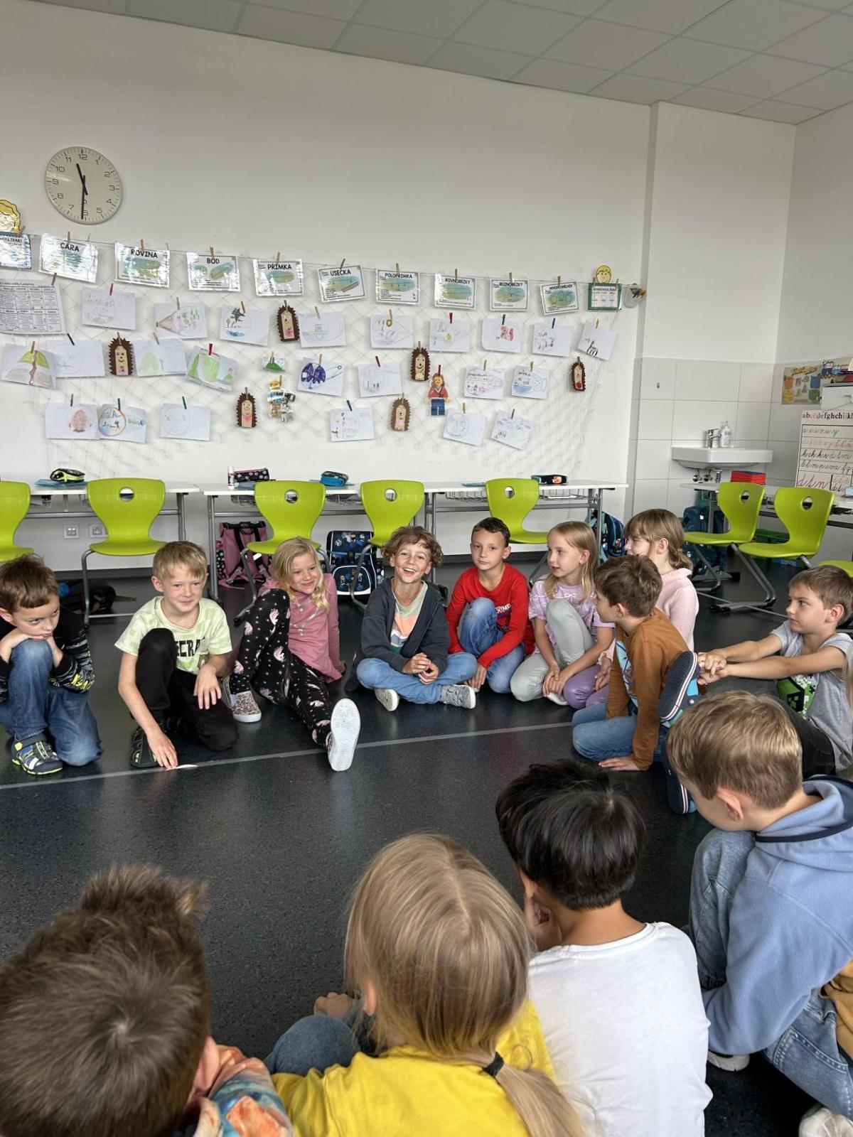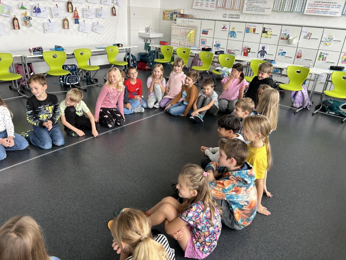 Pro tuto hodinu jsme si lavice uspořádali do tvaru písmene U, takže jsme měli uprostřed dostatek místa na hry a společnou práci.