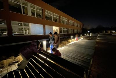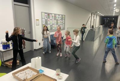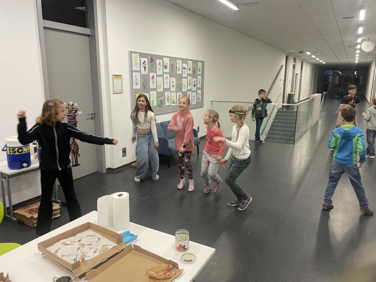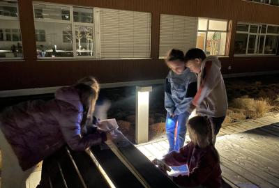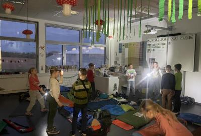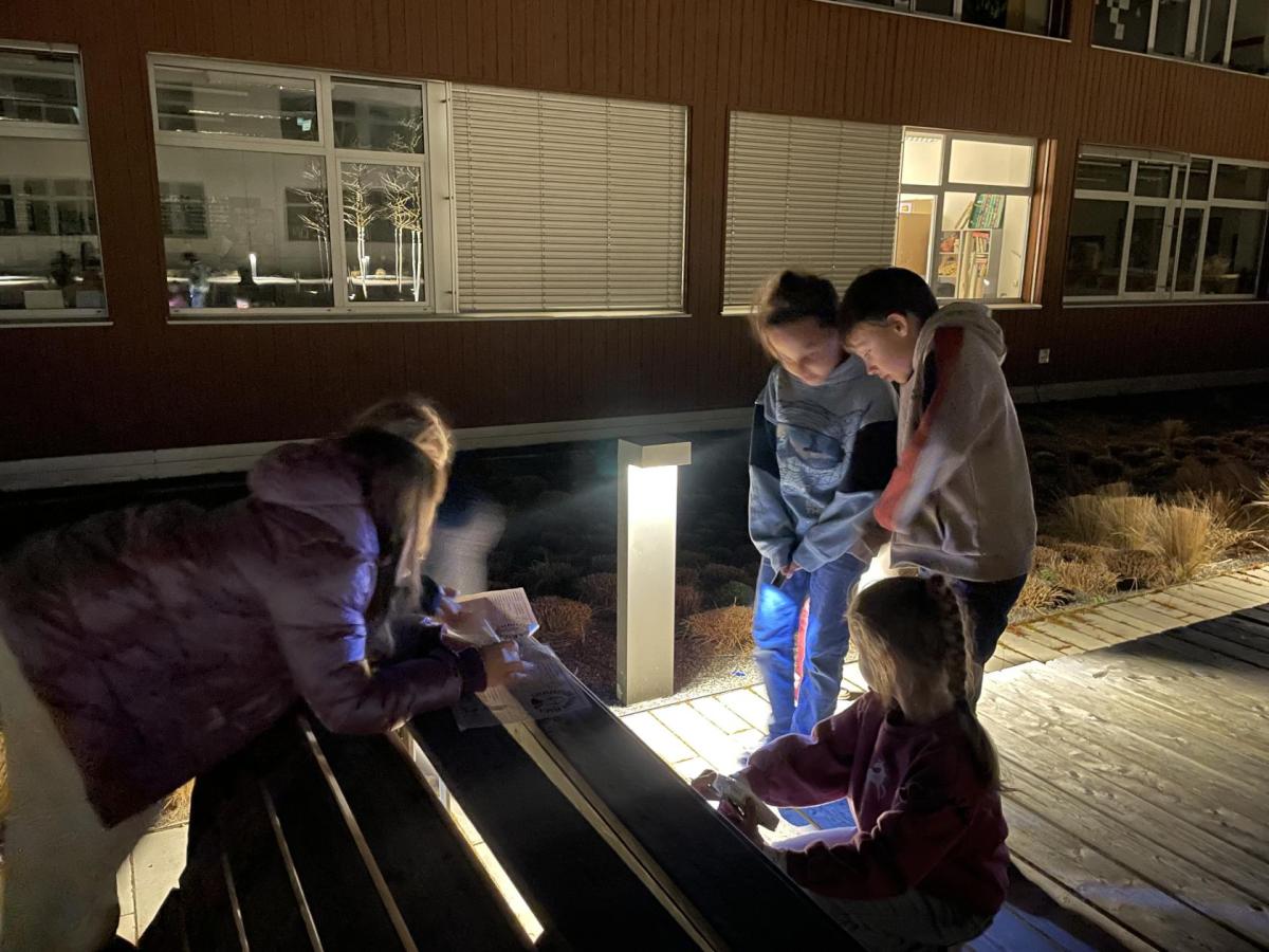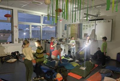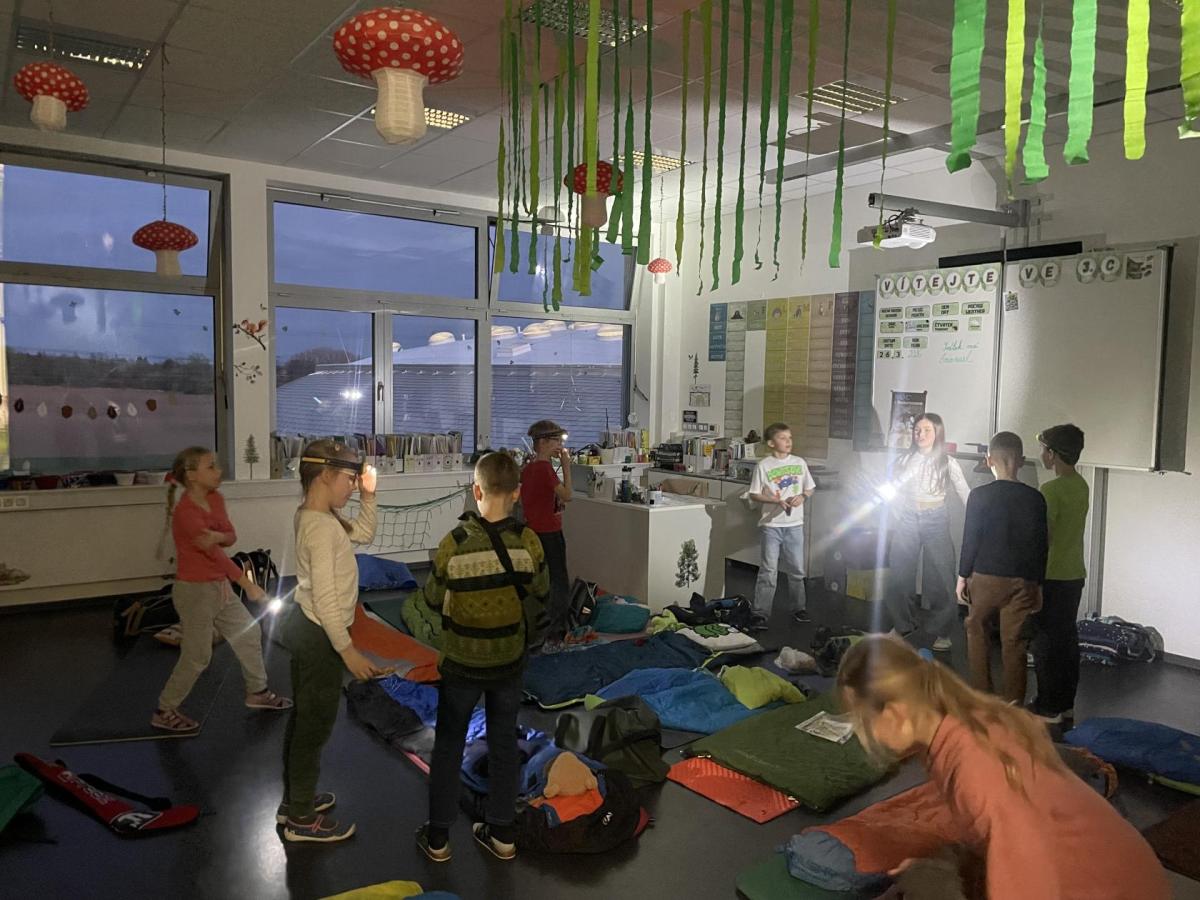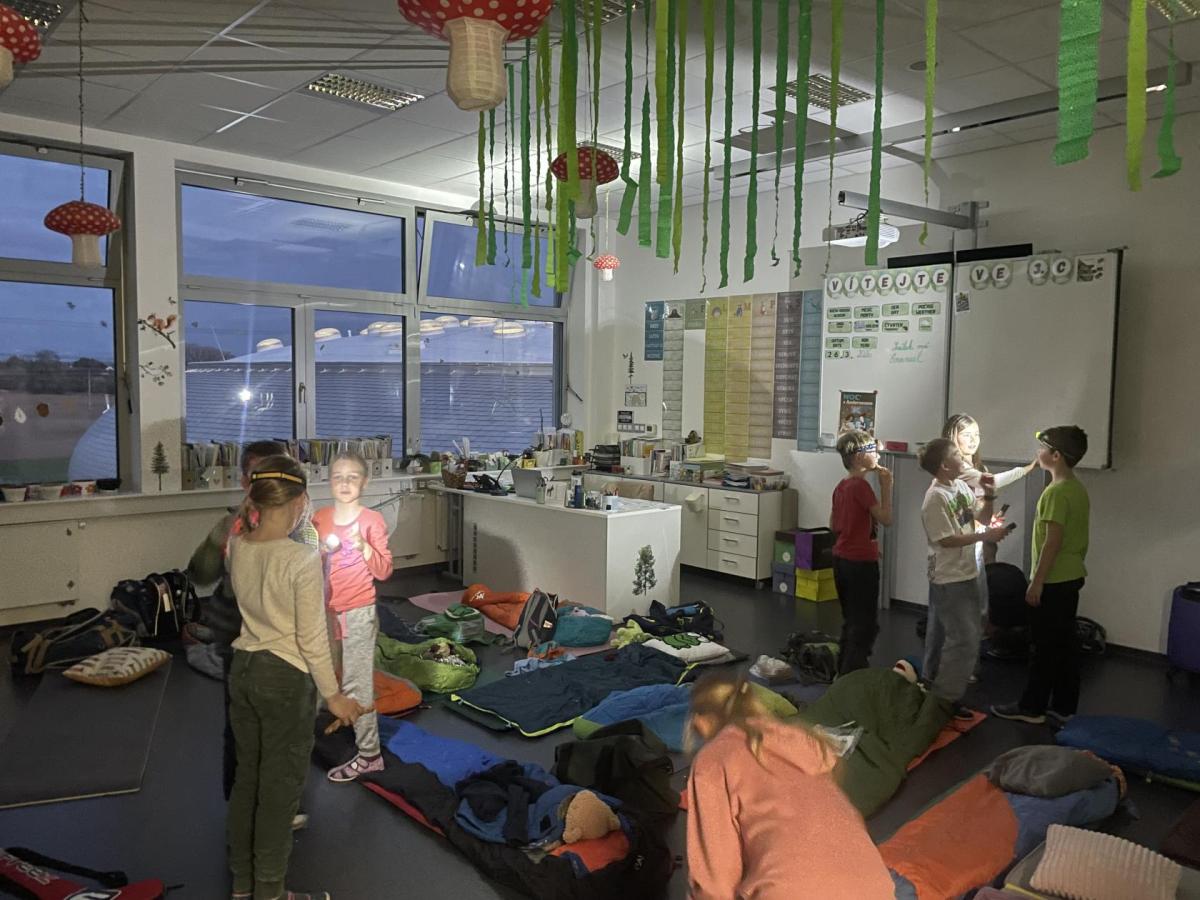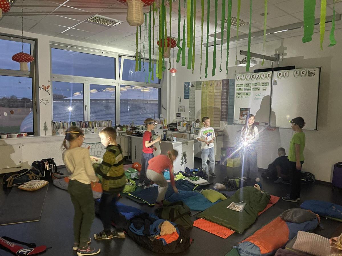 Kolem deváté hodiny večerní jsme se vrátili zpět do školy, kde na děti čekalo další dobrodružství. Po setmění se vydaly na bojovku – pouze s baterkami hledaly patnáct stanovišť rozmístěných po škole i jejím okolí. Úkoly plnily venku, v šatnách, jídelně i dalších prostorách školy. Vše zvládly s nadšením a velkou odvahou.