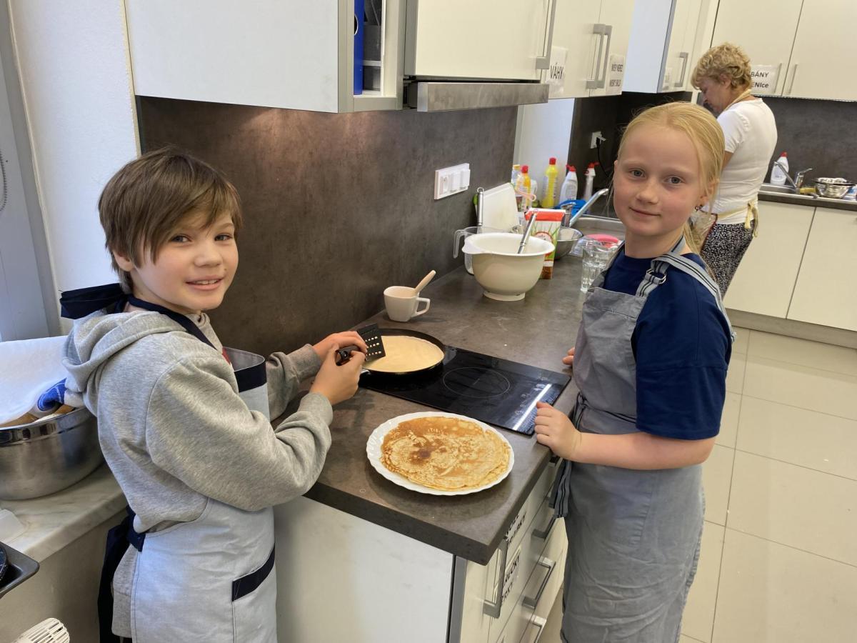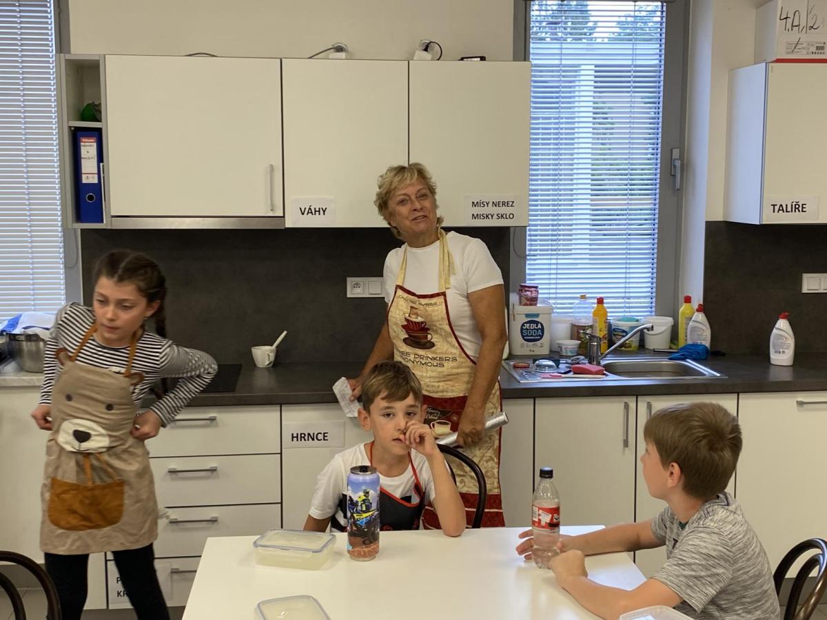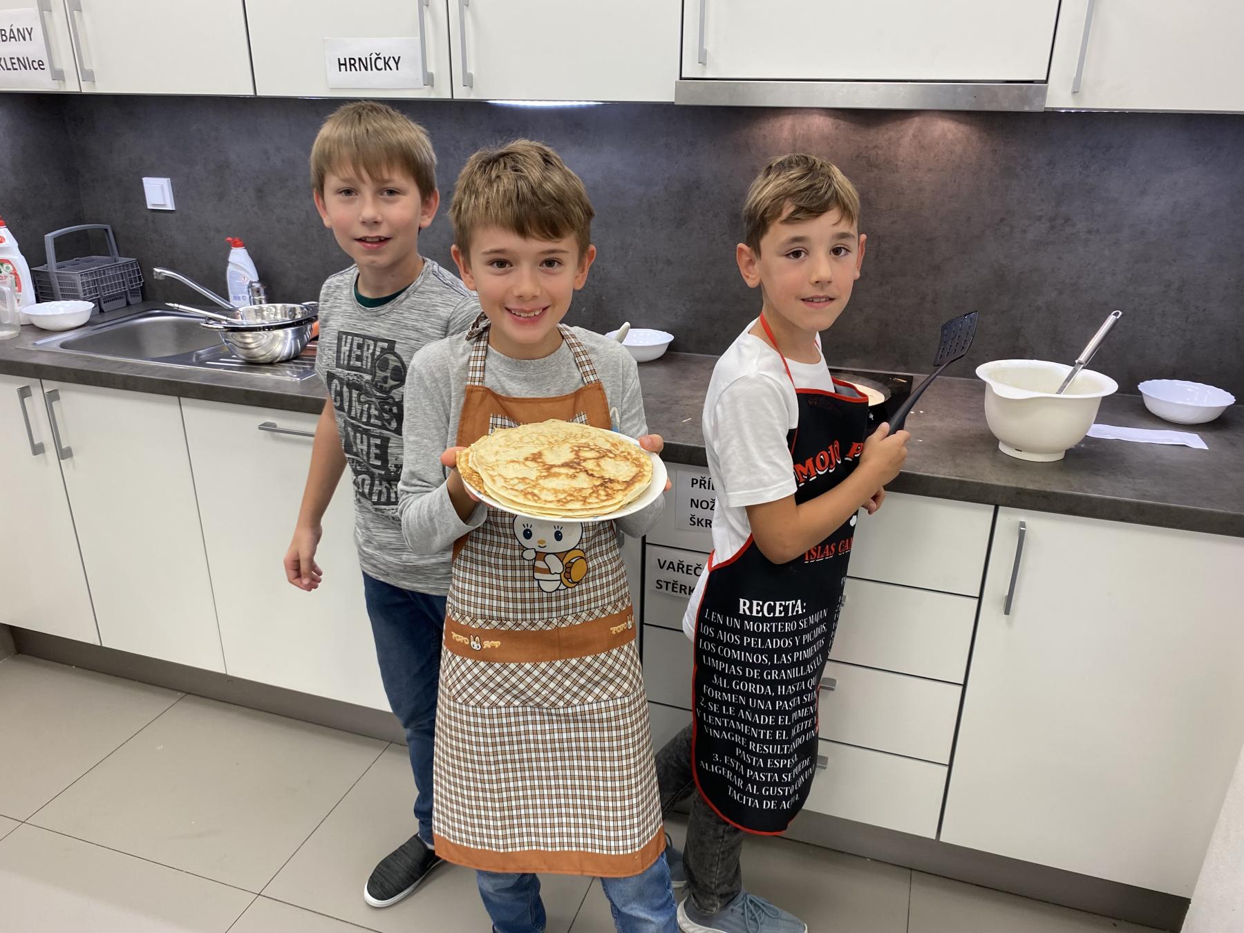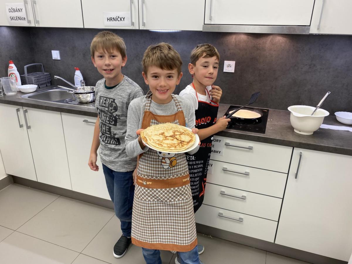 Letos nás čtvrteční odpoledne opravdu moc baví. Nejprve nás pan učitel Šimek pozve do počítačové učebny, kde se pod jeho vedením učíme první důležité aktivity na počítačích. Už jsme se naučili pracovat s programem Bakaláři, kam nám letos všichni učitelé zapisují známky, domácí úkoly, učivo a další požadavky k jednotlivým předmětům. Po informatice se rozdělíme na dvě poloviny a už se těšíme na pana učitele Honzu, který si nás odvede do technické dílny. Tu už známe z loňského roku, takže víme, že nás zde u pracovních "ponků" čekají svěráky, vrtačky, kladívka, pilky... a další pomůcky potřebné k výrobě předmětů ze dřeva i kovu. Prvním rokem chodíme do kuchyňky s paní učitelkou Strnadovou. Dnešní hodina pod jejím vedením patřila palačinkám. Mouka, mléko, vajíčka a pěkně pečlivě vyšlehat do hladkého těsta. Vůně palačinek přilákala i naši paní učitelku. A protože je vážně na sladké, dostala od nás jednu voňavou ochutnávku! Paní učitelka říkala, že jsme moc šikovní a palačinku slupla jedna dvě. V pololetí se obě skupinky vymění, aby si všichni vyzkoušeli kuchyňku i dílnu. Tak se těšíme, co nás čeká za týden.