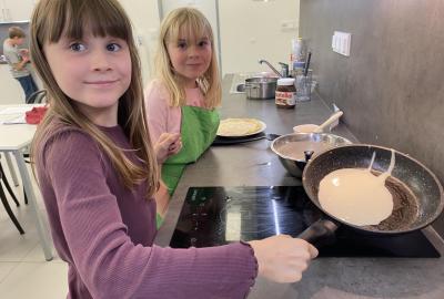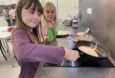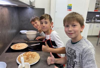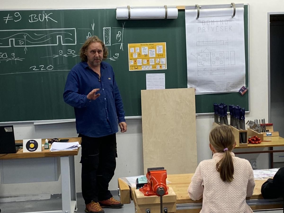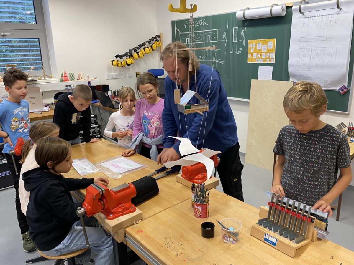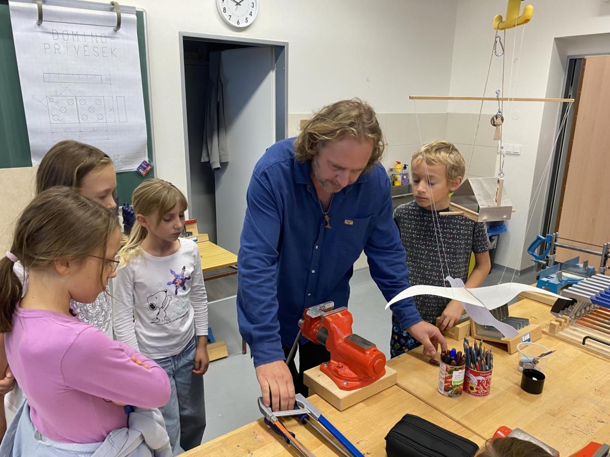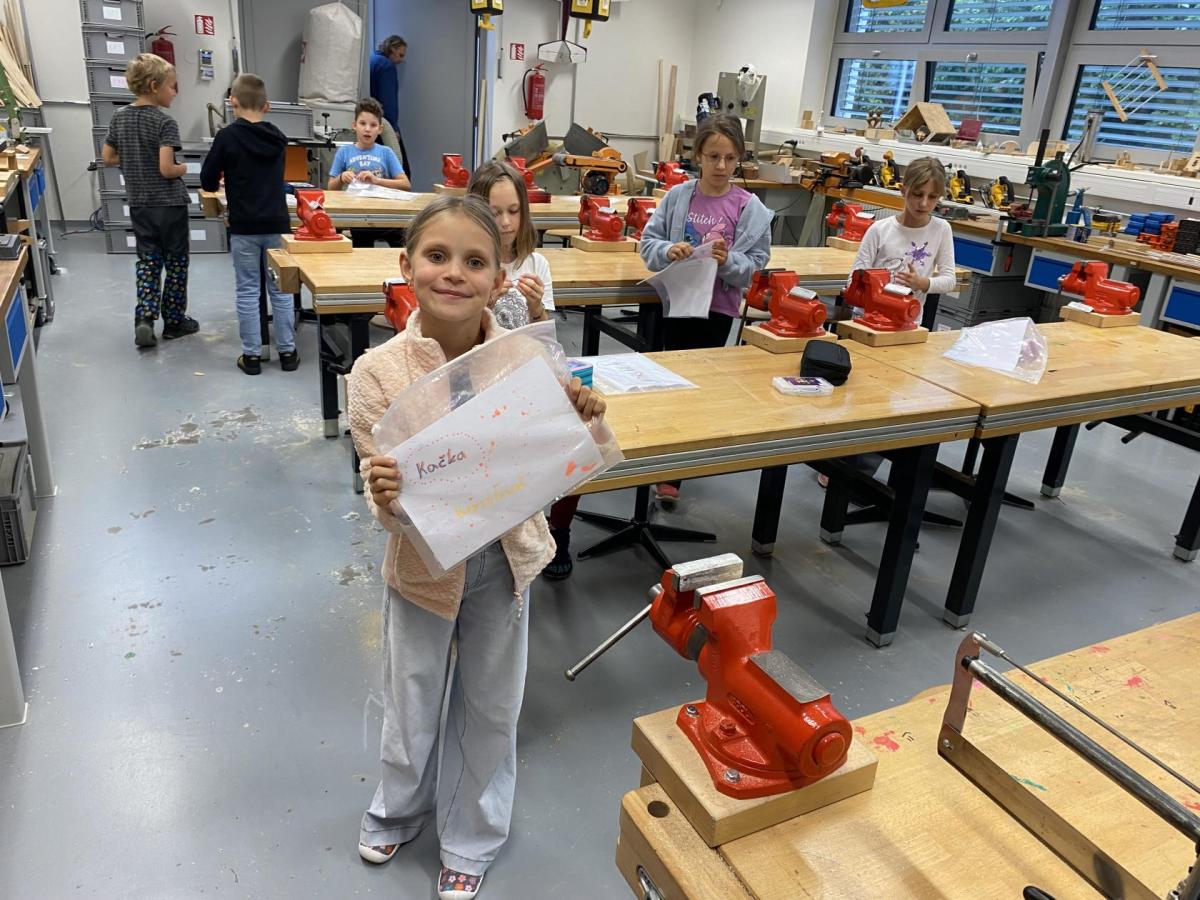 Letos nás čtvrteční odpoledne opravdu moc baví. Nejprve nás pan učitel Šimek pozve do počítačové učebny, kde se pod jeho vedením učíme první důležité aktivity na počítačích. Už jsme se naučili pracovat s programem Bakaláři, kam nám letos všichni učitelé zapisují známky, domácí úkoly, učivo a další požadavky k jednotlivým předmětům. Po informatice se rozdělíme na dvě poloviny a už se těšíme na pana učitele Honzu, který si nás odvede do technické dílny. Tu už známe z loňského roku, takže víme, že nás zde u pracovních "ponků" čekají svěráky, vrtačky, kladívka, pilky... a další pomůcky potřebné k výrobě předmětů ze dřeva i kovu. Prvním rokem chodíme do kuchyňky s paní učitelkou Strnadovou. Dnešní hodina pod jejím vedením patřila palačinkám. Mouka, mléko, vajíčka a pěkně pečlivě vyšlehat do hladkého těsta. Vůně palačinek přilákala i naši paní učitelku. A protože je vážně na sladké, dostala od nás jednu voňavou ochutnávku! Paní učitelka říkala, že jsme moc šikovní a palačinku slupla jedna dvě. V pololetí se obě skupinky vymění, aby si všichni vyzkoušeli kuchyňku i dílnu. Tak se těšíme, co nás čeká za týden.