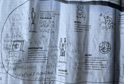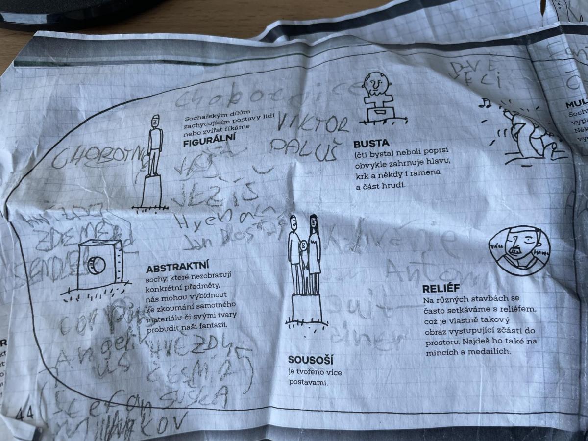 Zajímavé informace o sochách se žáci dozvěděli přímo na místě. Zjistili, že za dvě vyučovací hodiny včetně přestávky, není možné celou dolnobřežanskou galerii pod širým nebem dostatečně prohlédnout. Svou spolupráci zaznamenali na pracovní listy z úžasné knihy "Ahoj socho: Městem s otevřenýma očima" od autorek M. Matysové a L. Štůlové Vobořilové, vydané GHMP 2018. "A proč jsou ve městě sochy?" jim pomohli pochopit dva významní sochaři ve stejnojmenném dokumentu ČT z cyklu Labyrint umění. Obojí je určeno spíše mladším dětem, ale sedmákům to nevadilo :-) Už se těší na vlastní tvorbu!
