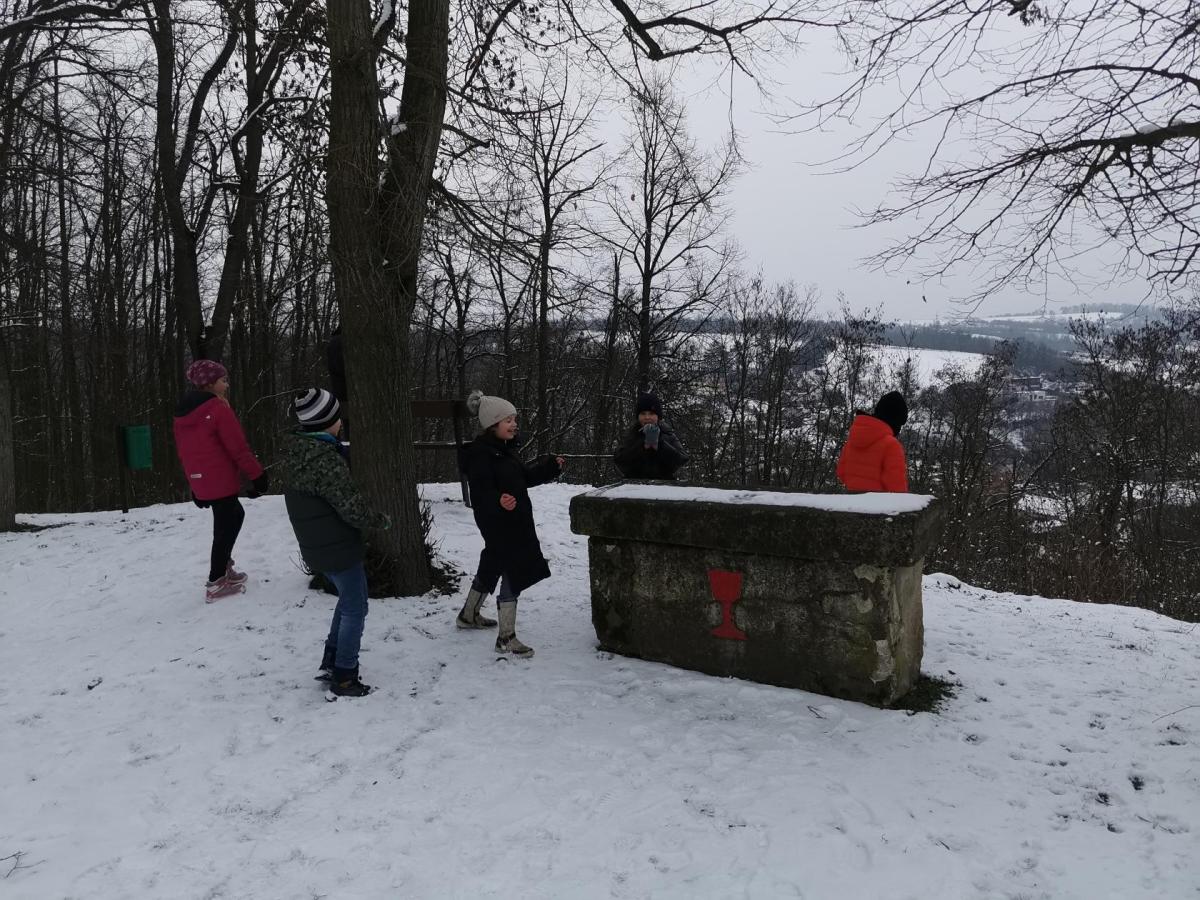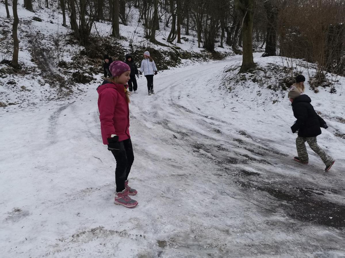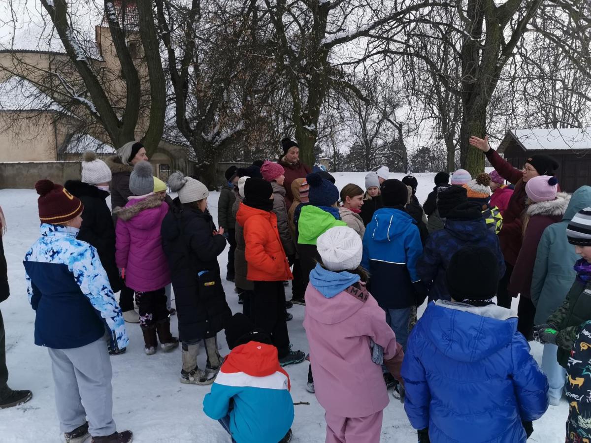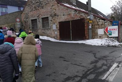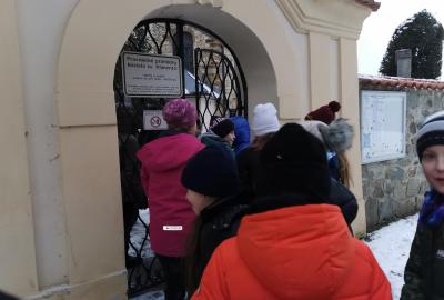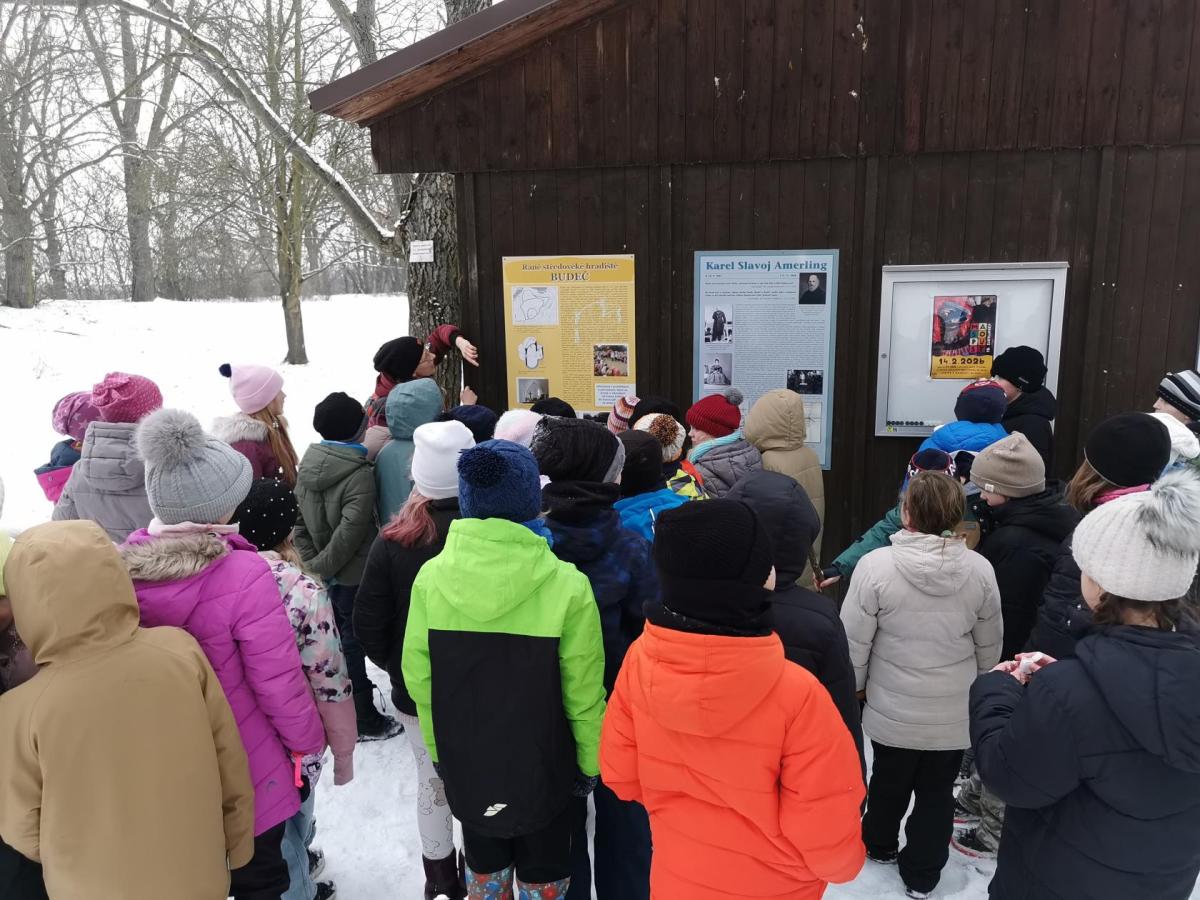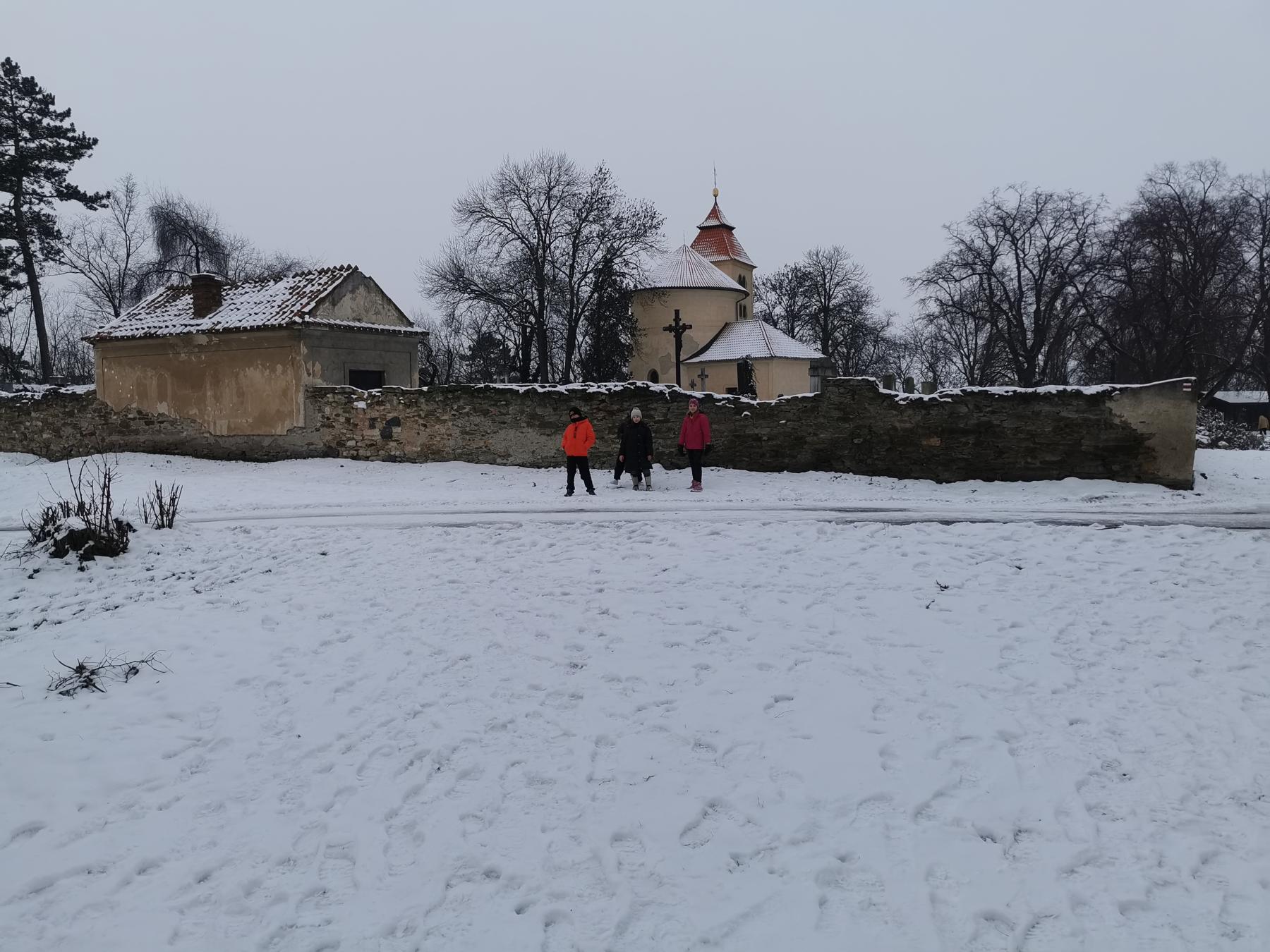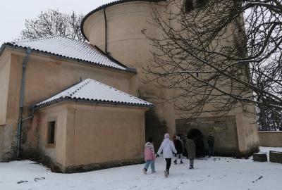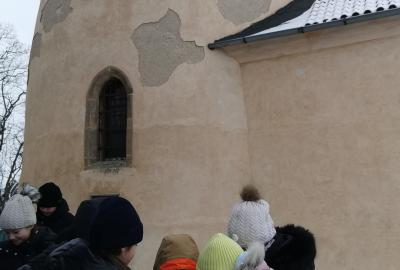 Poté jsme pokračovali na Budeč. Po červené turistické značce jsme se vydali po klouzavé ledovce asi 1 kilometr k rotundě. Paní průvodkyně nám nejdříve vyprávěla o tom, že Budeč je možná ještě starší než Levý Hradec.