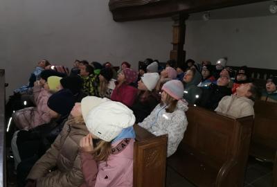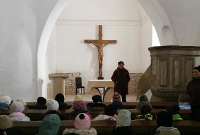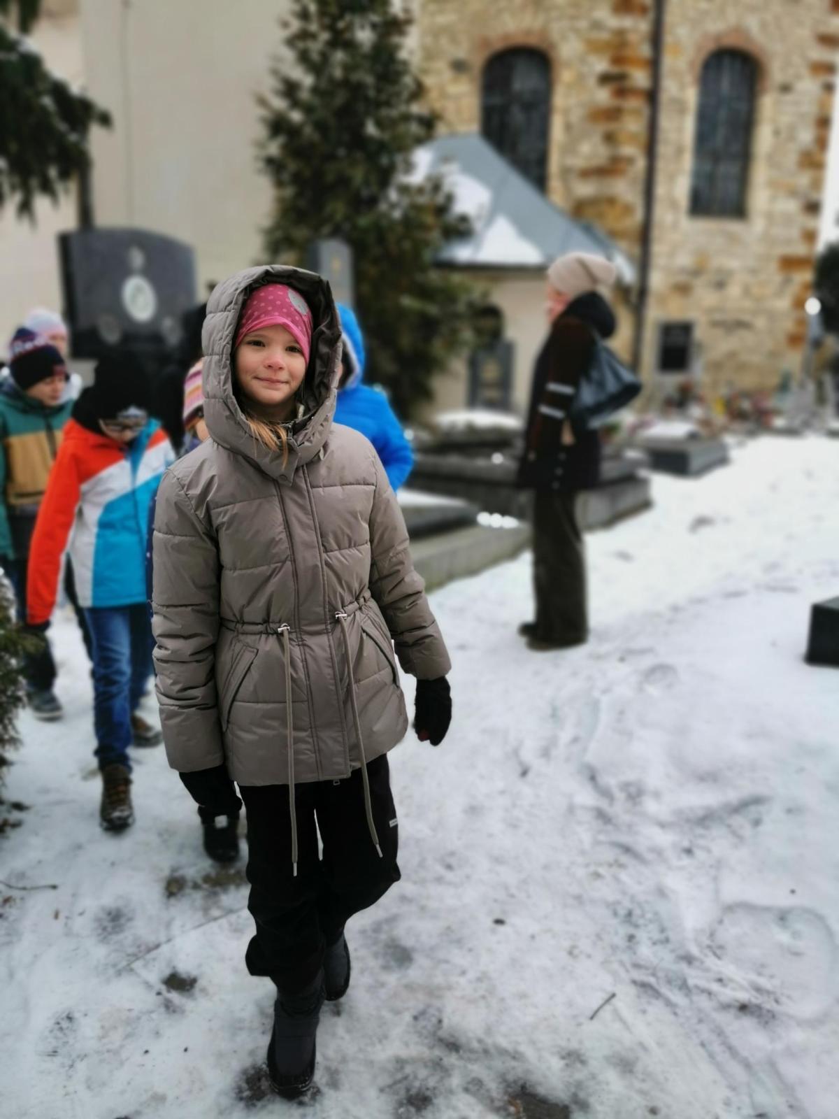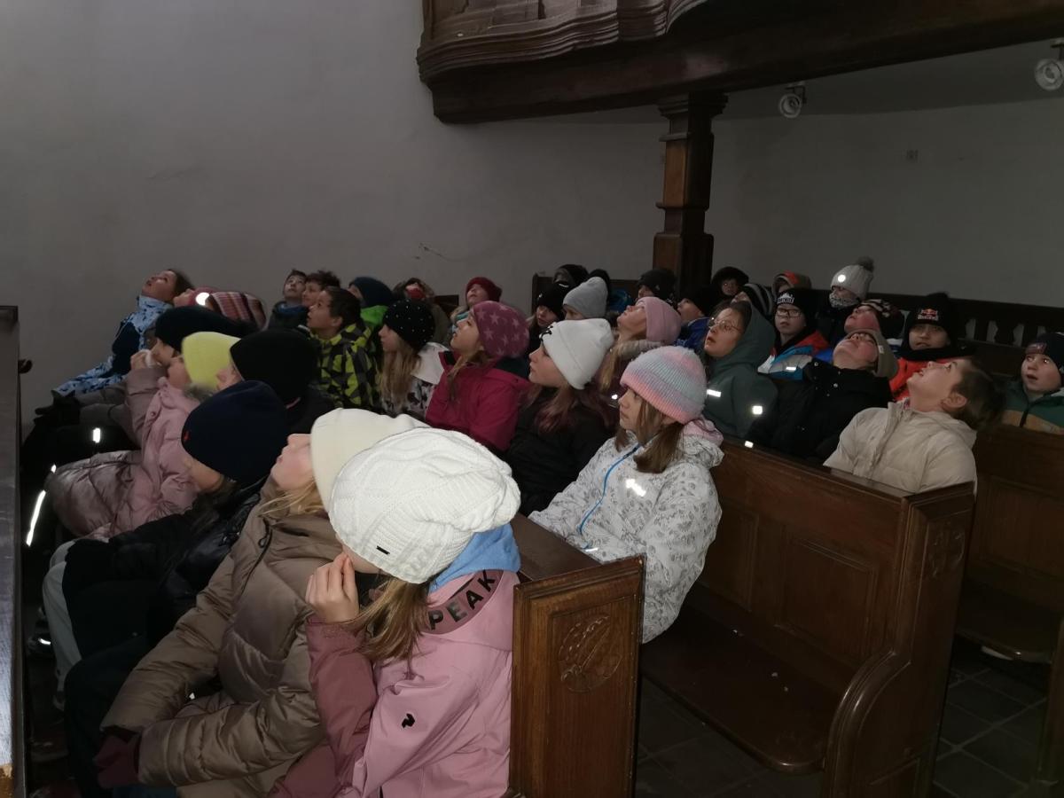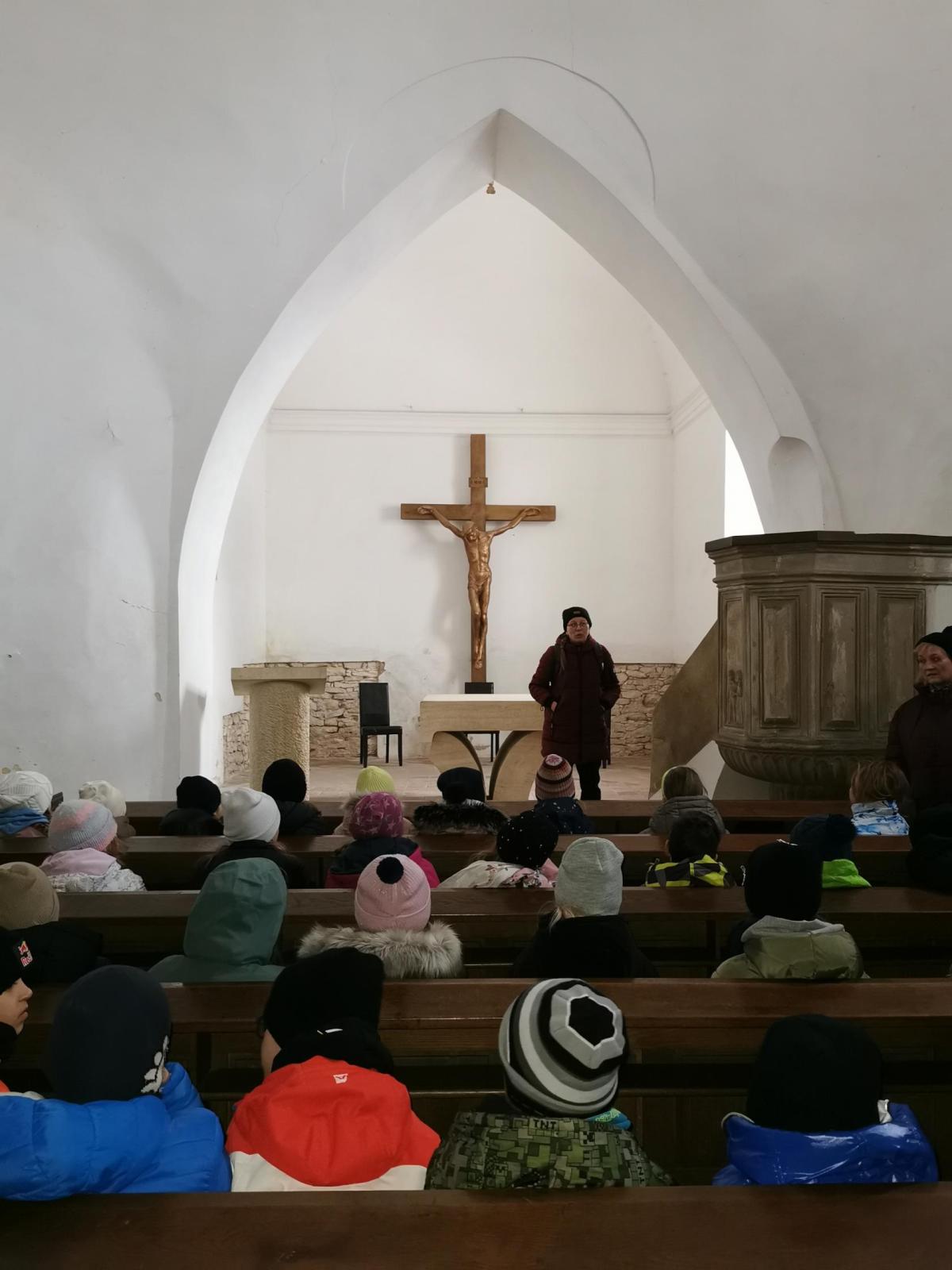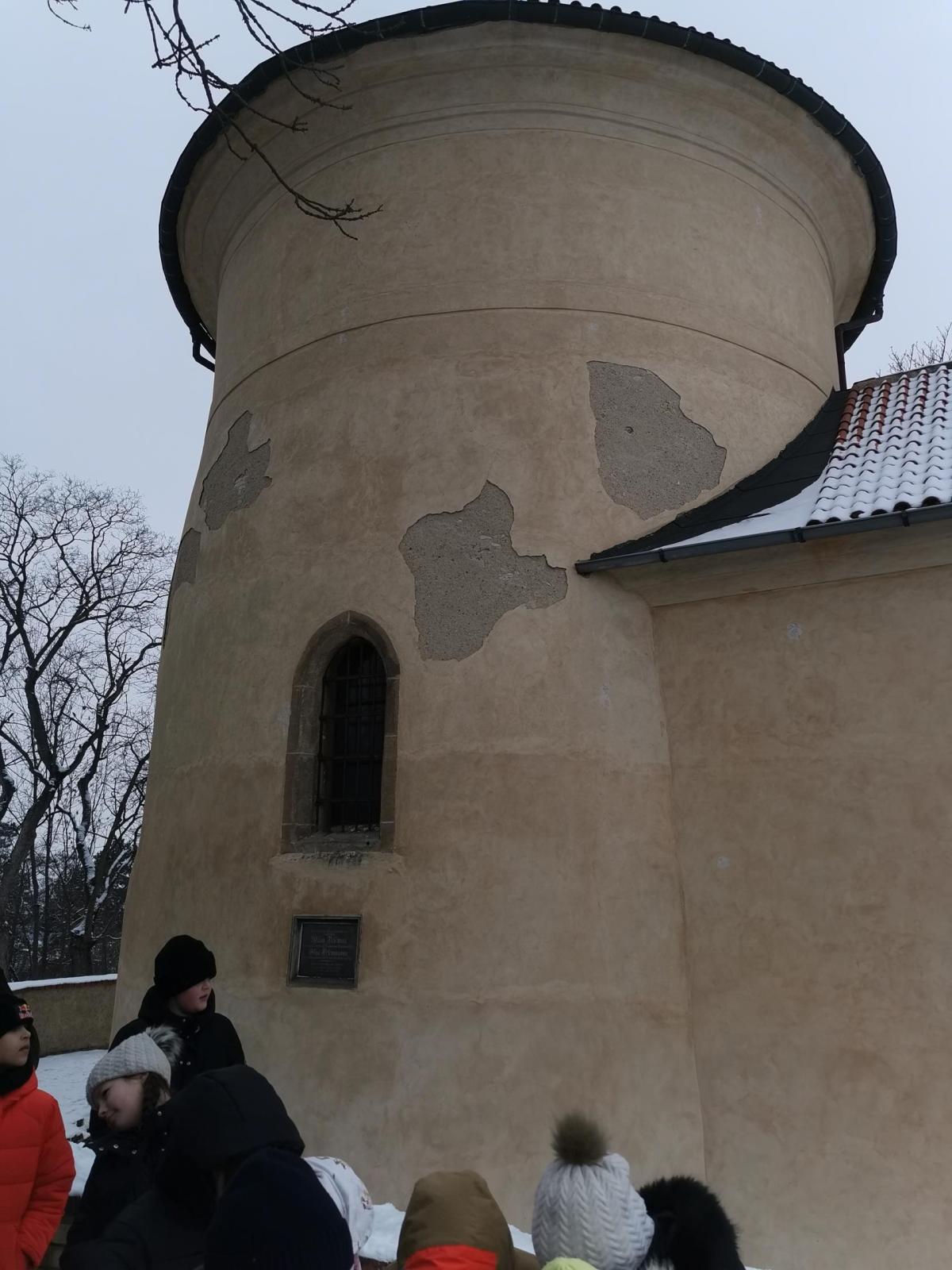 Poté jsme se přesunuli k informačním cedulím. Paní průvodkyně vyprávěla velmi poutavě, ale byla velká zima – skoro jako ve středověku. Nakonec nás pozvala do Rotundy svatého Petra a Pavla. Seděli jsme v lavicích a dívali se k oltáři, kde v minulých letech probíhaly bohoslužby. Poslechli jsme si píseň, kterou nám paní průvodkyně zazpívala. I když to nebyl středověký žalm, byl to krásný závěr prohlídky.