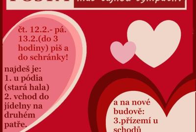 O víkendu nás čeká jeden zamilovaný svátek a školní parlament k této příležitosti připravil pro žáky valentýnské boxy, kam mohli umístit své zprávy. Všechna psaní pak parlamenťáci roztřídili a předali právoplatným majitelům. Zpráv se sešlo obrovské množství a my jsme rádi, že jsme mohli potěšit spolužáky v obaváný pátek 13.