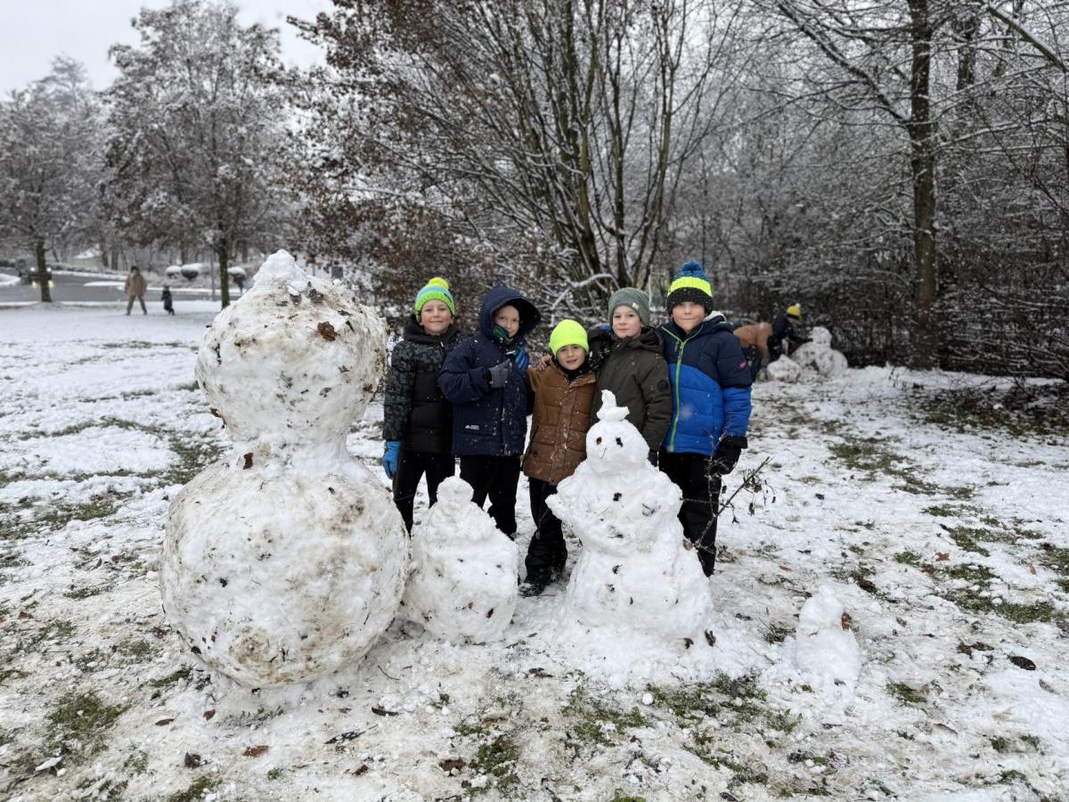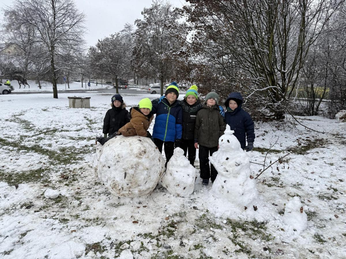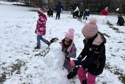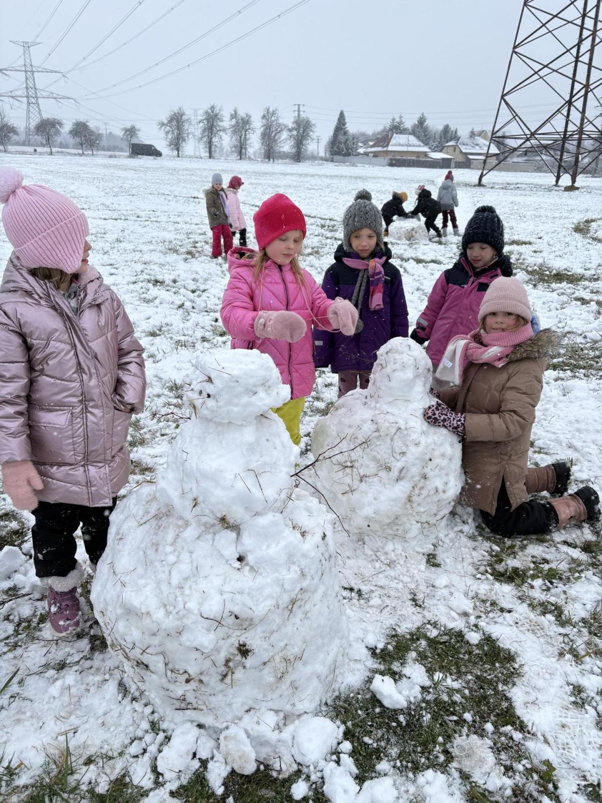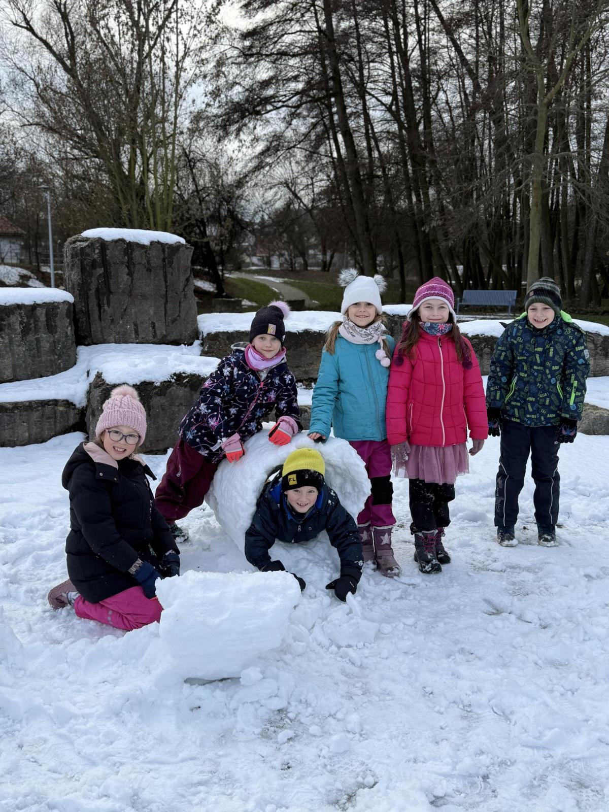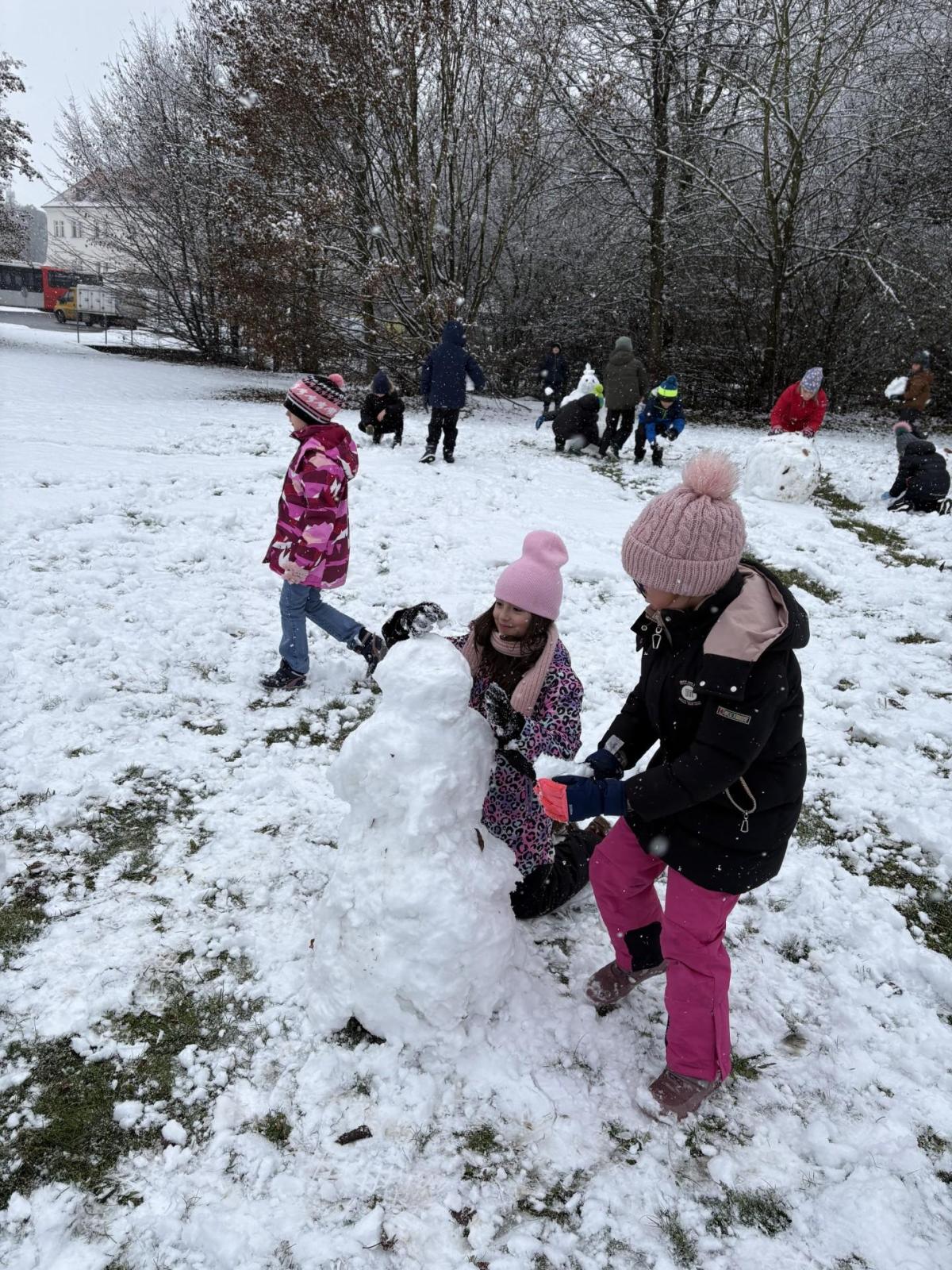 Venku si děti užívaly zimního počasí naplno: stavěly sněhuláky, bobovaly v Keltském parku, klouzaly se a bruslily na školním kluzišti.