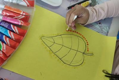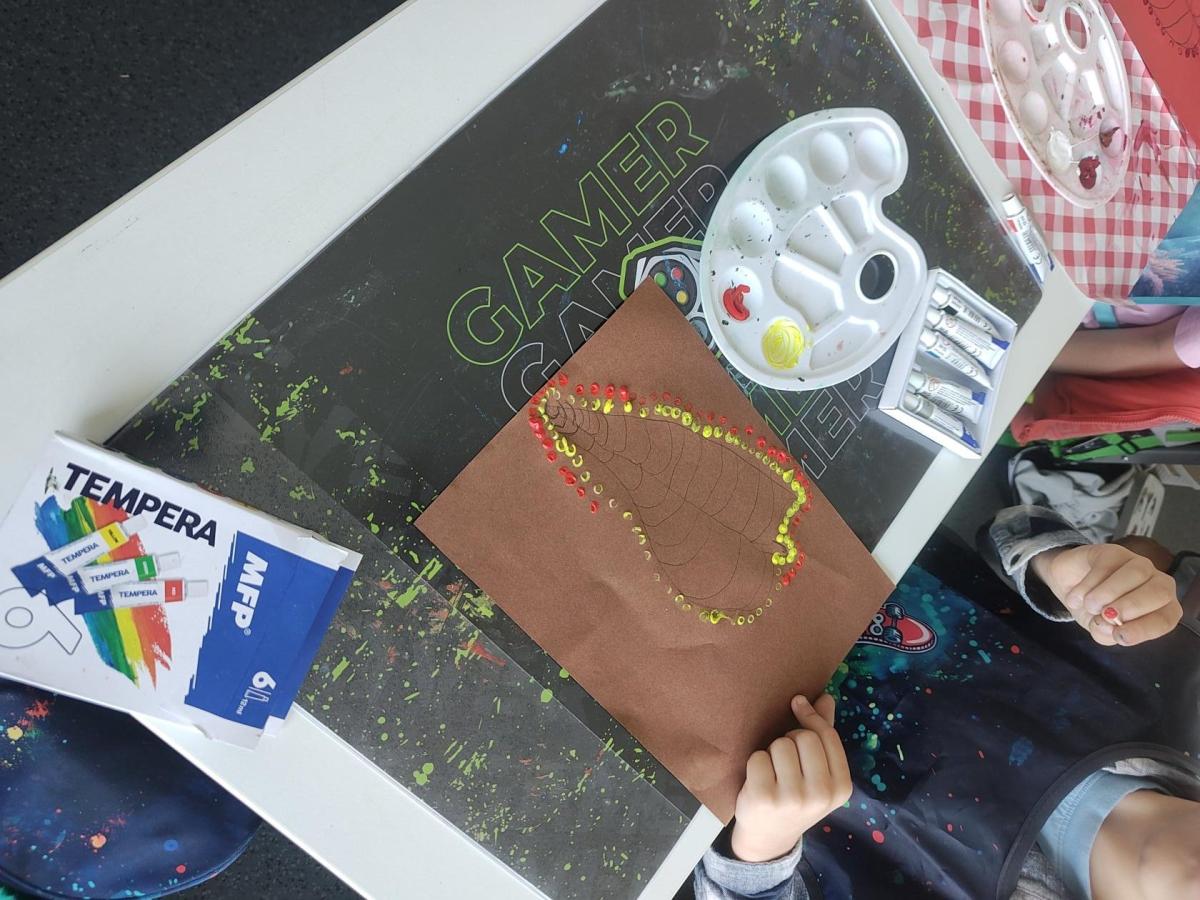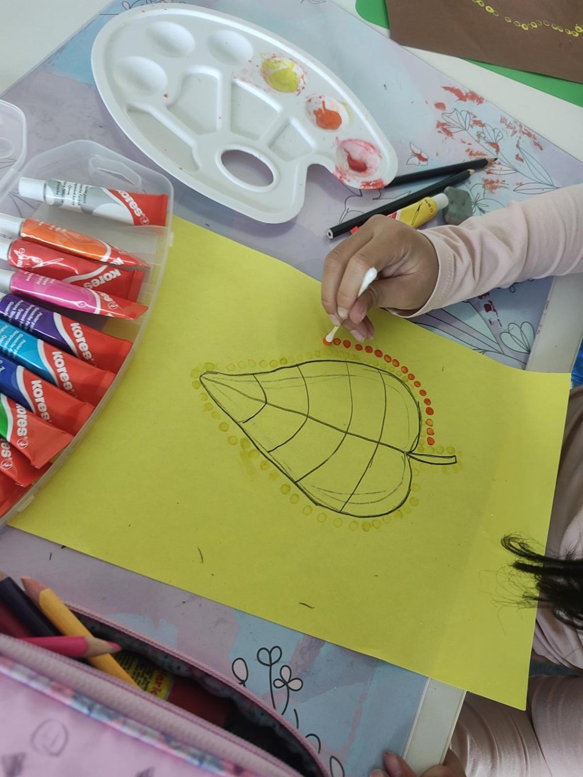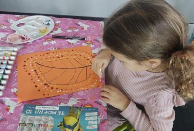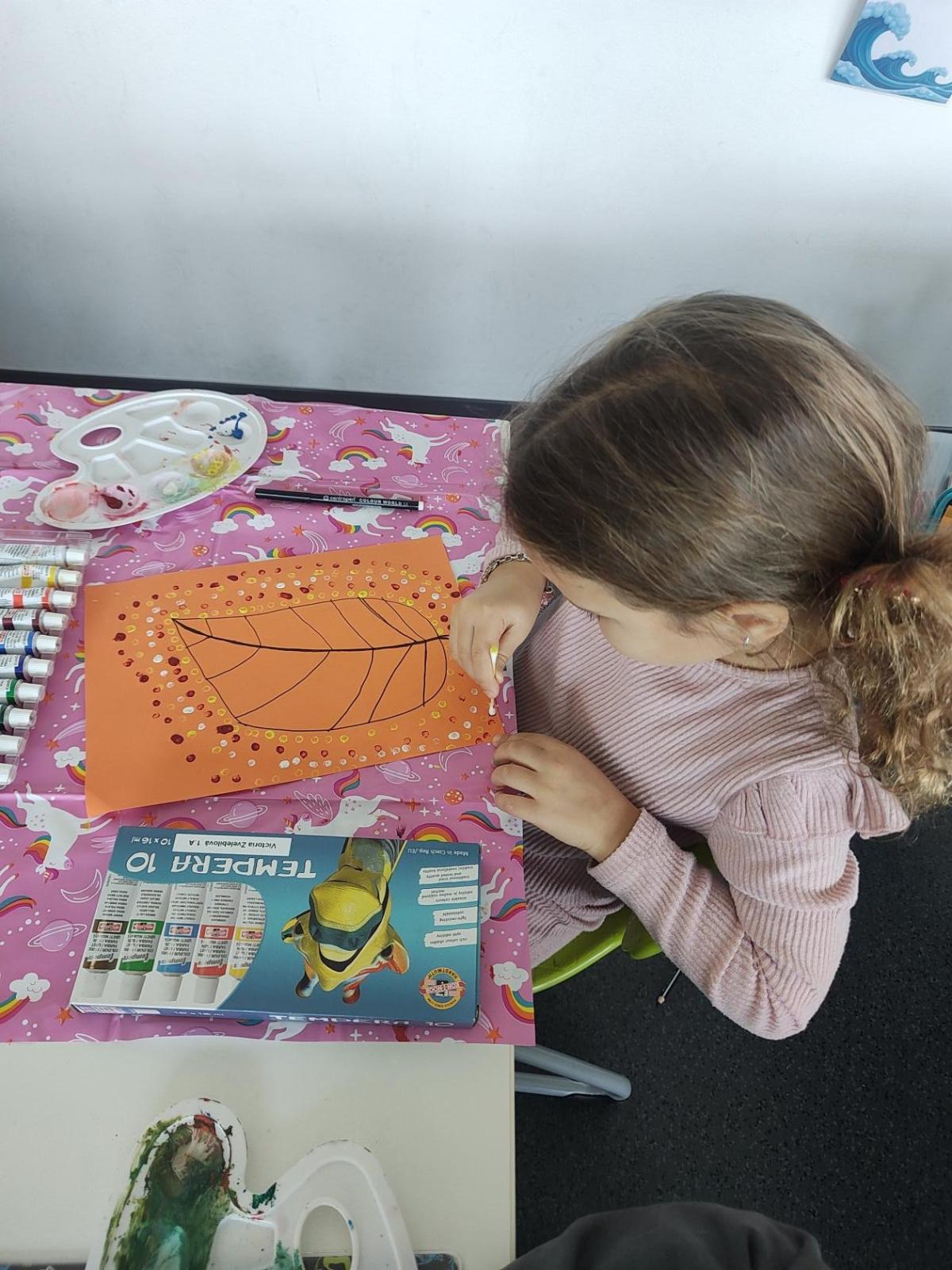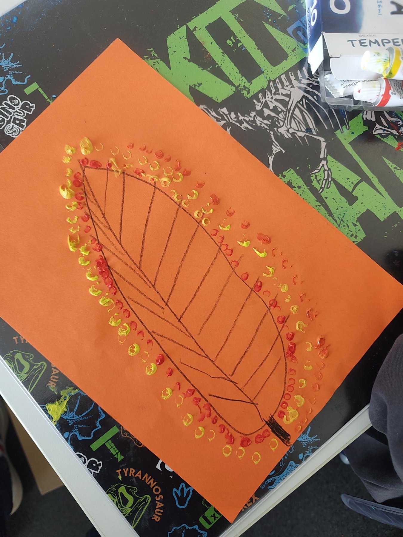 Dnes jsme si během hodiny výtvarné výchovy vyzkoušeli novou výtvarnou techniku, při které jsme kombinovali kresbu a malbu. Nejprve jsme si na barevný papír nakreslili podzimní list, a poté jsme pomocí vatových tyčinek tečkovali jeho okolí.