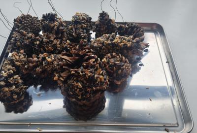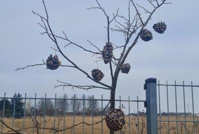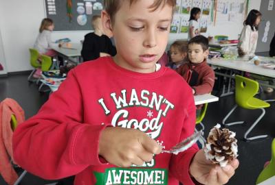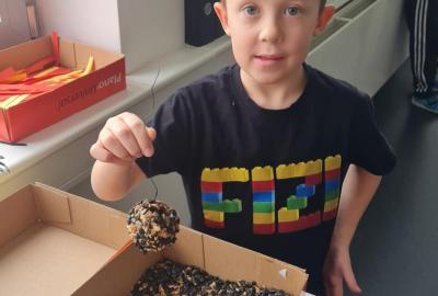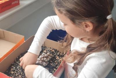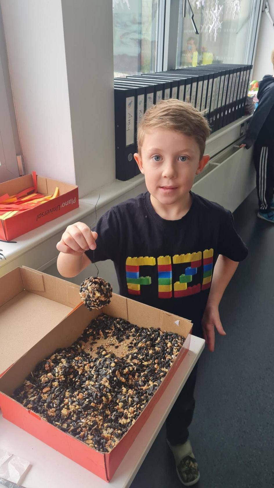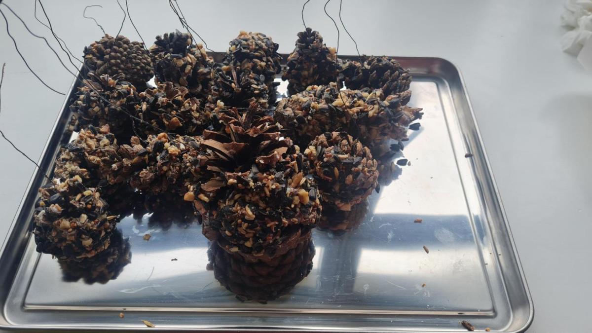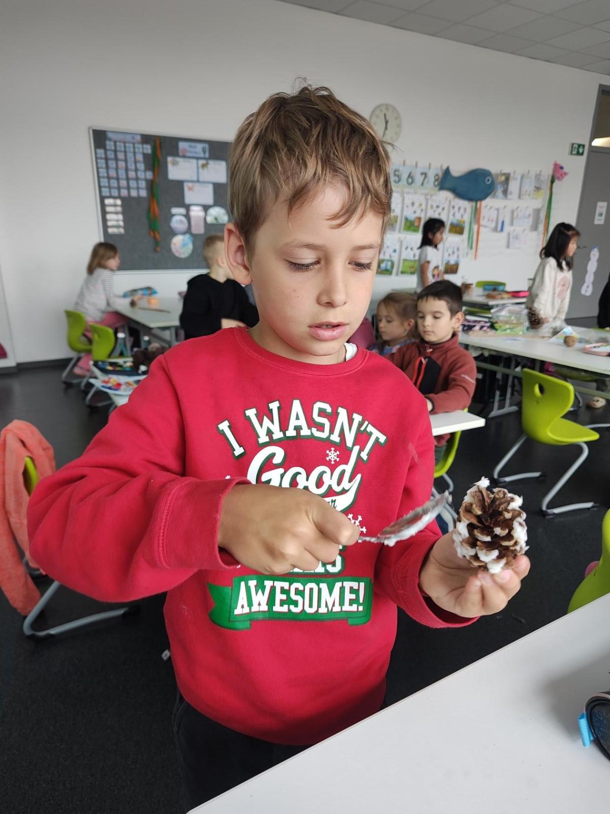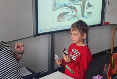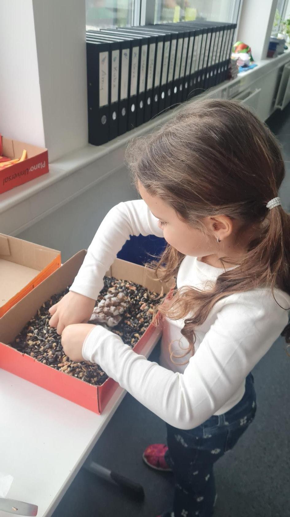 Nakonec jsme si vyrobili vlastní jednoduché krmítko – ze šišky, sádla a semínek. Společně jsme ho pověsili na plot, na který z naší třídy vidíme. Už se těšíme, až budeme ptáčky pozorovat.