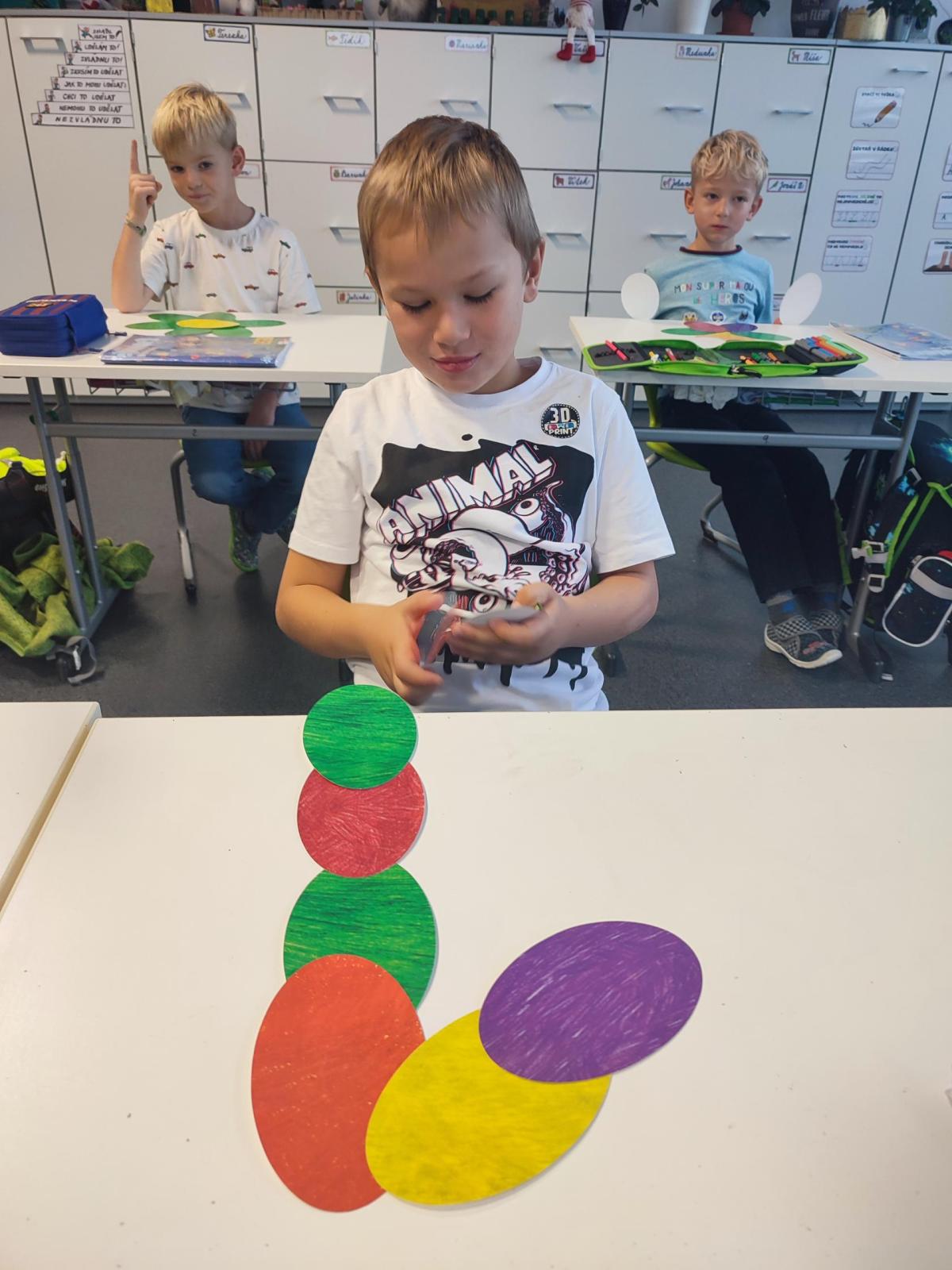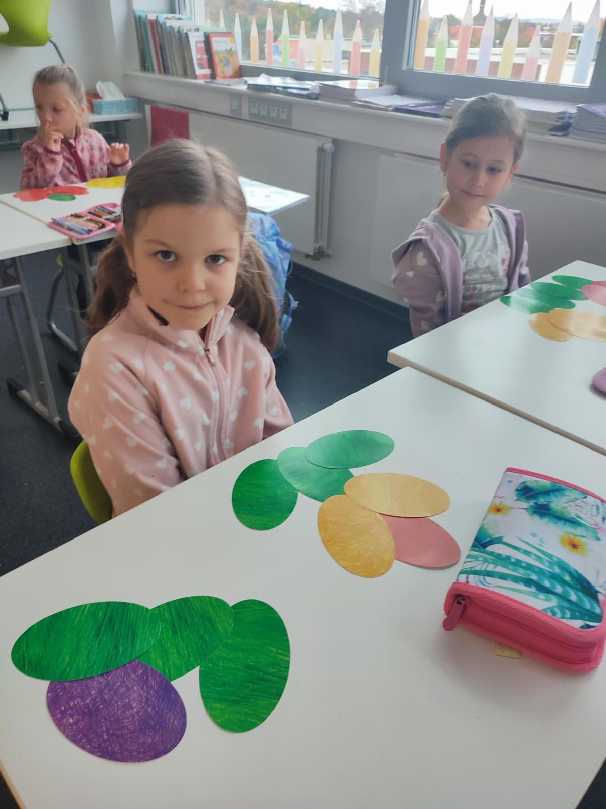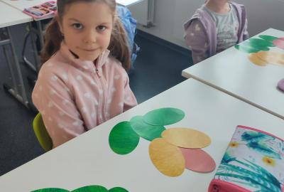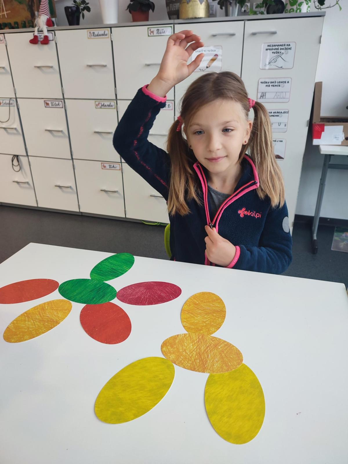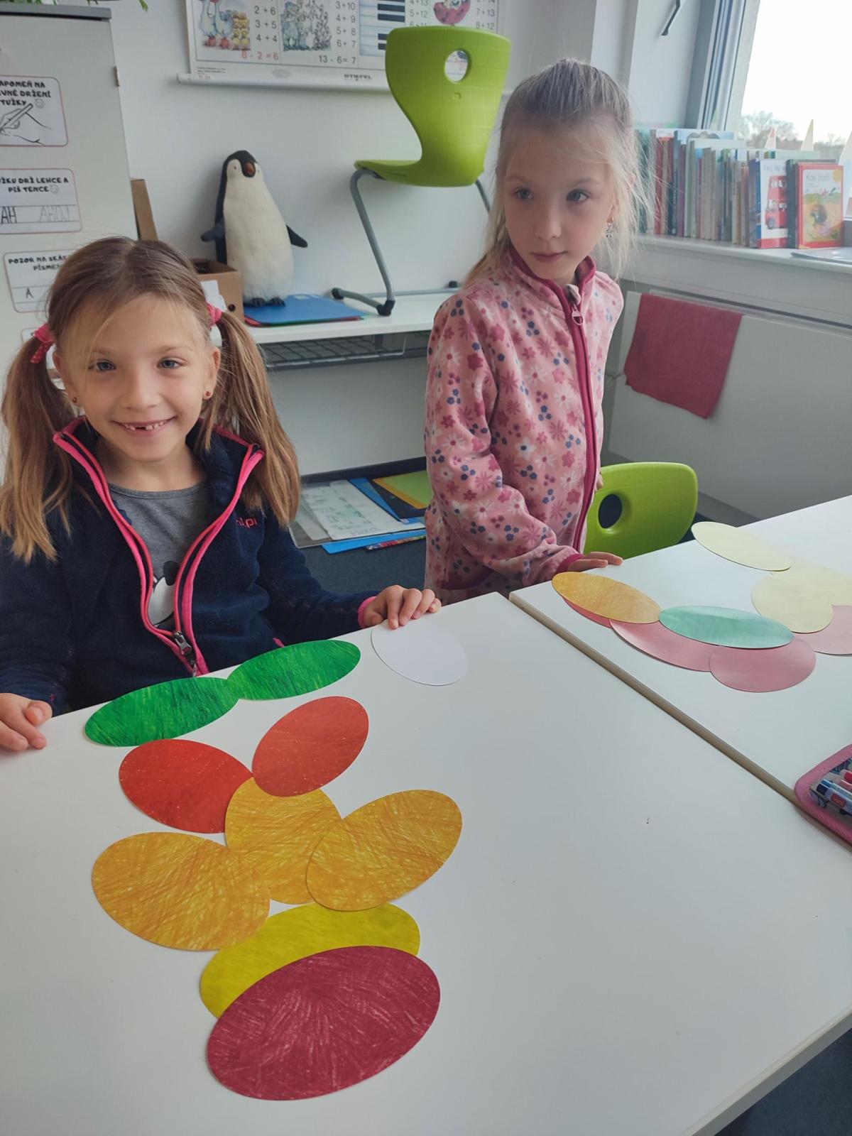 V matematice jsme skládali příklady na sčítání a odčítání s barevnými papírovými vajíčky a nakonec jsme z nich vytvořili veselé obrázky.