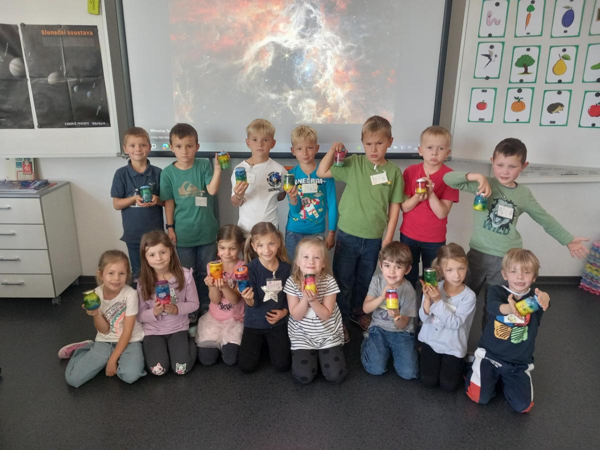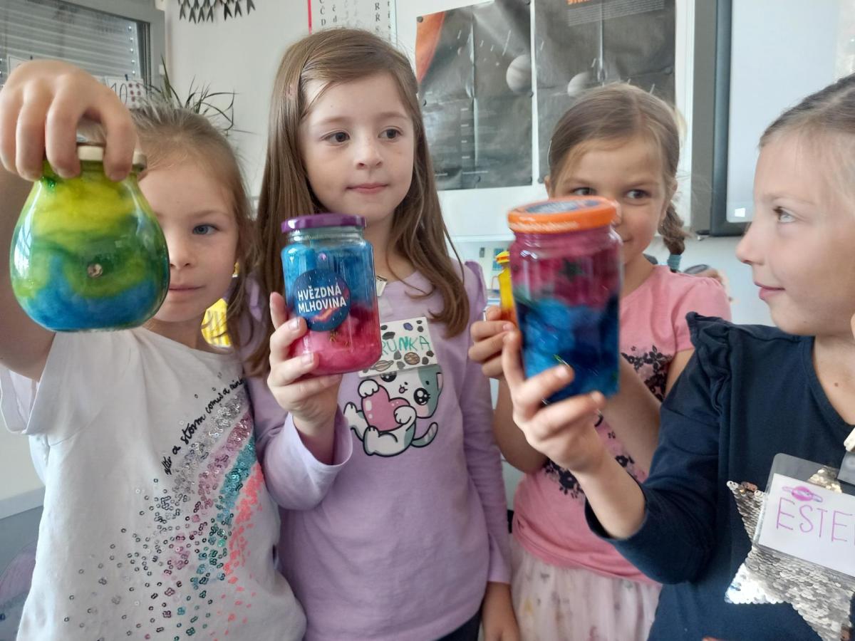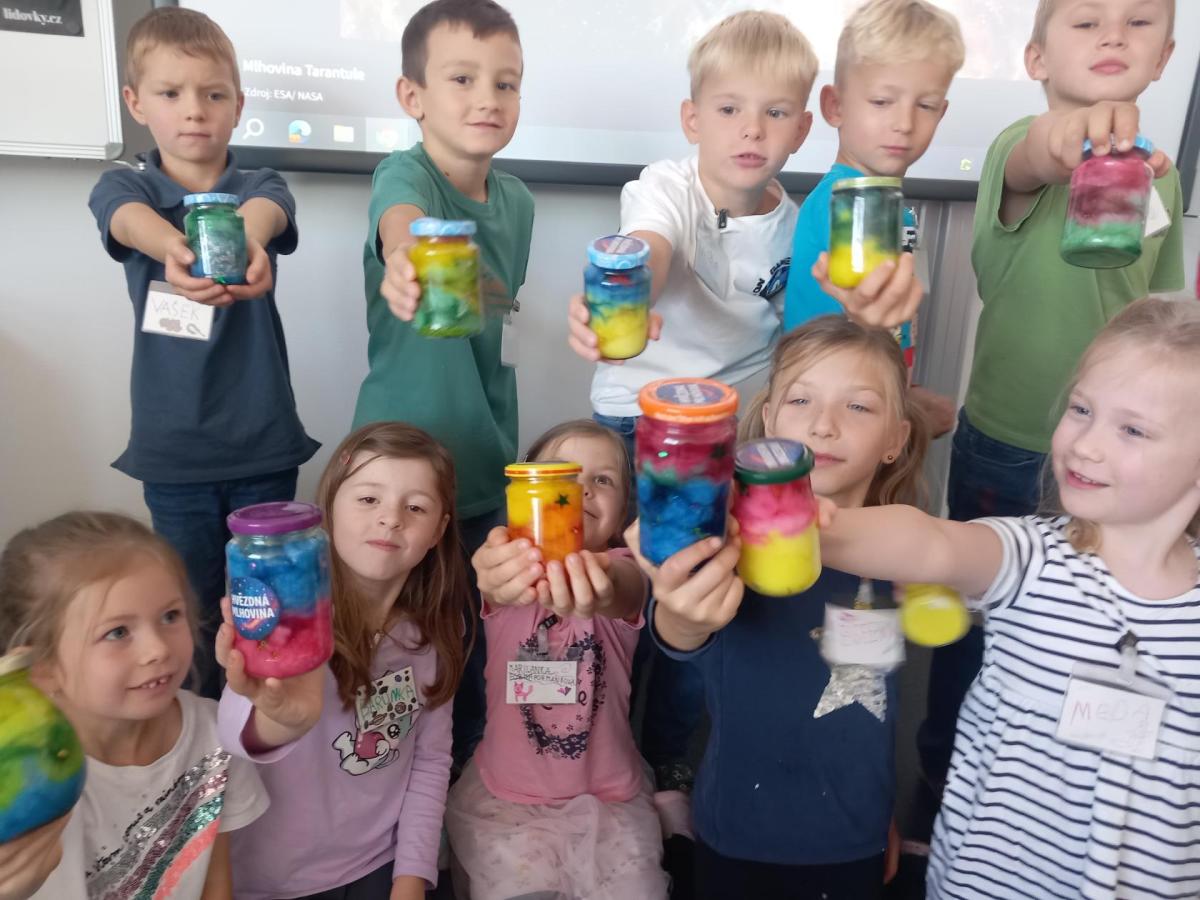A rovnou jsme vypluli vstříc vědecké práci, vědeckým pravidlům a prozkoumali jsme ne/obyčejný život vědců. Když už jsme se naladili na to, co nás bude pět let provázet, vytvořili jsme si Badatelník, věděcké konferenční vizitky, týmová pracovní pravidla a vrhli jsme se na první projekt o VESMÍRU. Nejvíc wow pokus je vždy vytváření hvězdné mlhoviny. To bylo radosti! :)