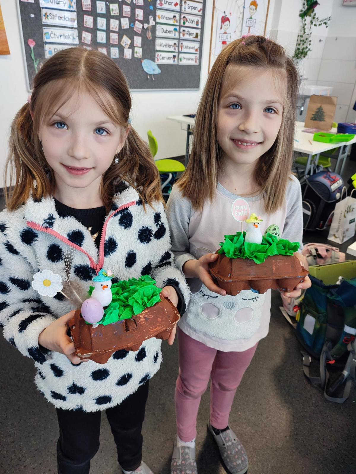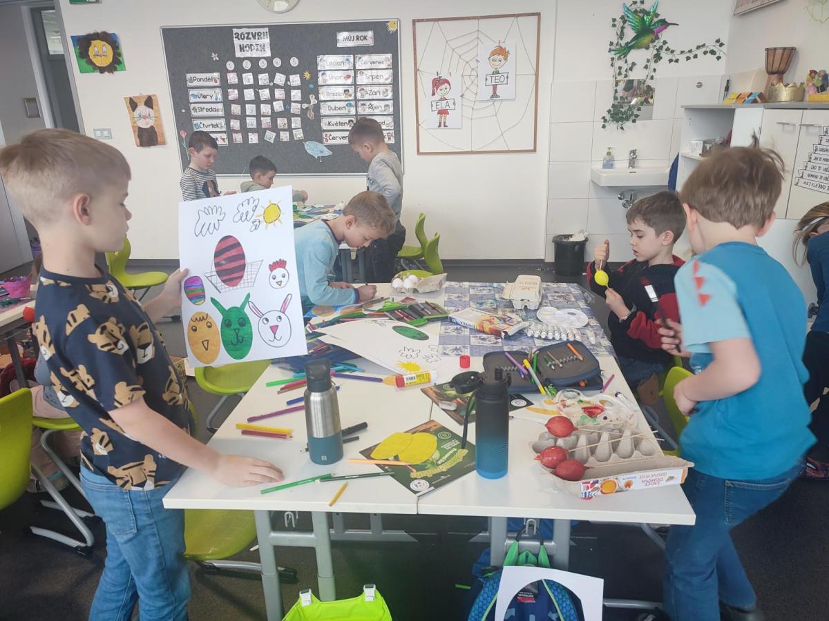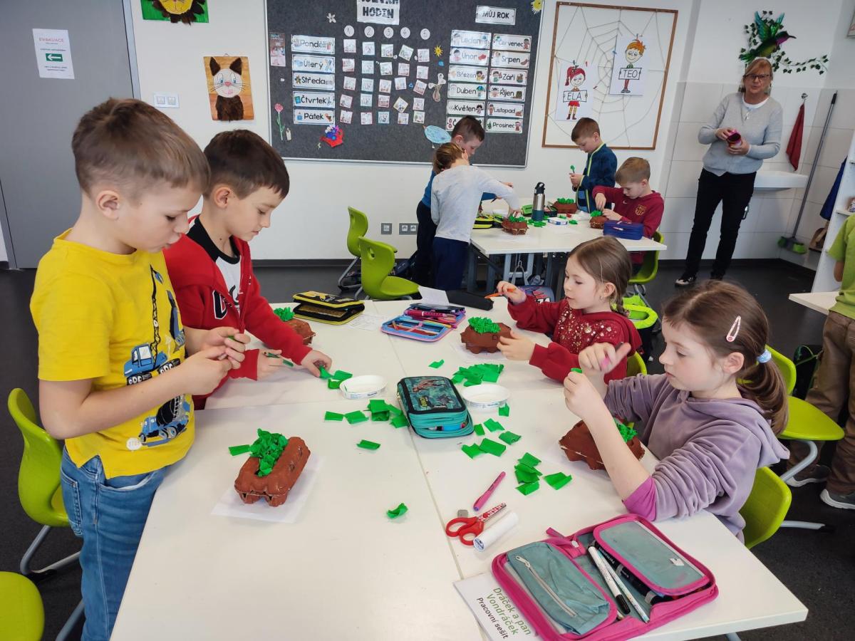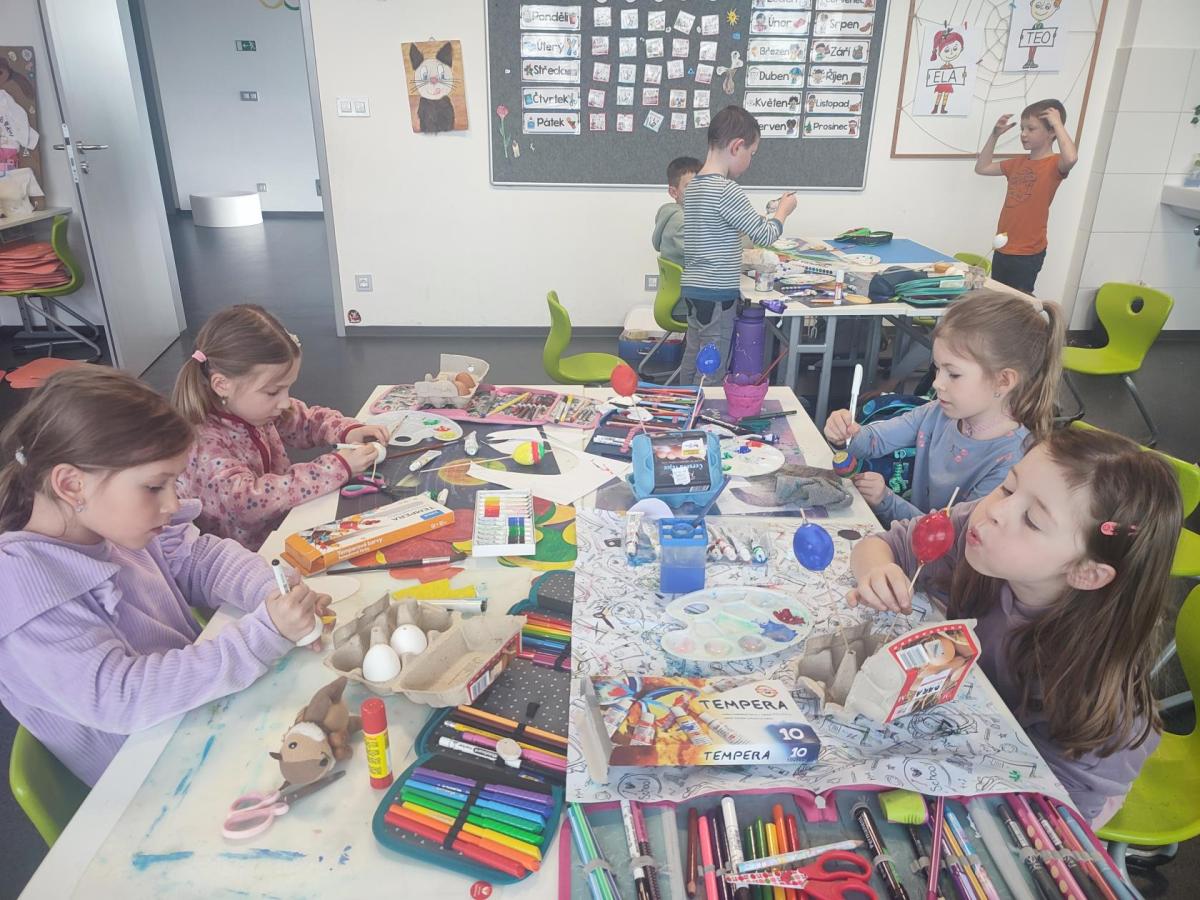 V předvelikonočním čase si naši prvňáčci užili tvoření plné barev, fantazie a radosti. Společně jsme se pustili do zdobení vajíček, které se dětem moc povedlo, a každé z nich bylo originální. Součásti tvoření bylo také zakládání papírové velikonoční zahrádky. Tentokrát děti dostávaly instrukce v anglickém jazyce od Goldie, takže se musely hodně soustředit a uplatnit své znalosti angličtiny prakticky. Goldie dětem přinesla spoustu drobných ozdůbek, kterými jsme krásně doplnili malovaná vajíčka na svých zahrádkách.