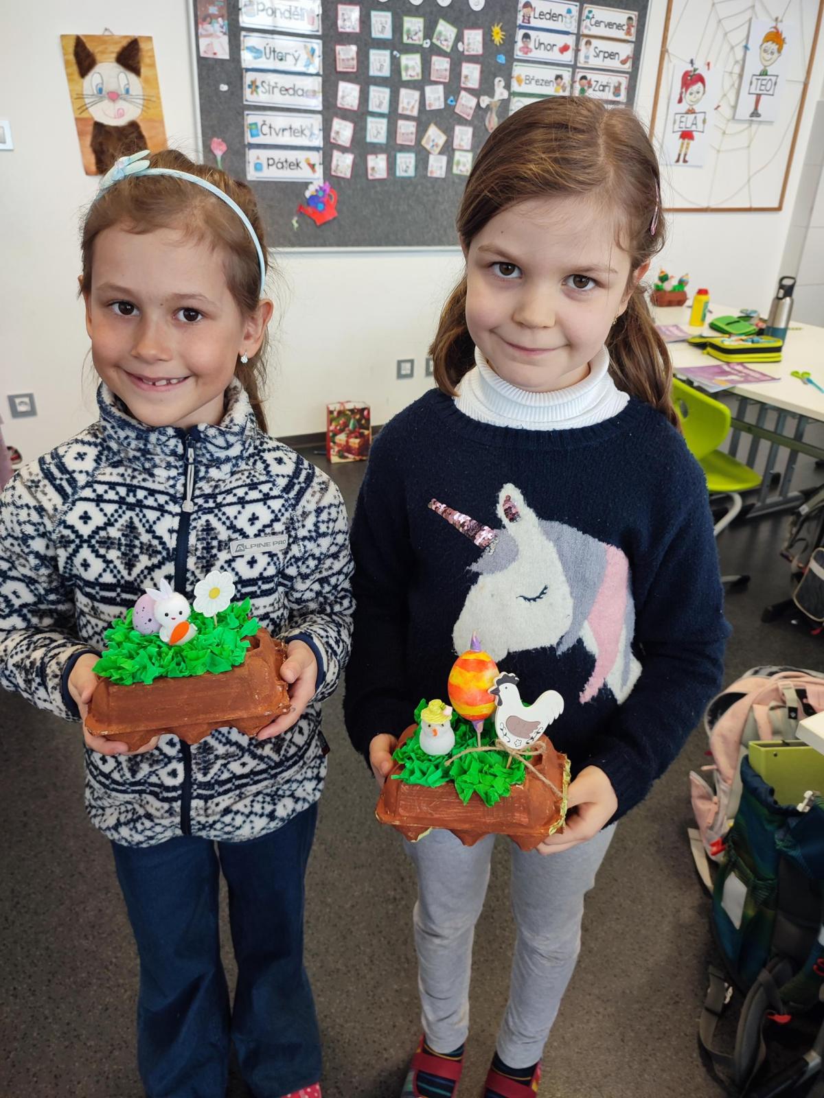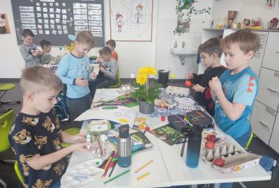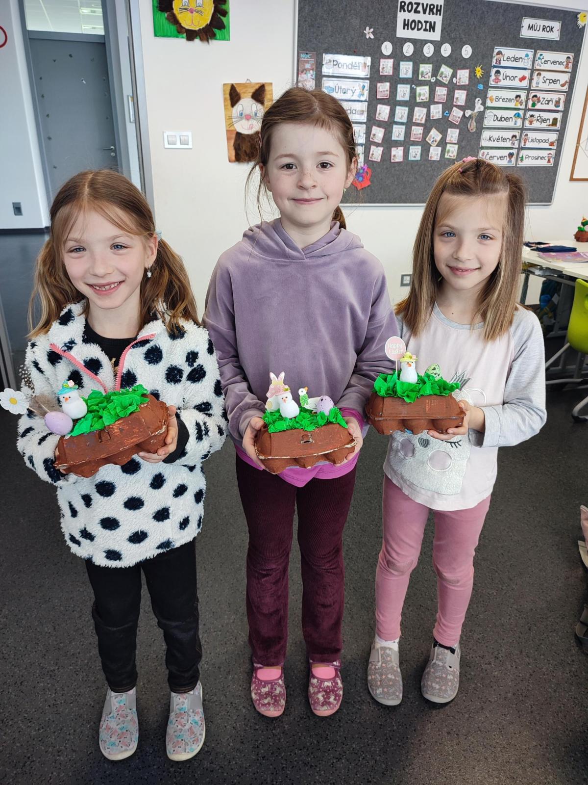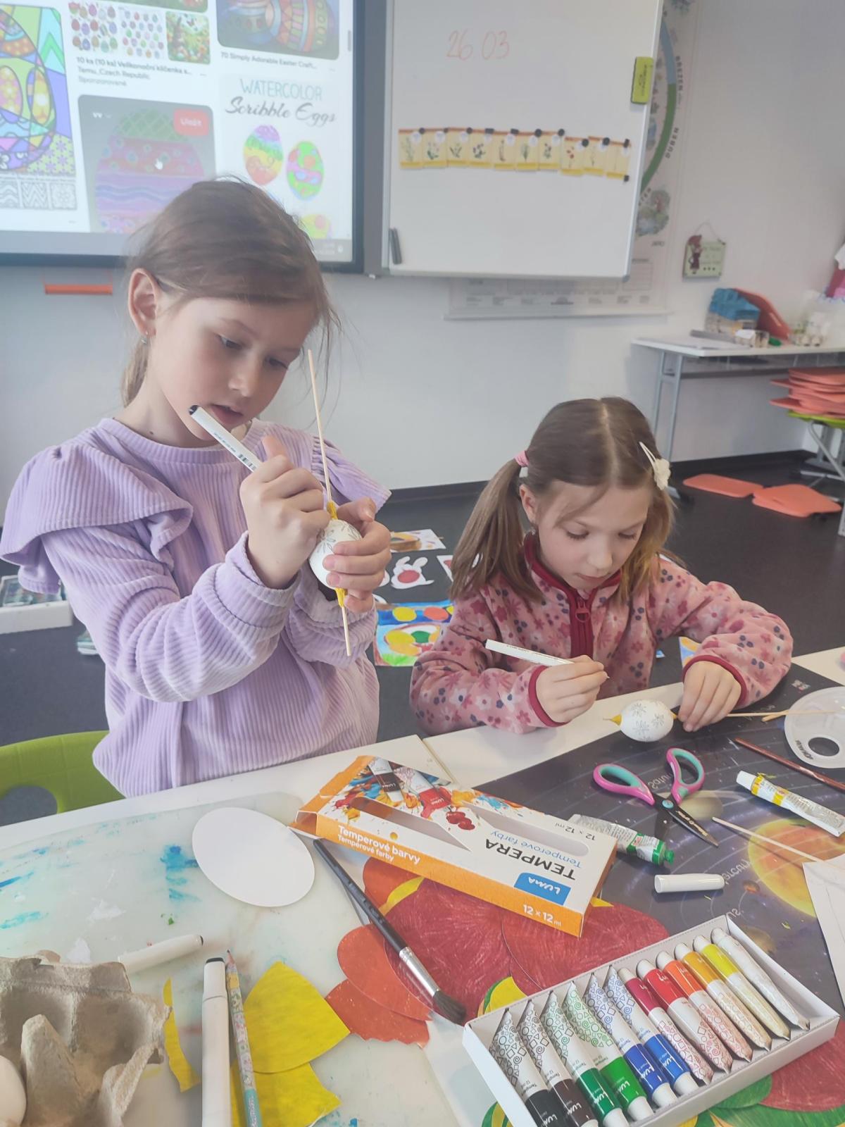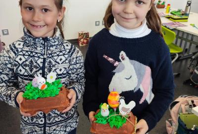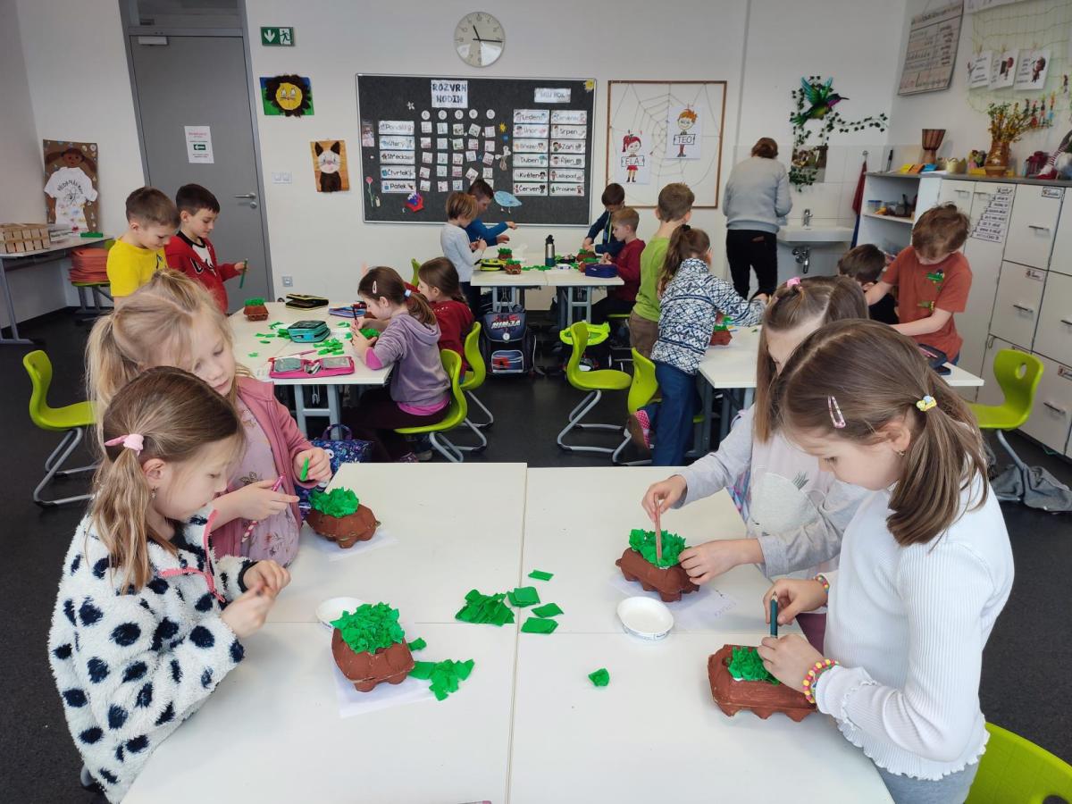 V předvelikonočním čase si naši prvňáčci užili tvoření plné barev, fantazie a radosti. Společně jsme se pustili do zdobení vajíček, které se dětem moc povedlo, a každé z nich bylo originální. Součásti tvoření bylo také zakládání papírové velikonoční zahrádky. Tentokrát děti dostávaly instrukce v anglickém jazyce od Goldie, takže se musely hodně soustředit a uplatnit své znalosti angličtiny prakticky. Goldie dětem přinesla spoustu drobných ozdůbek, kterými jsme krásně doplnili malovaná vajíčka na svých zahrádkách.