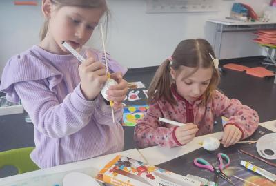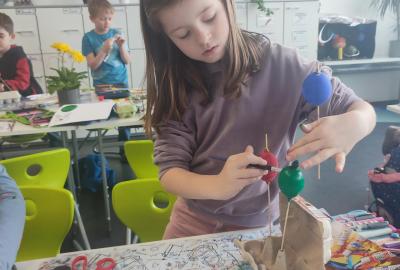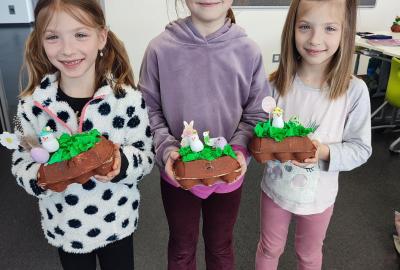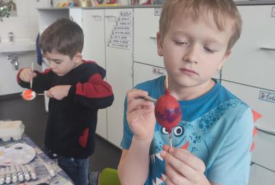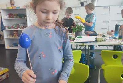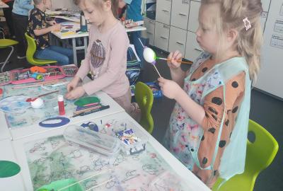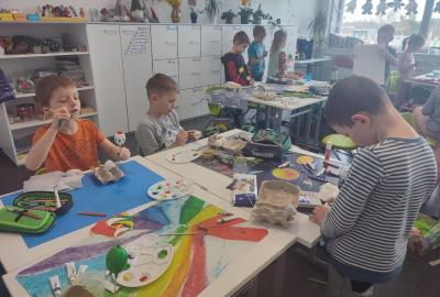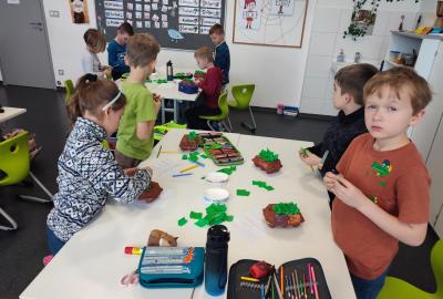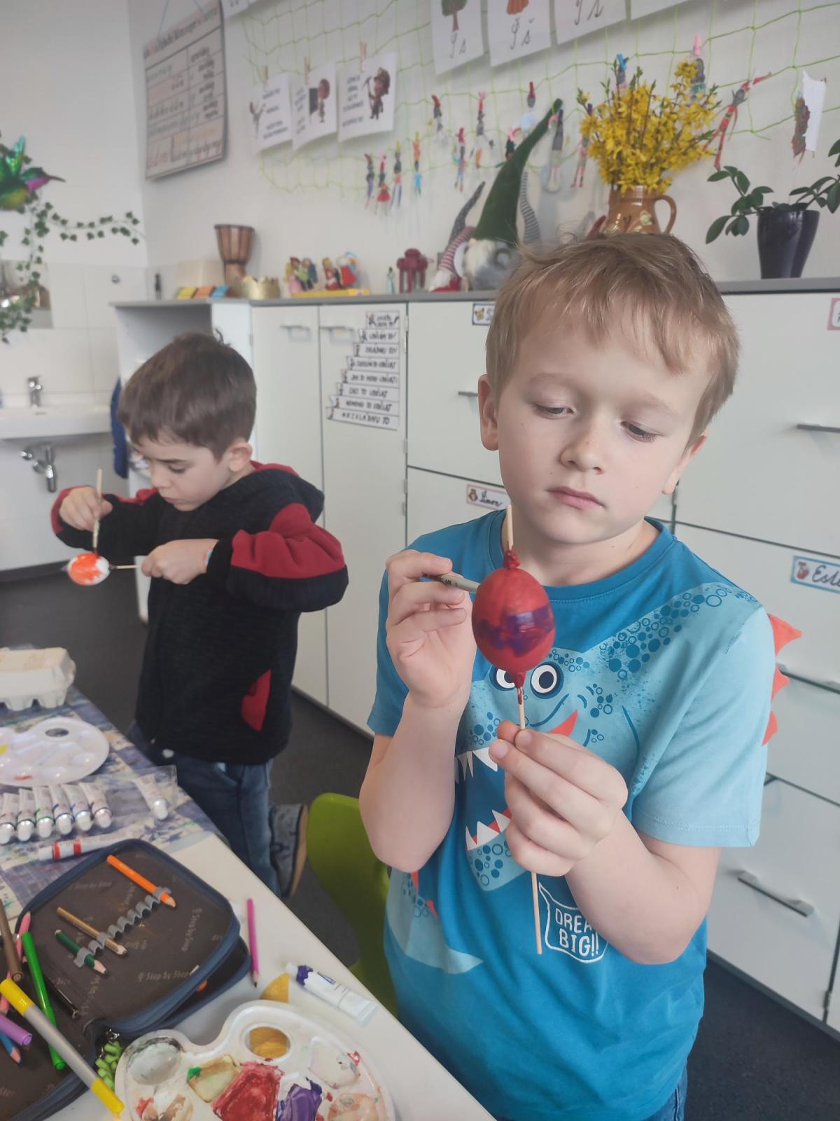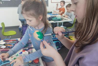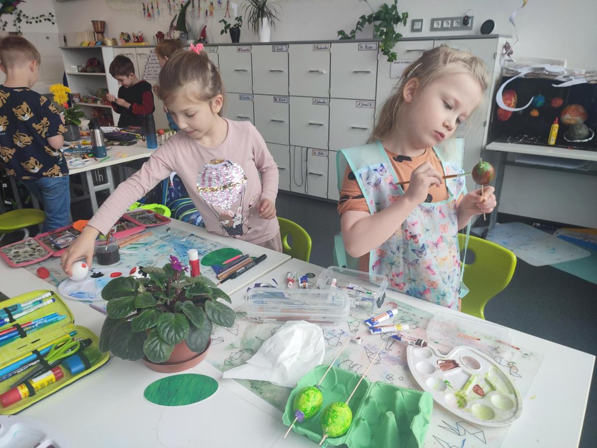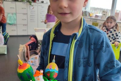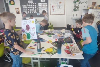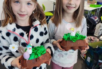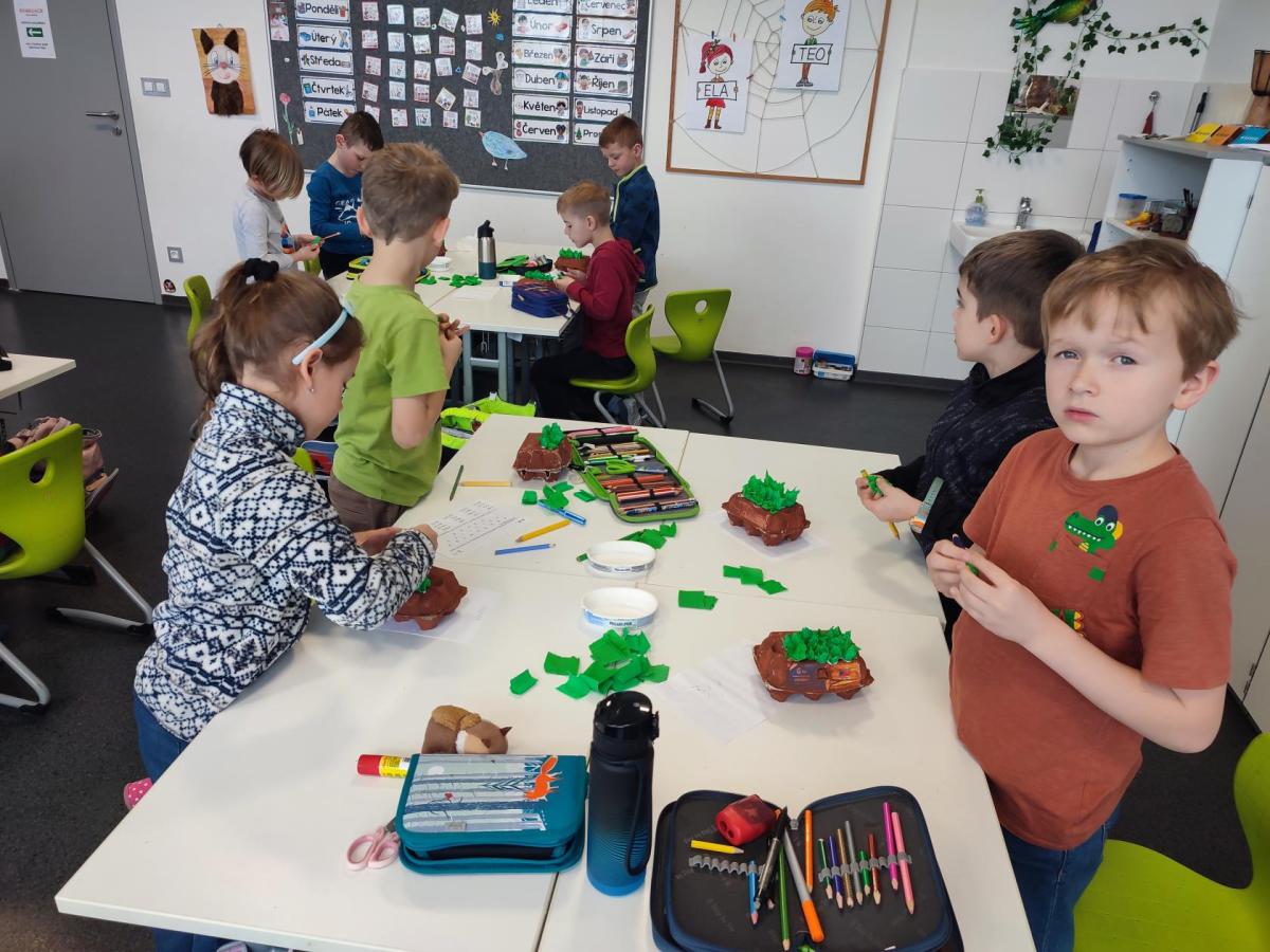 V předvelikonočním čase si naši prvňáčci užili tvoření plné barev, fantazie a radosti. Společně jsme se pustili do zdobení vajíček, které se dětem moc povedlo, a každé z nich bylo originální. Součásti tvoření bylo také zakládání papírové velikonoční zahrádky. Tentokrát děti dostávaly instrukce v anglickém jazyce od Goldie, takže se musely hodně soustředit a uplatnit své znalosti angličtiny prakticky. Goldie dětem přinesla spoustu drobných ozdůbek, kterými jsme krásně doplnili malovaná vajíčka na svých zahrádkách.