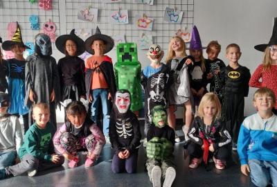 Ahoj všichni :-) . Jmenuji se Kája Novák, chodím do 1. D a chci vám vyprávět o svém úplně prvním školním Halloweenu. To jsem ještě neviděl! Všichni, malé i velké děti, a dokonce i paní učitelky přišly na páteční vyučování v kostýmu. Ta naše tedy ne, chtěla dělat vránu, ovšem převlek zapomněla doma. Tak příště. Představte si, že na chodbě na nás mával obrovský oranžový dinosaurus. I paní ředitelka si s ním plácla.