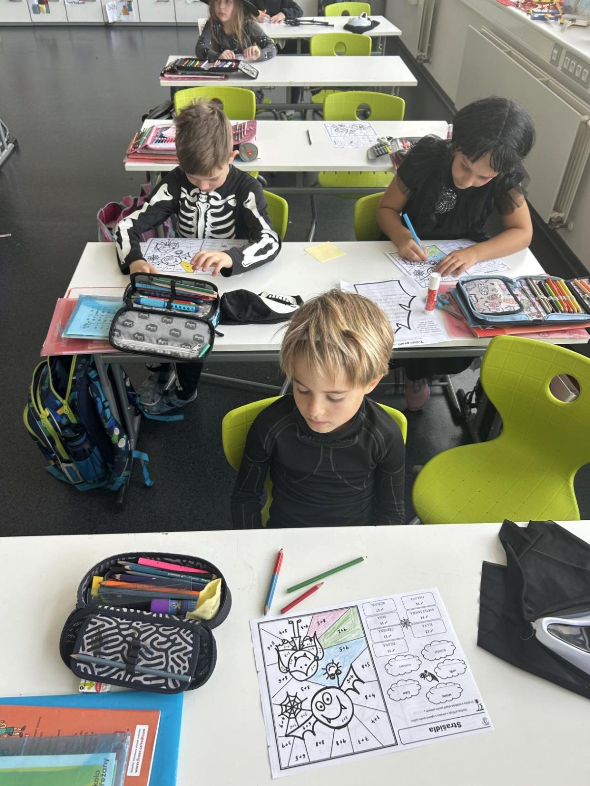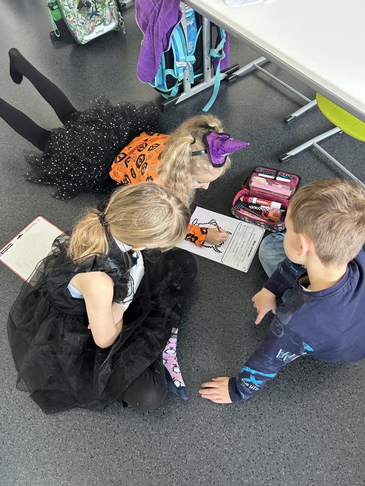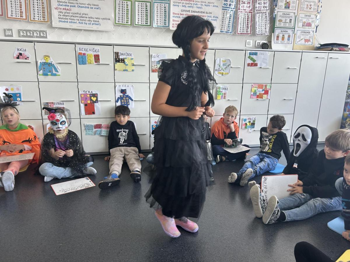 První hodinu jsme začali písankou, ale diktát byl tematický – děti psaly slova jako strašidlo, dýně, upírka a další. Poté jsme si na rozehřátí zatancovali halloweenský tanec, který děti okamžitě nadchl.