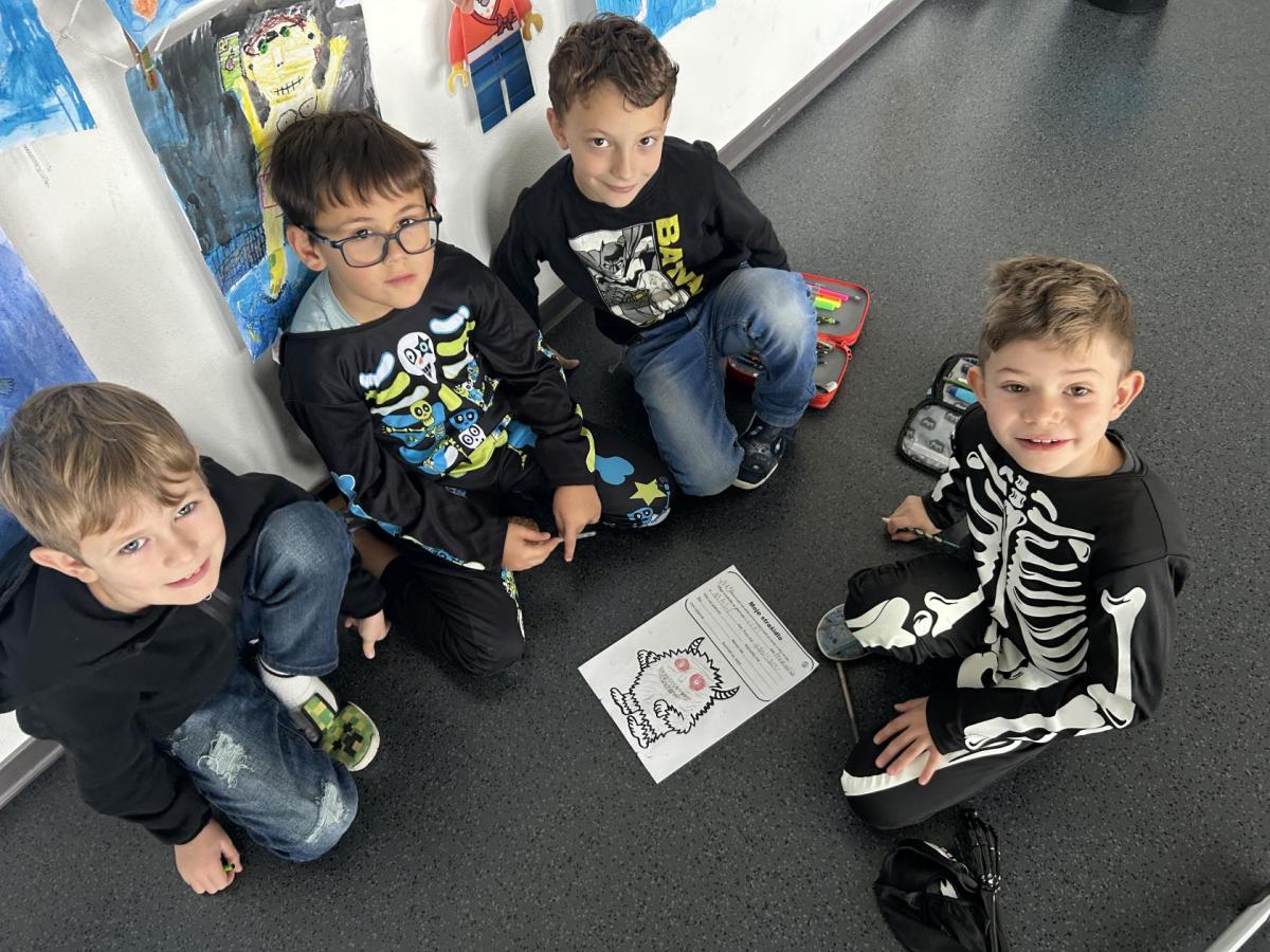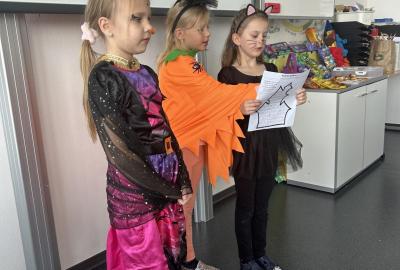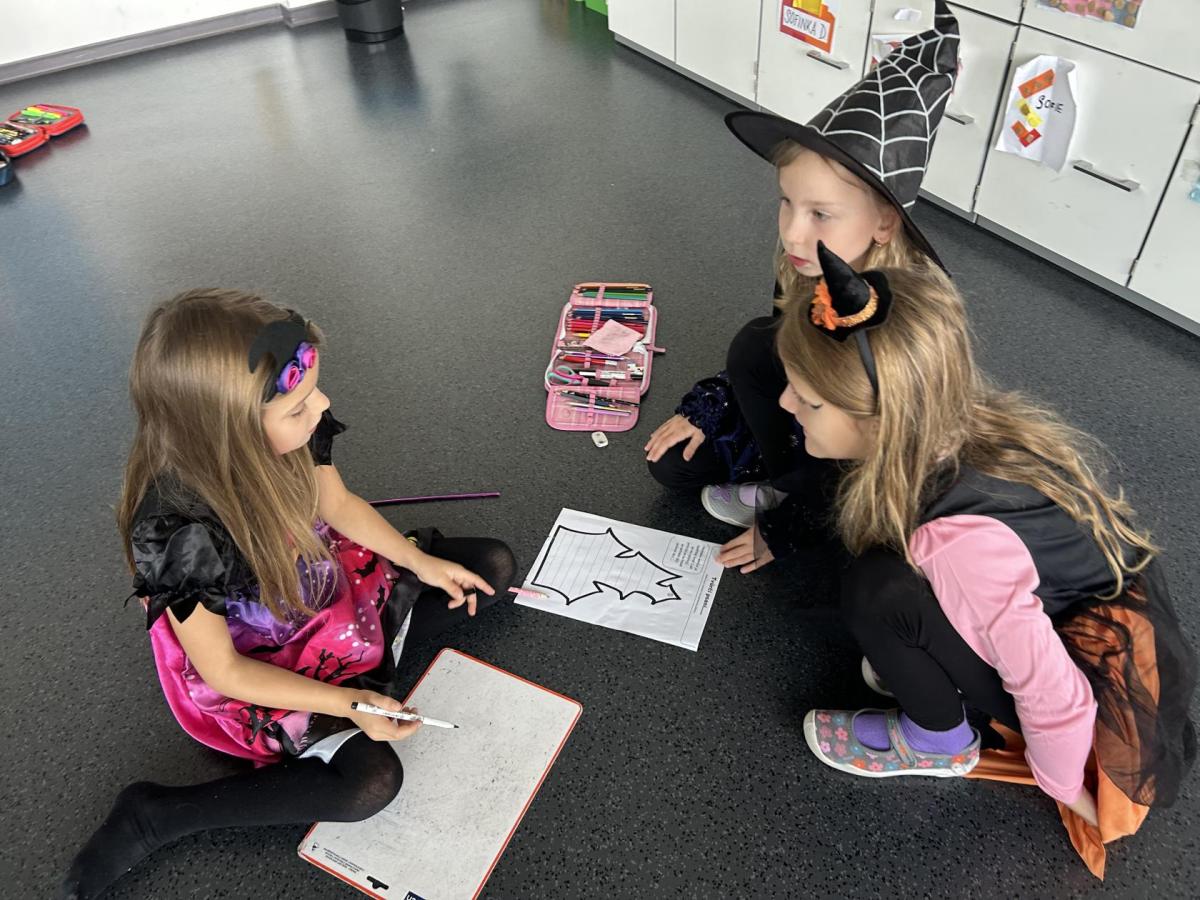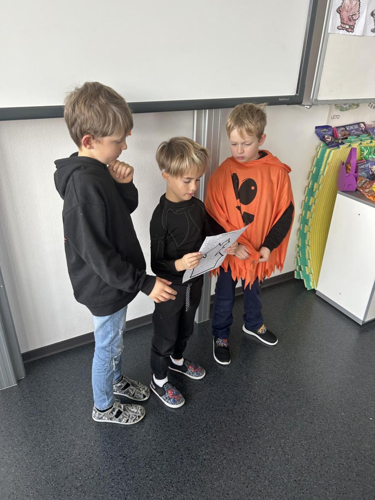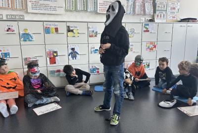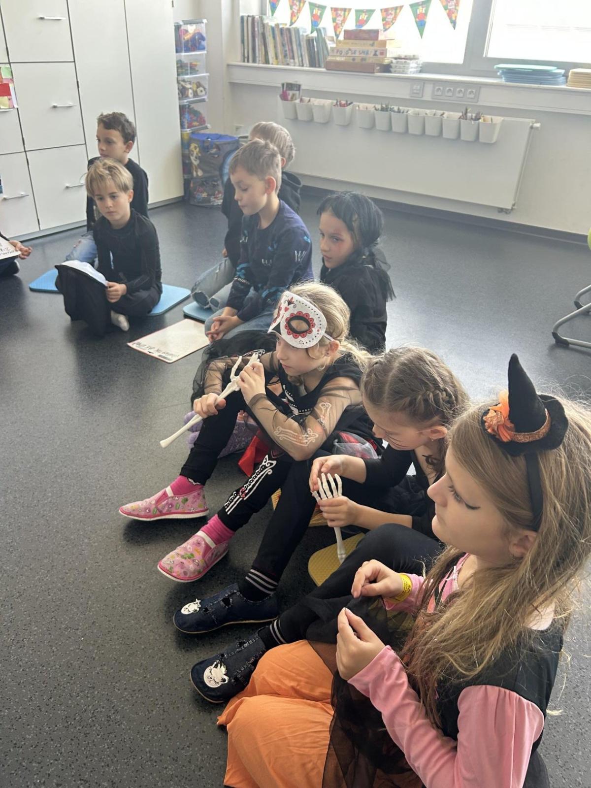 V další hodině děti ve skupinách vymýšlely strašidelné příběhy. Všechny jsme přečetli a společně zvolili vítězný tým. Na závěr mohl každý, kdo chtěl, představit svou masku. A samozřejmě nechyběl druhý halloweenský tanec a společná fotka.
