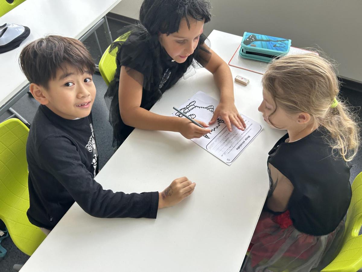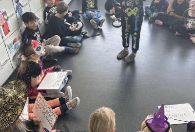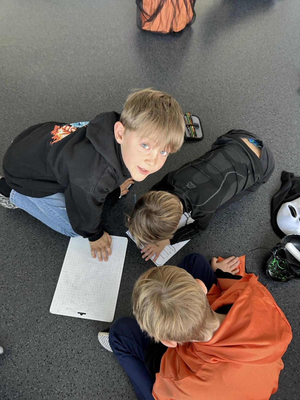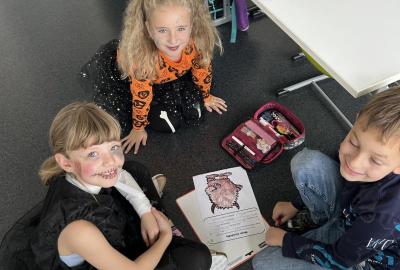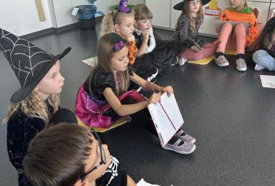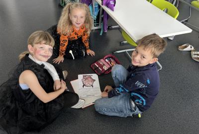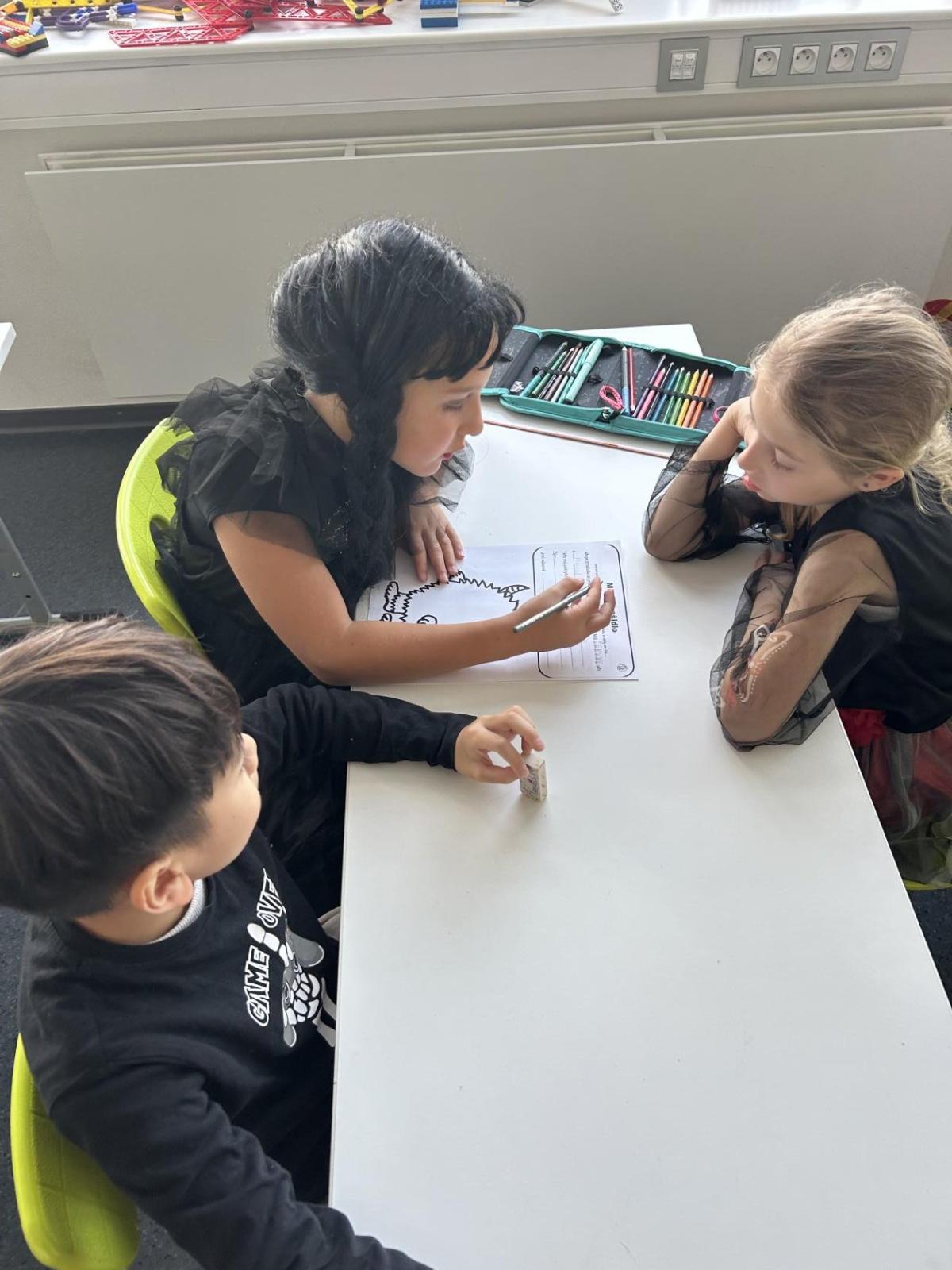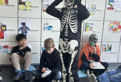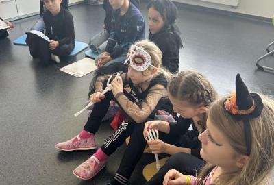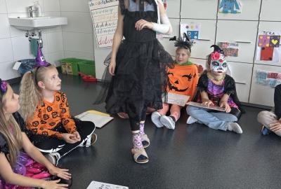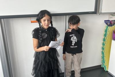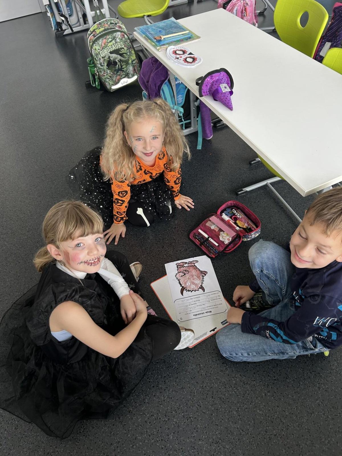 V další hodině děti ve skupinách vymýšlely strašidelné příběhy. Všechny jsme přečetli a společně zvolili vítězný tým. Na závěr mohl každý, kdo chtěl, představit svou masku. A samozřejmě nechyběl druhý halloweenský tanec a společná fotka.