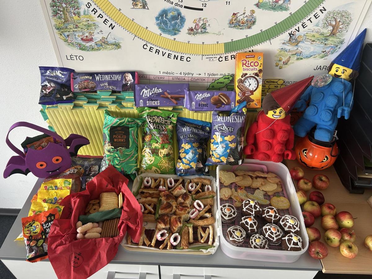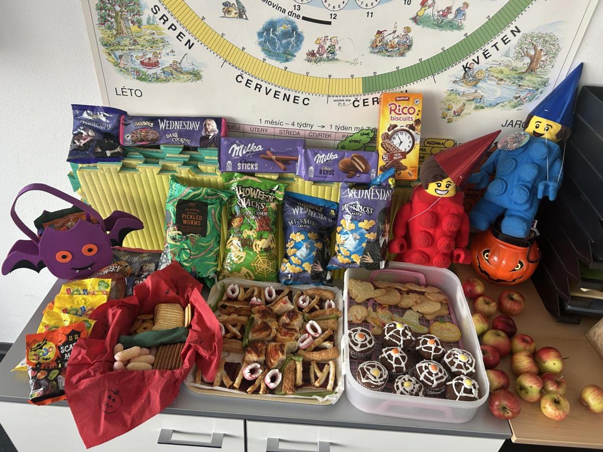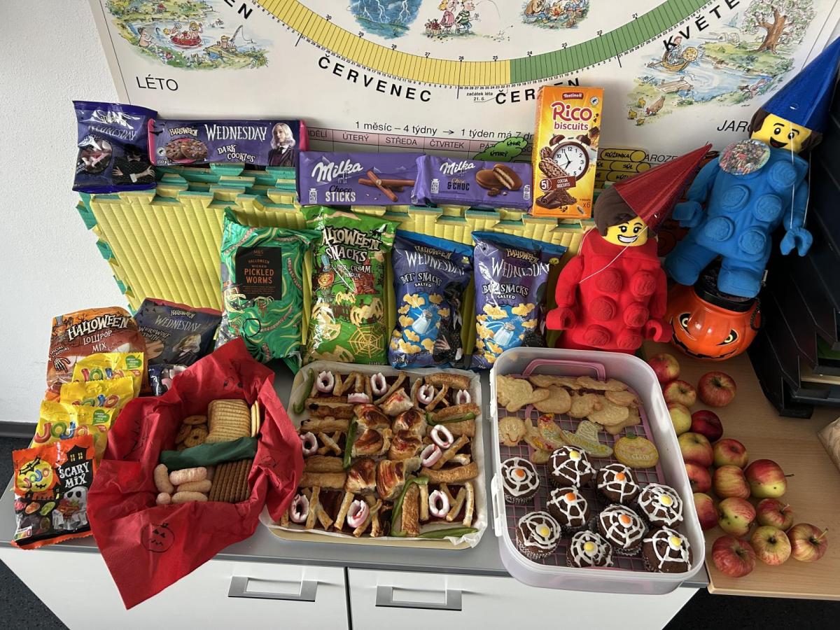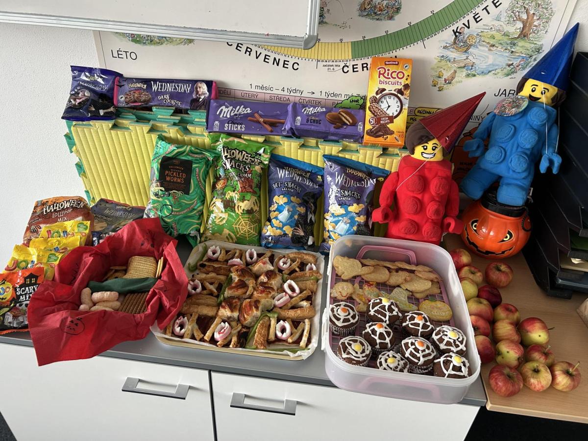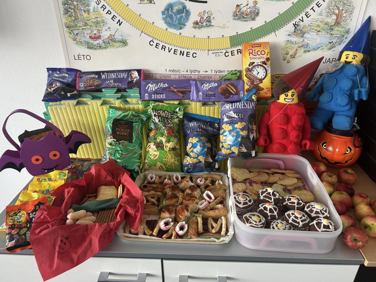 O velké přestávce jsme si pochutnali na úžasné halloweenské hostině. Děti přinesly muffiny, sušenky, slané dobroty, tematické sladkosti i ovoce.