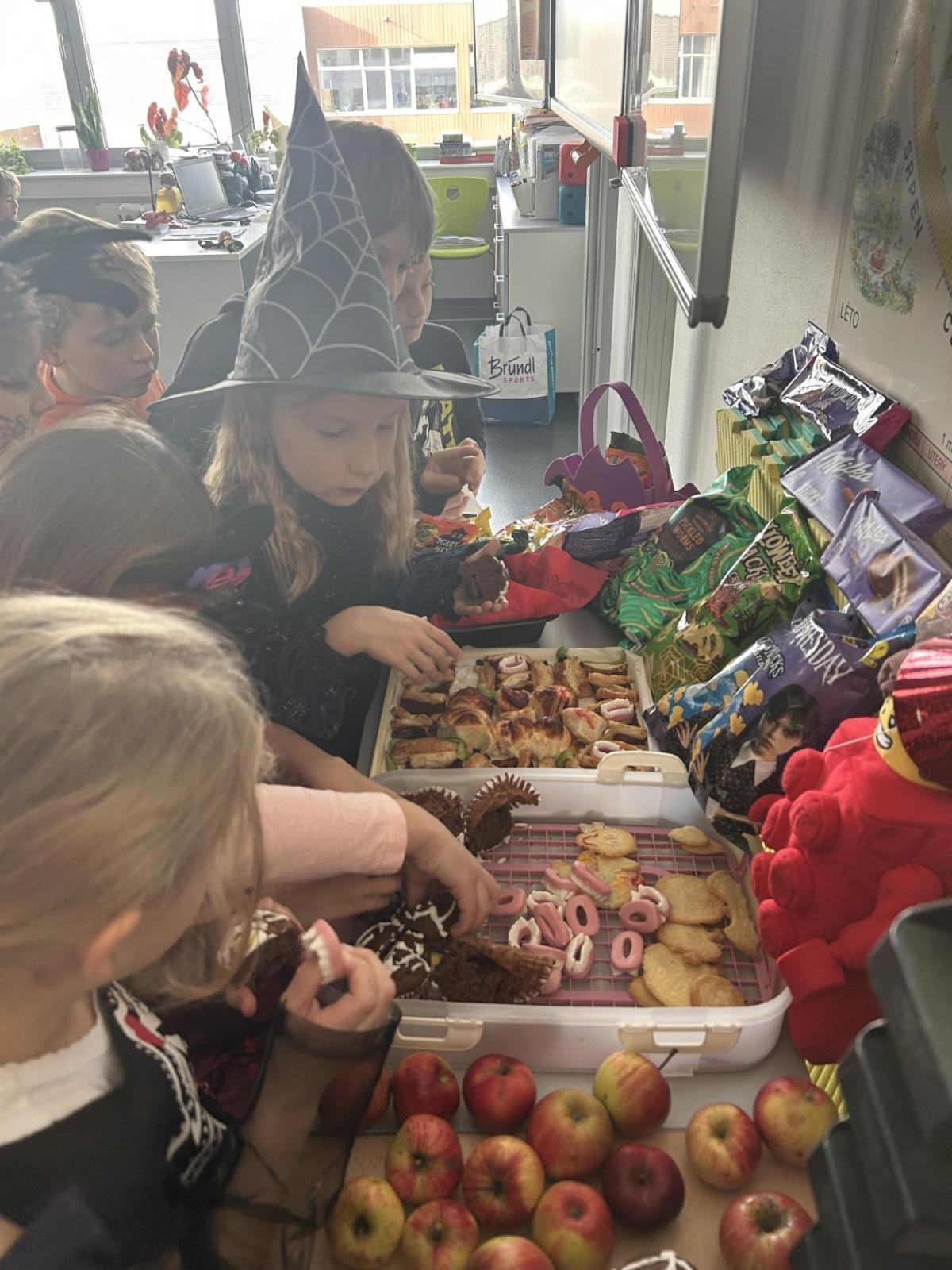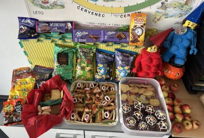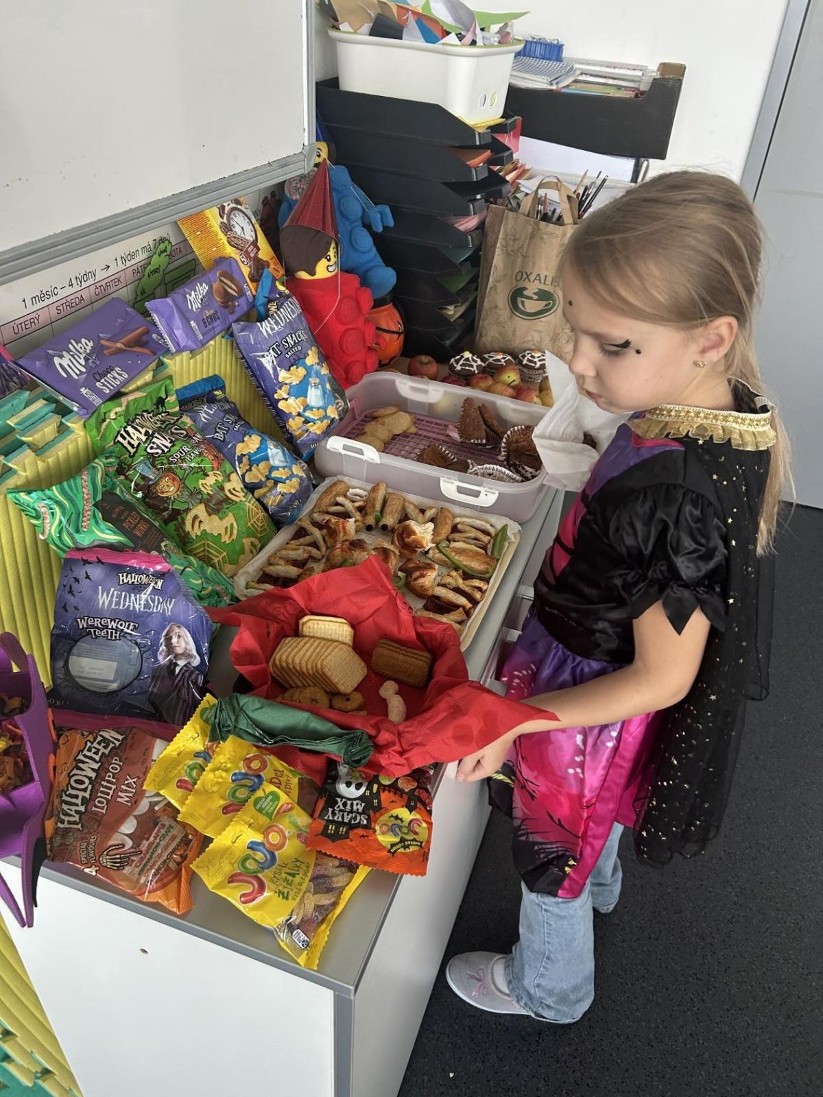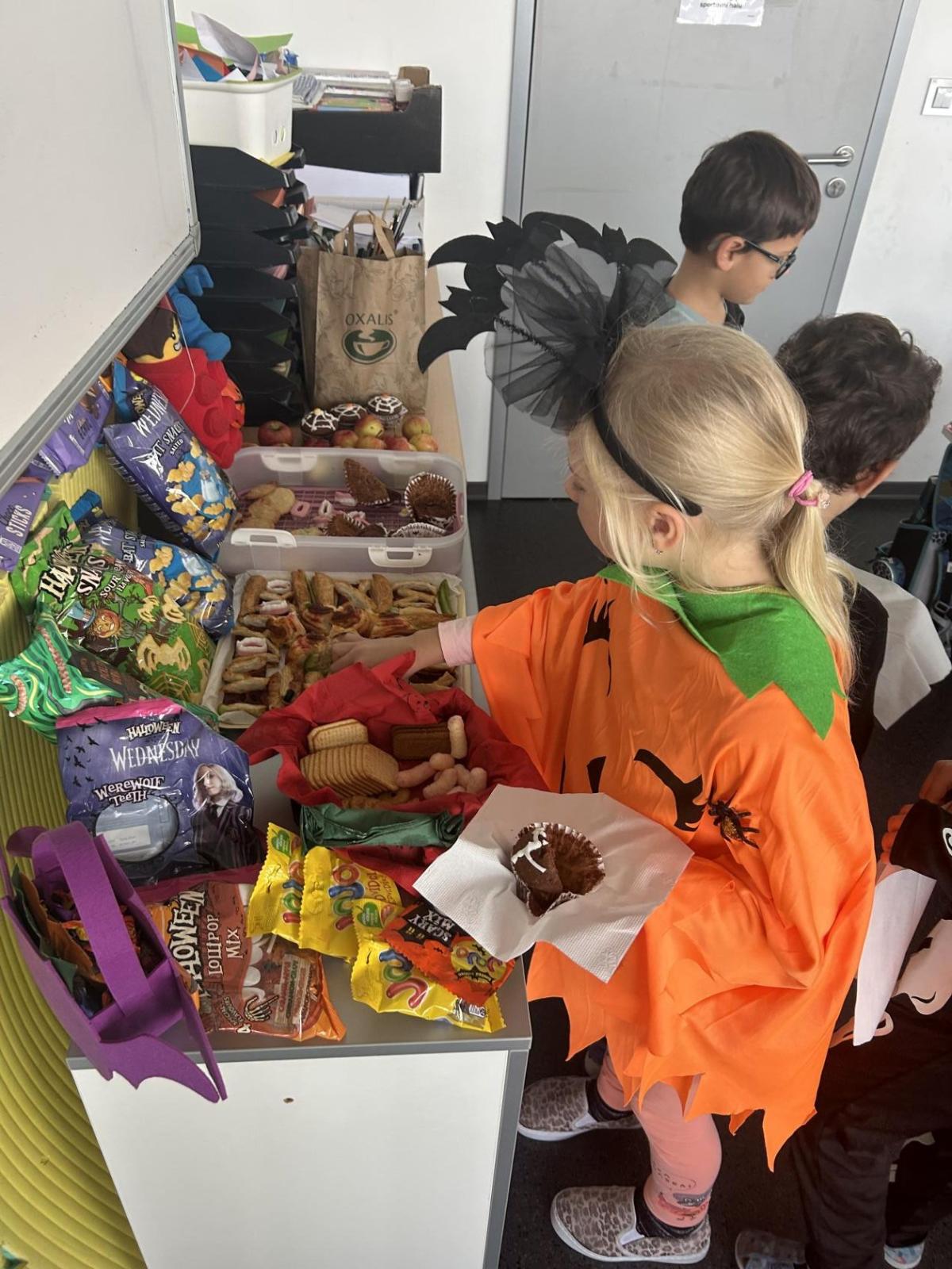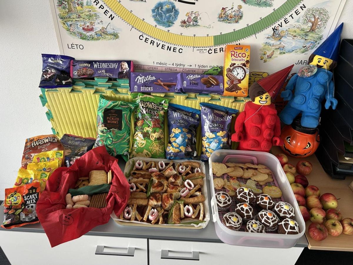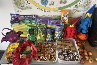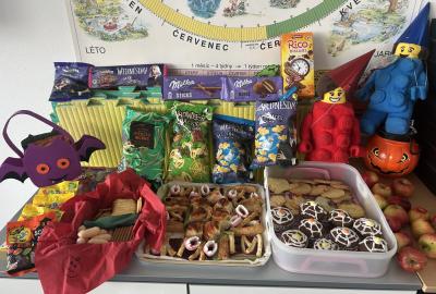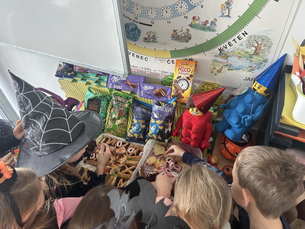 O velké přestávce jsme si pochutnali na úžasné halloweenské hostině. Děti přinesly muffiny, sušenky, slané dobroty, tematické sladkosti i ovoce.