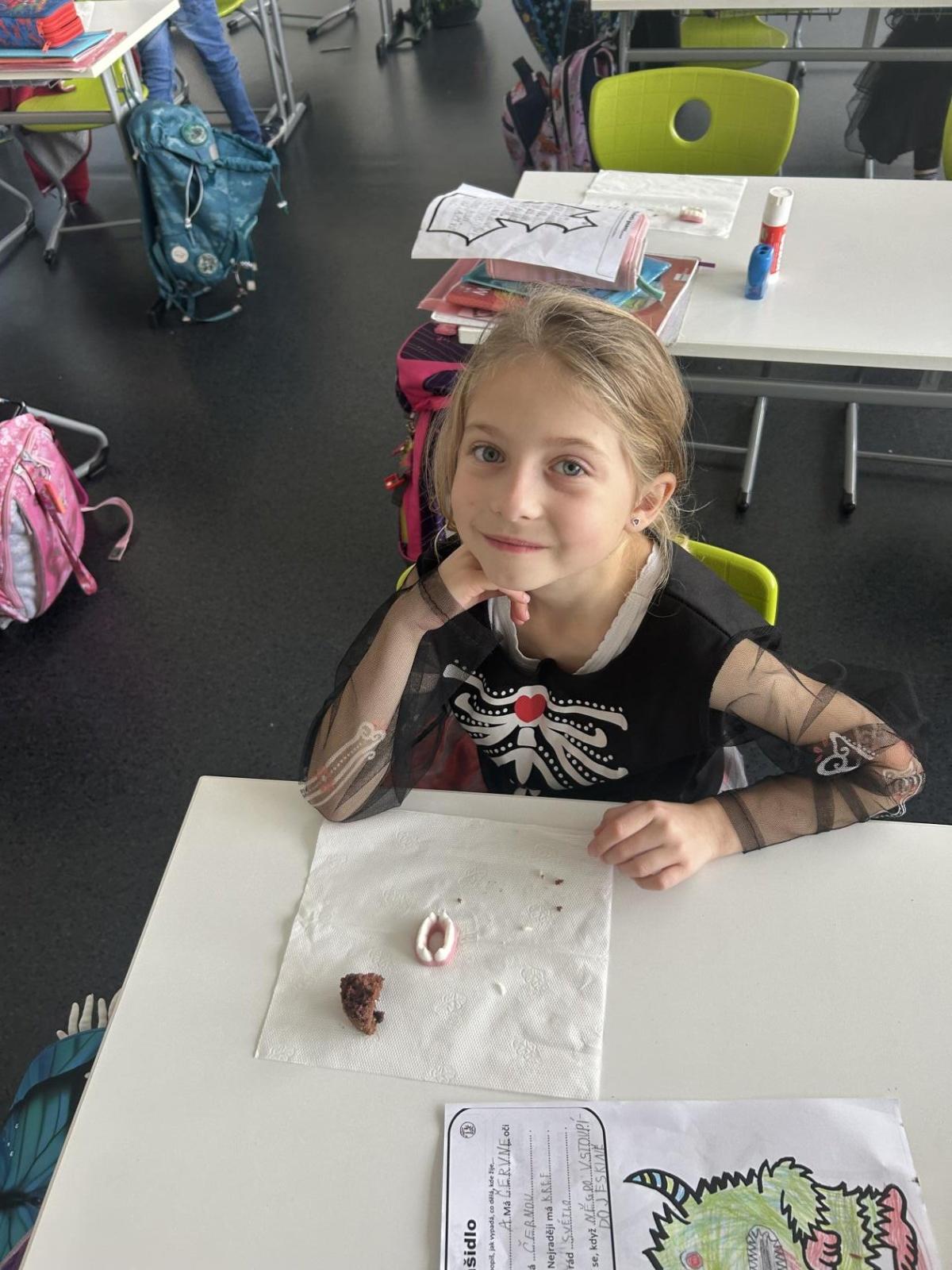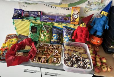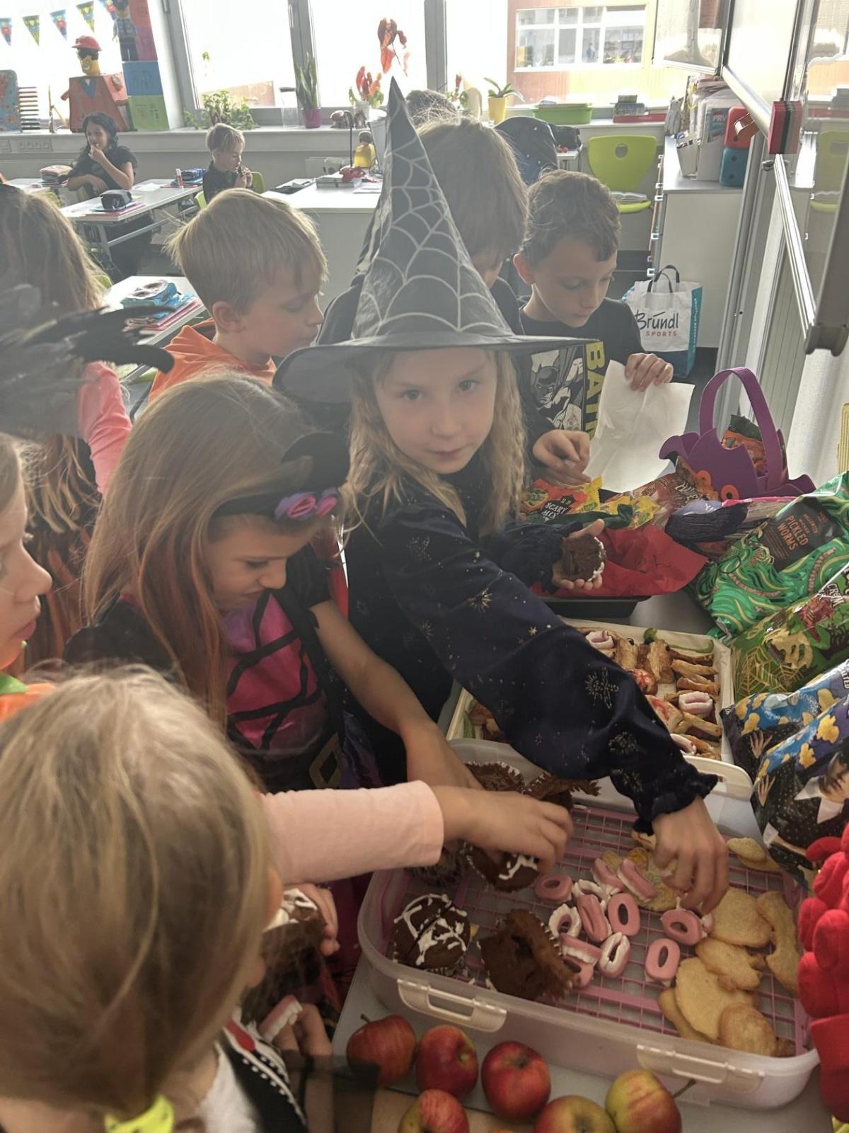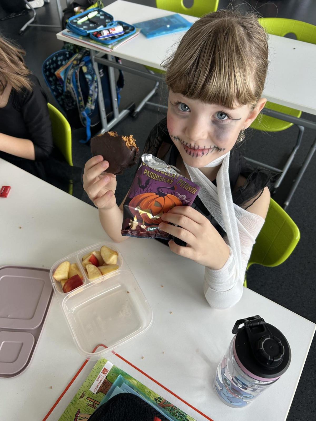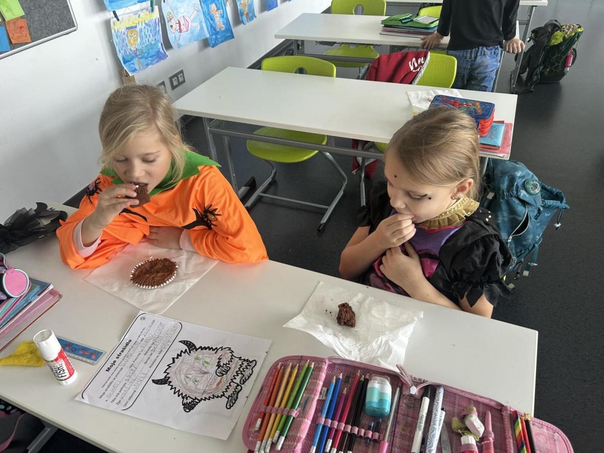 O velké přestávce jsme si pochutnali na úžasné halloweenské hostině. Děti přinesly muffiny, sušenky, slané dobroty, tematické sladkosti i ovoce.
