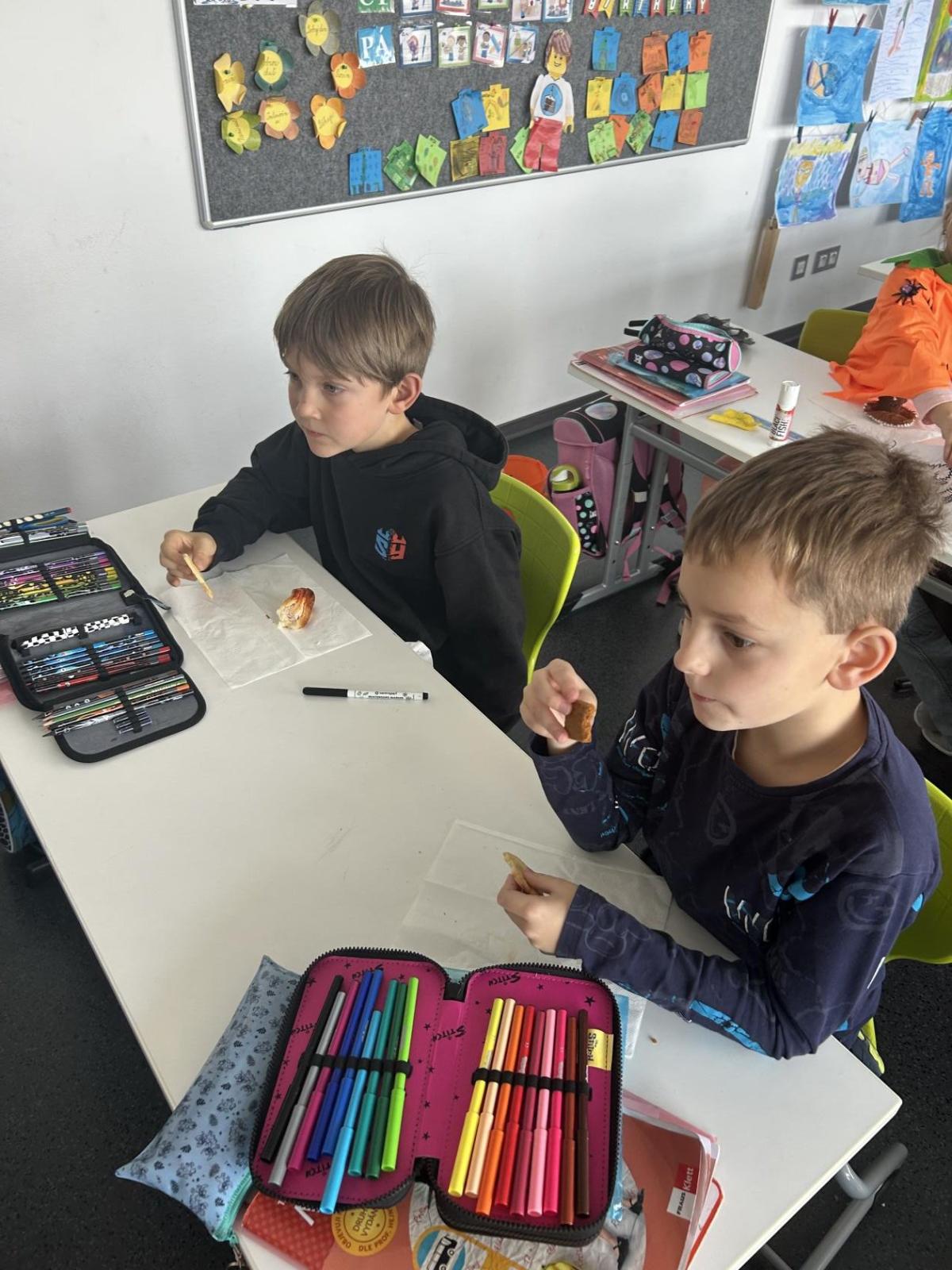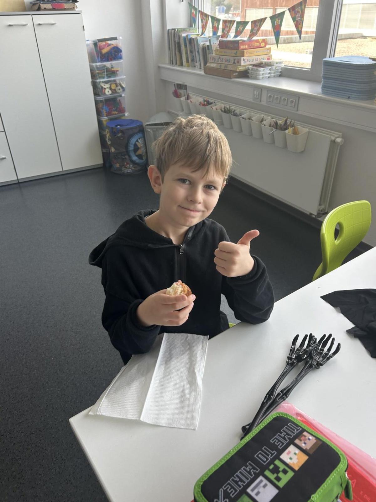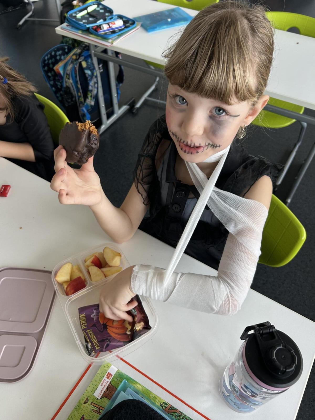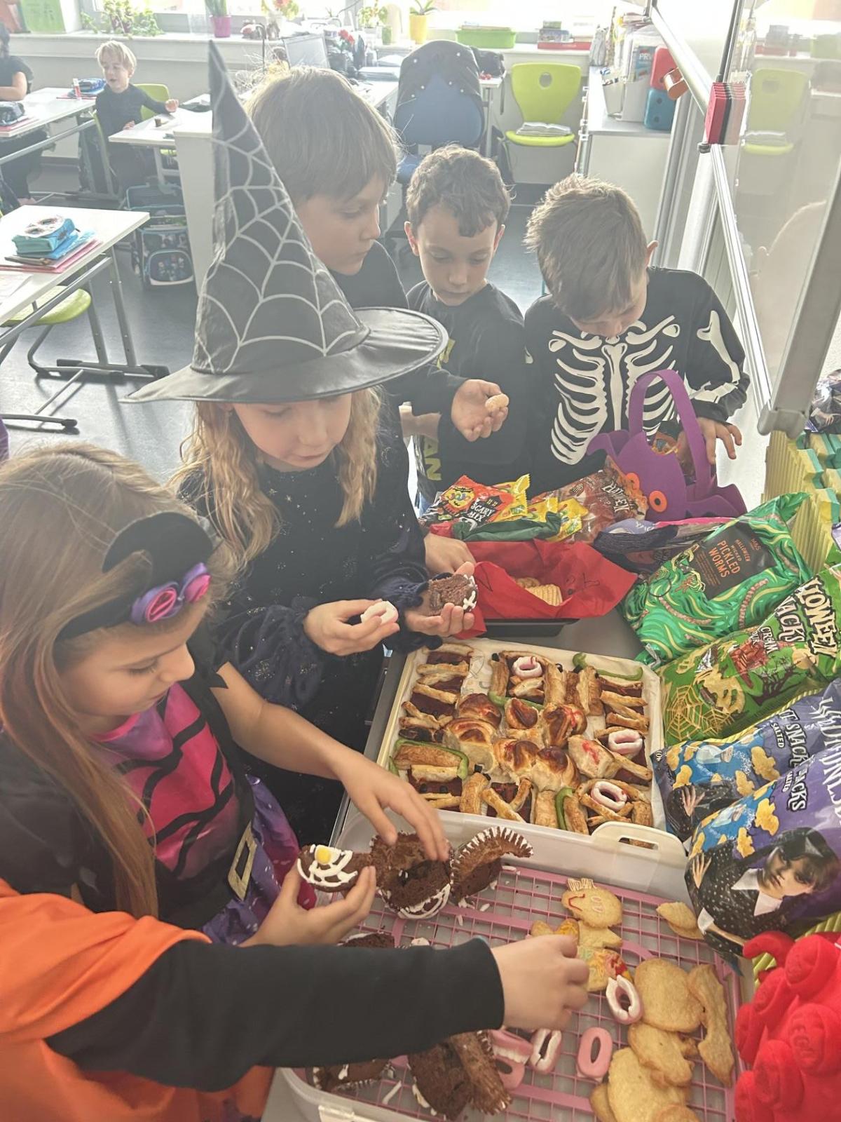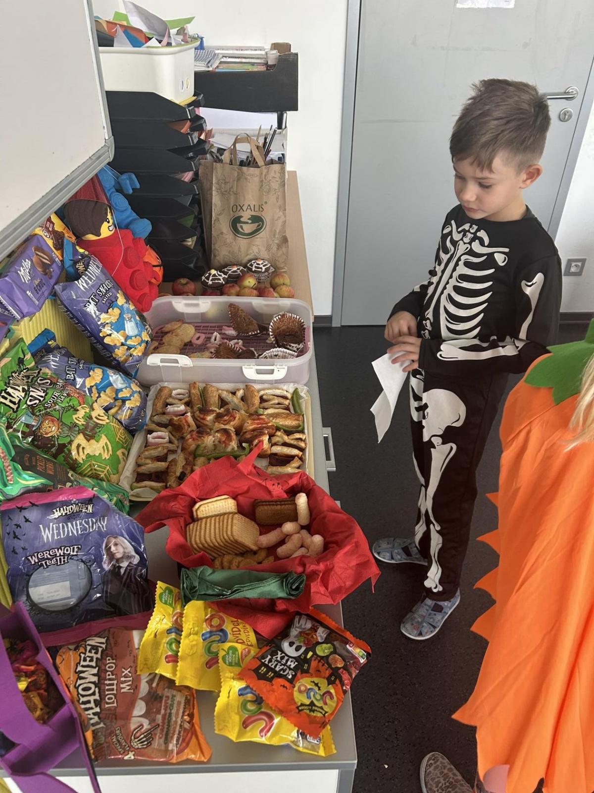 O velké přestávce jsme si pochutnali na úžasné halloweenské hostině. Děti přinesly muffiny, sušenky, slané dobroty, tematické sladkosti i ovoce.