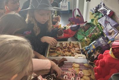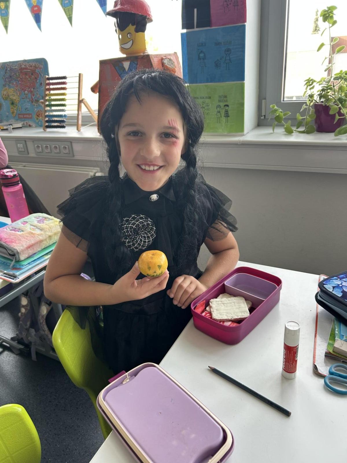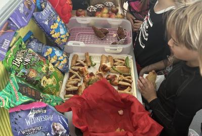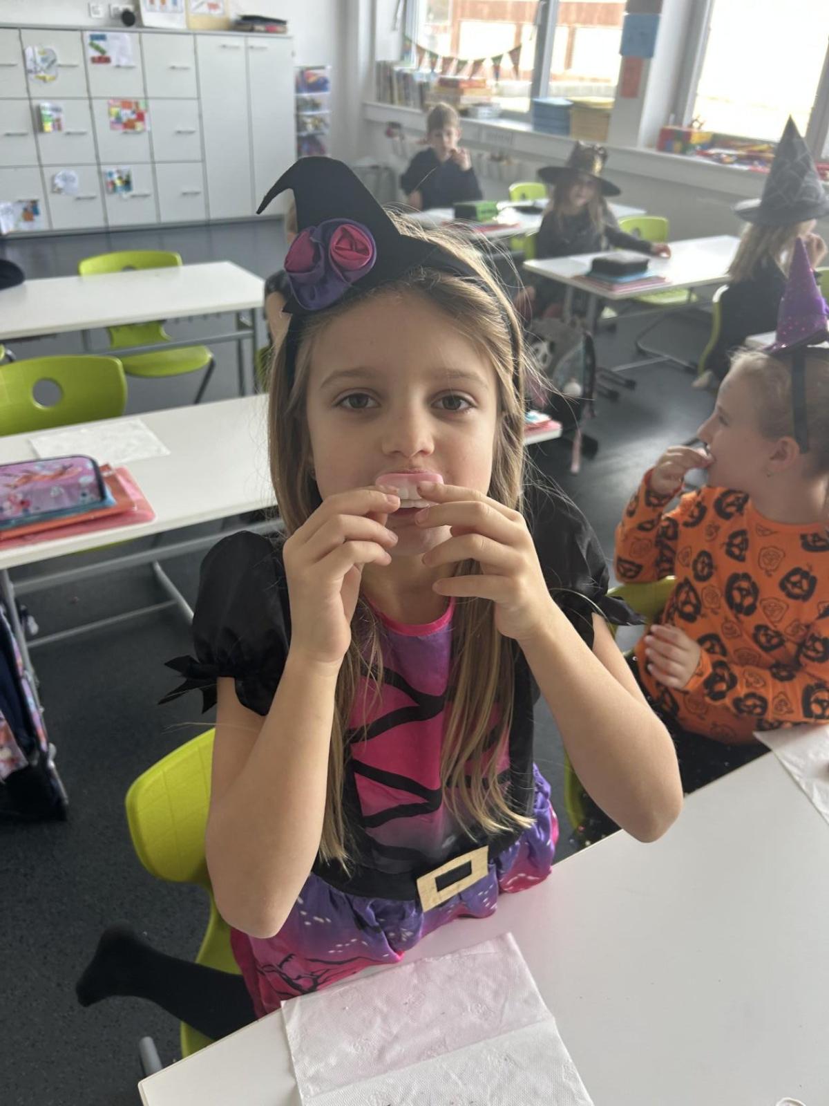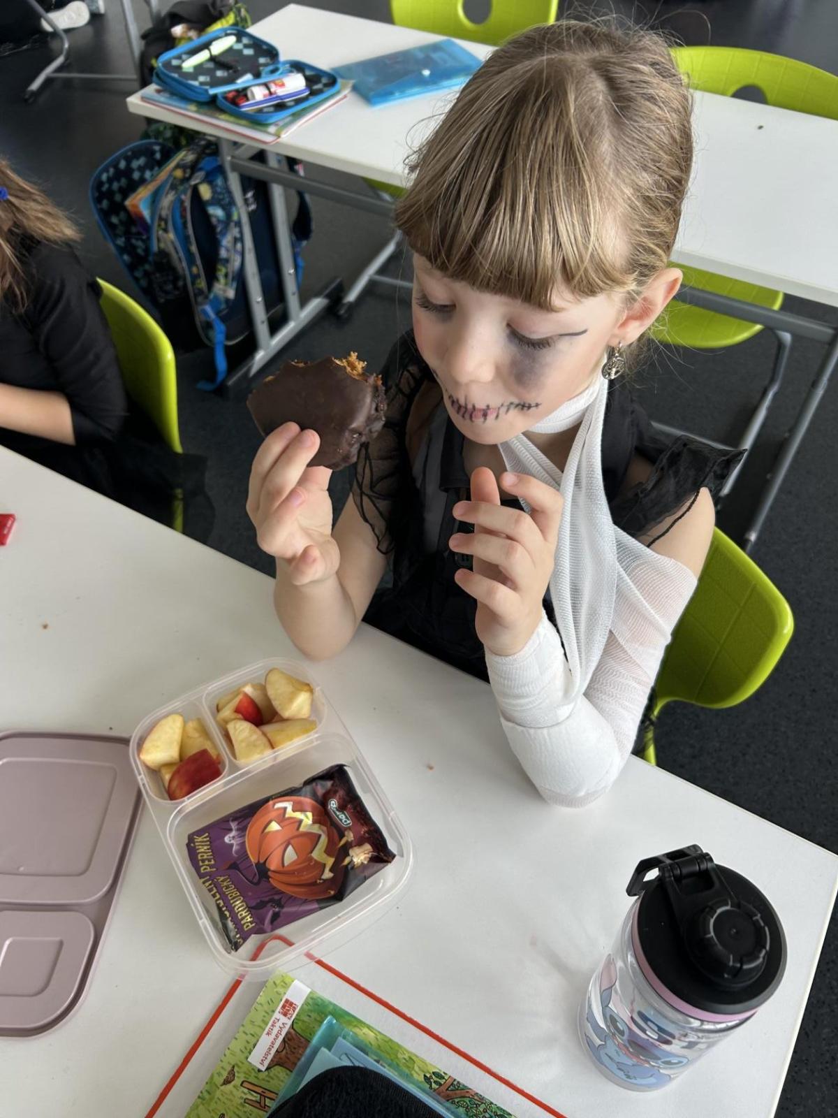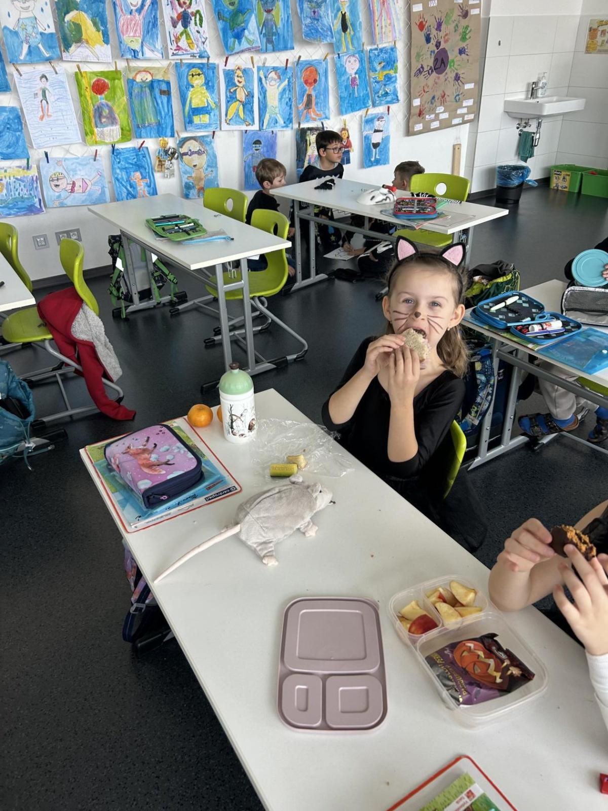 O velké přestávce jsme si pochutnali na úžasné halloweenské hostině. Děti přinesly muffiny, sušenky, slané dobroty, tematické sladkosti i ovoce.