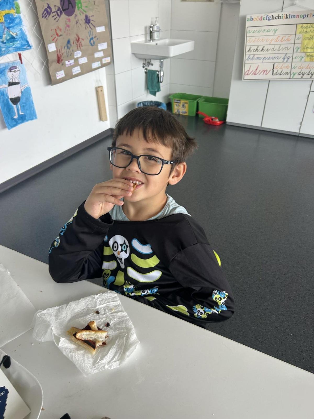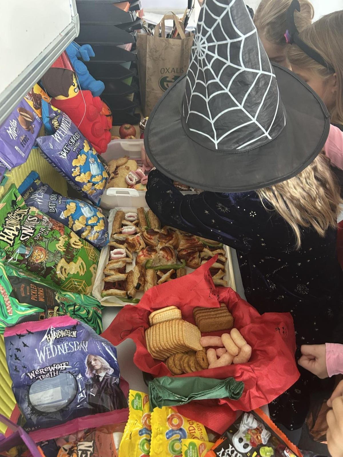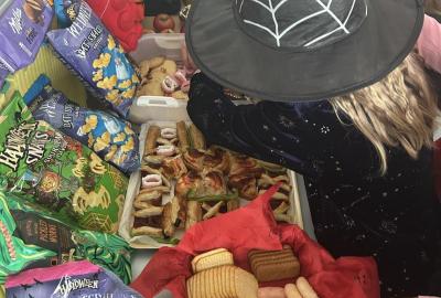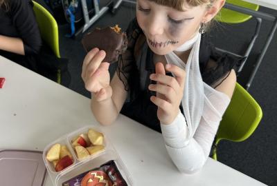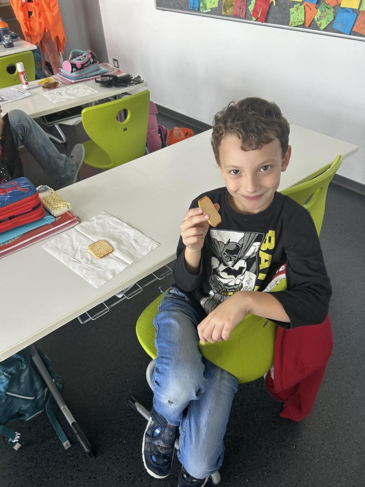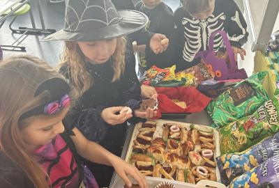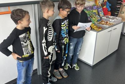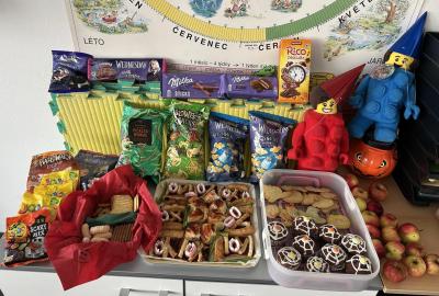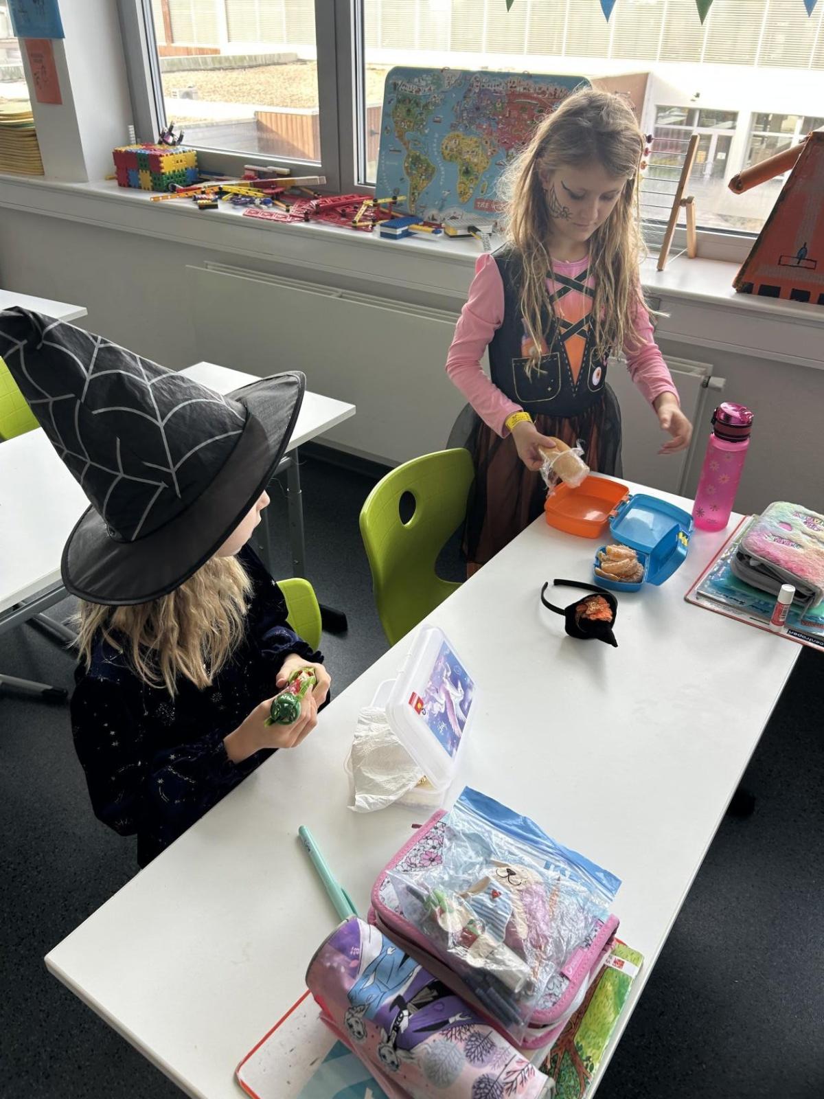 O velké přestávce jsme si pochutnali na úžasné halloweenské hostině. Děti přinesly muffiny, sušenky, slané dobroty, tematické sladkosti i ovoce.