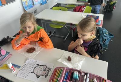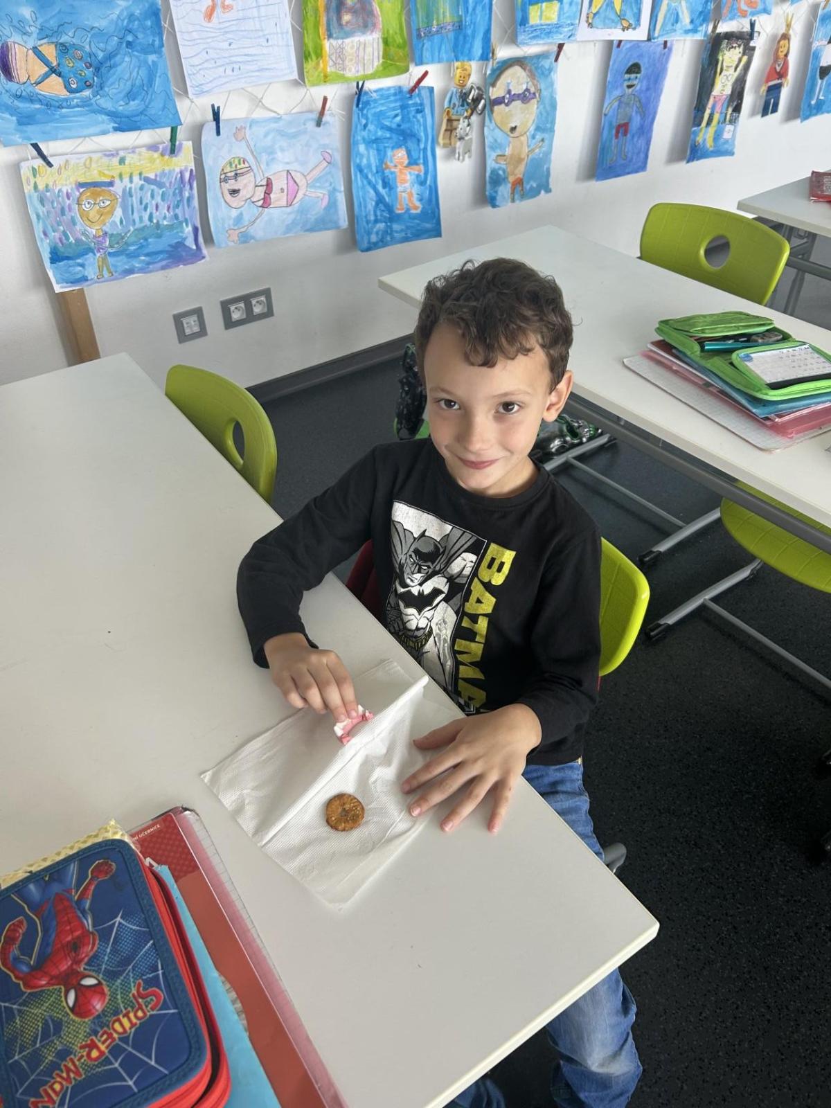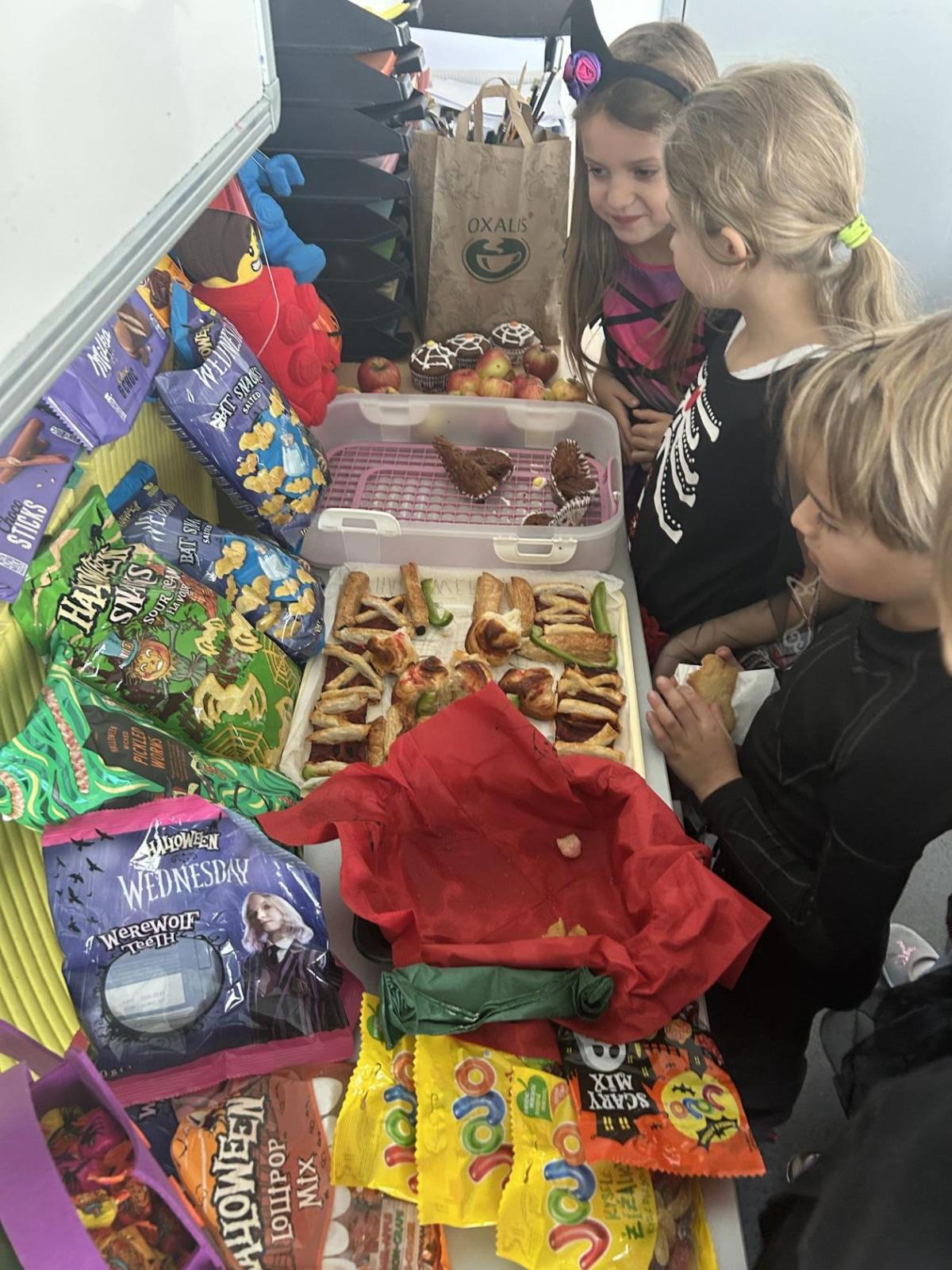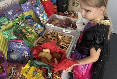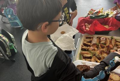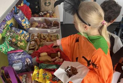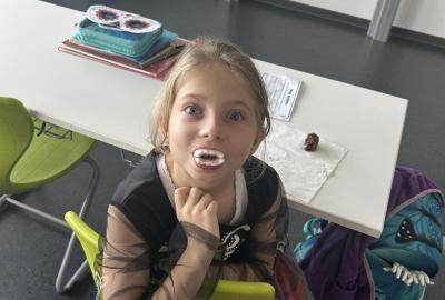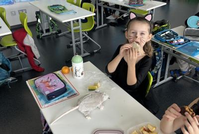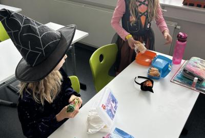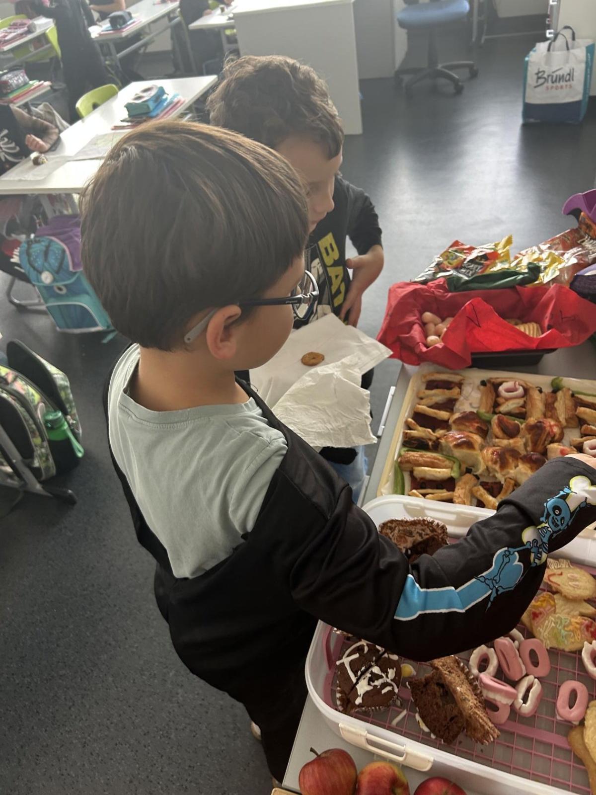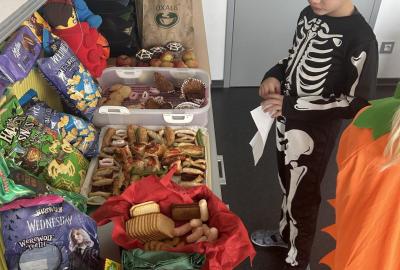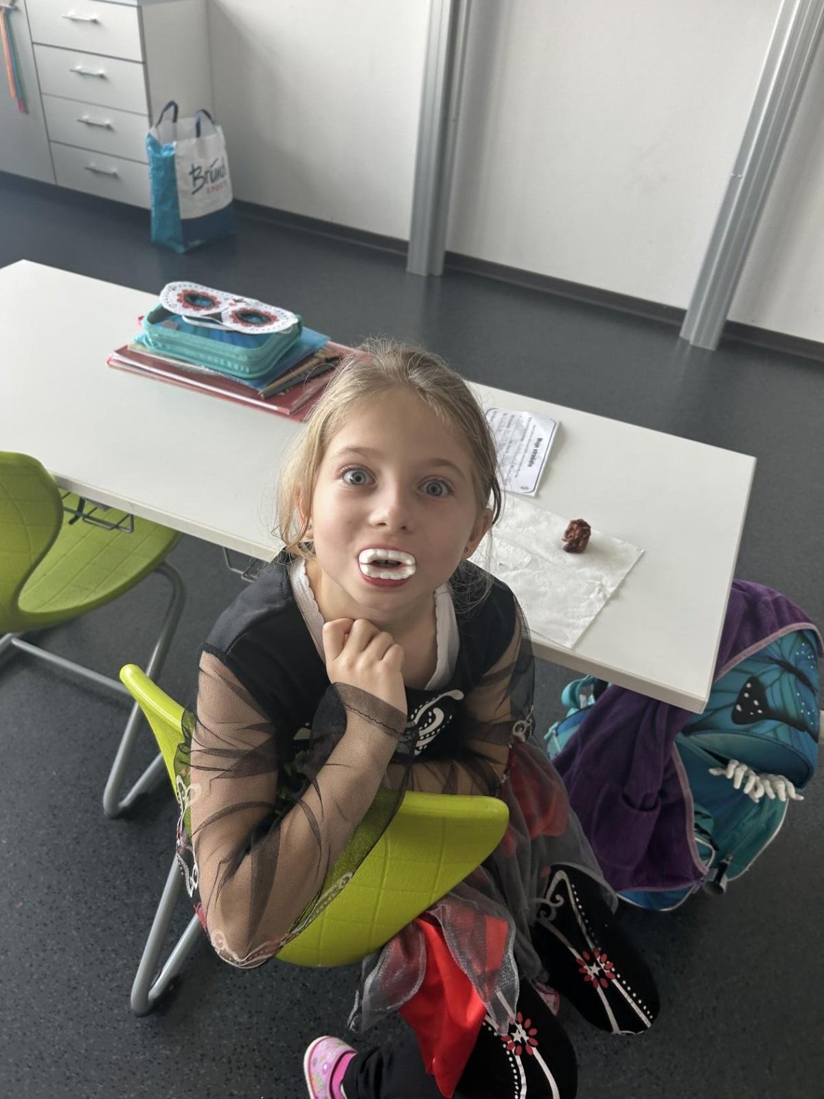 O velké přestávce jsme si pochutnali na úžasné halloweenské hostině. Děti přinesly muffiny, sušenky, slané dobroty, tematické sladkosti i ovoce.