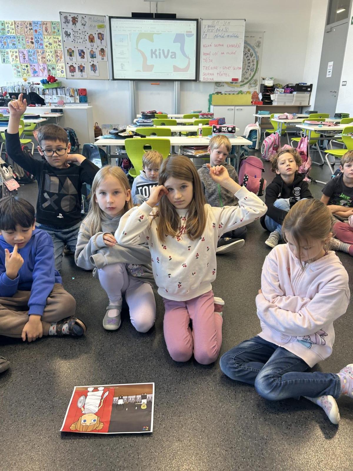 Nejprve jsme se vrátili k předchozí KiVa lekci. Povídali jsme si o emocích – jak je poznáme, jak se projevují a proč jsou důležité. Děti sdílely, kdy se během posledních dní setkaly s nějakou výraznou emocí, jak ji u jiných poznaly nebo se svou vlastní pracovaly.