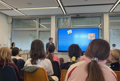 My jsme se zúčastnili jedné vyučovací hodiny, během které jsme zhlédli čtyři velmi zajímavé prezentace. Každý z prezentujících měl přibližně 10–12 minut na své vystoupení a následně odpovídal na dotazy publika i „poroty“.