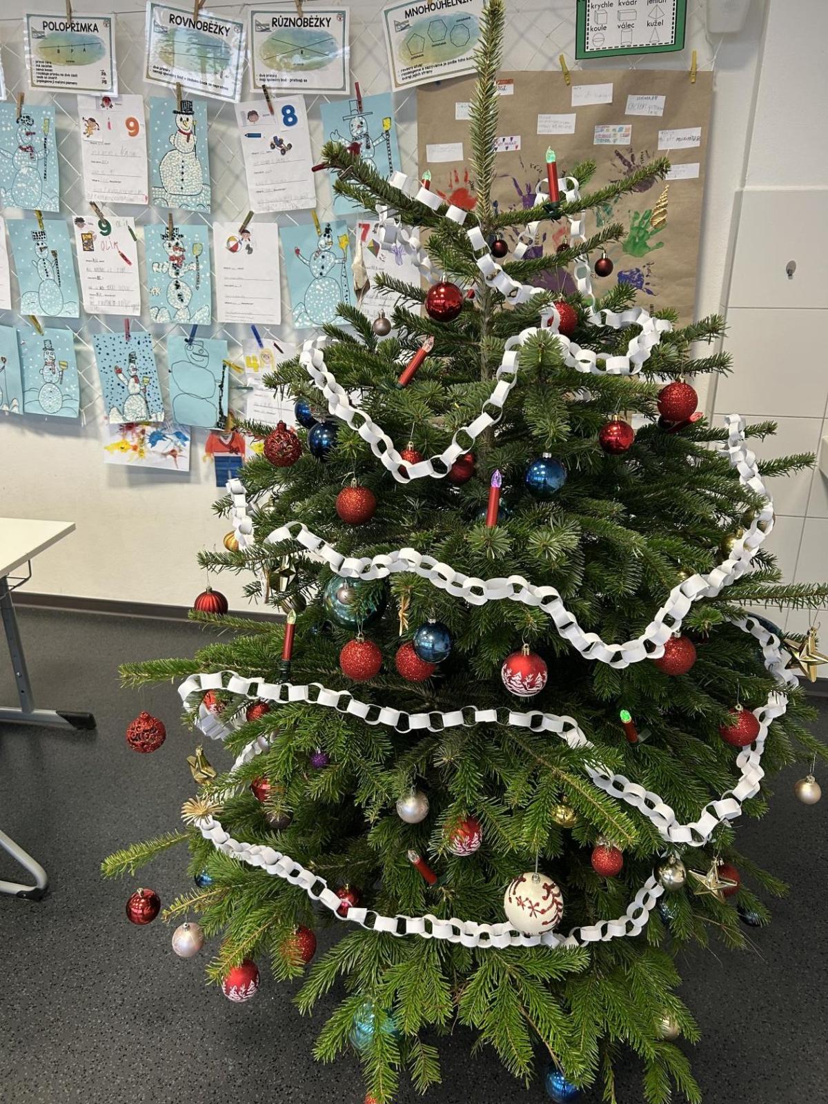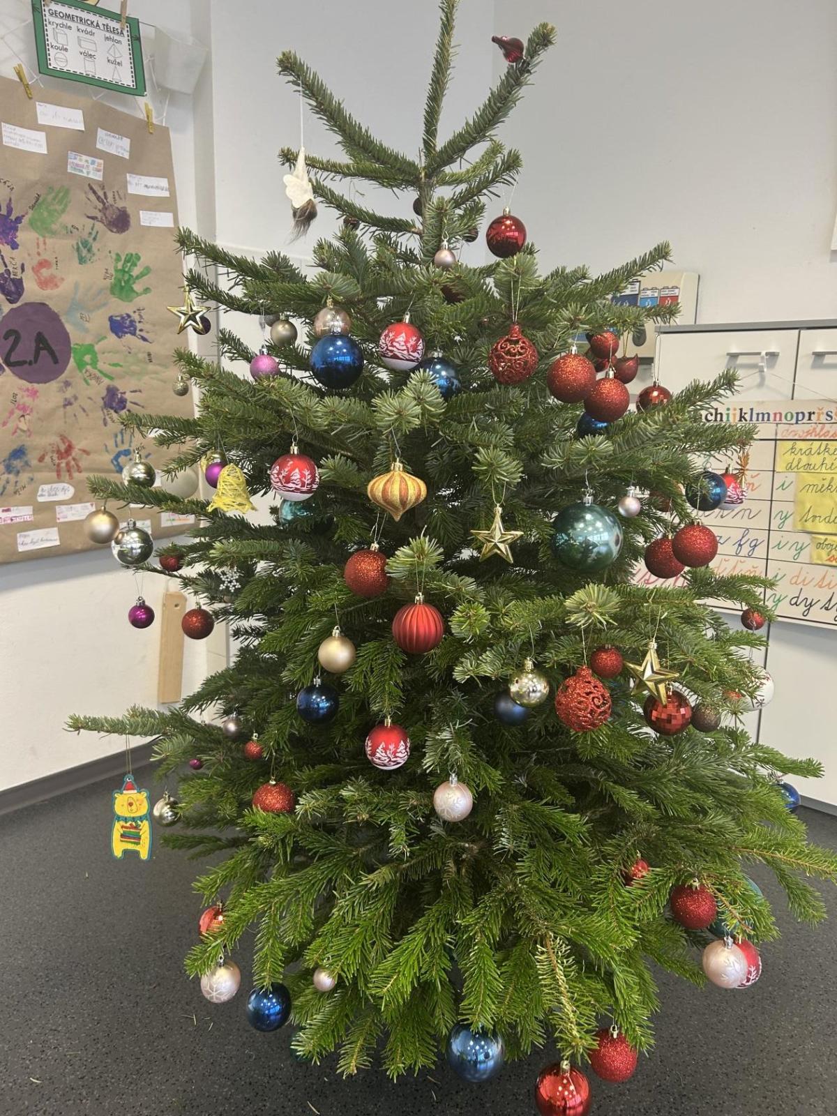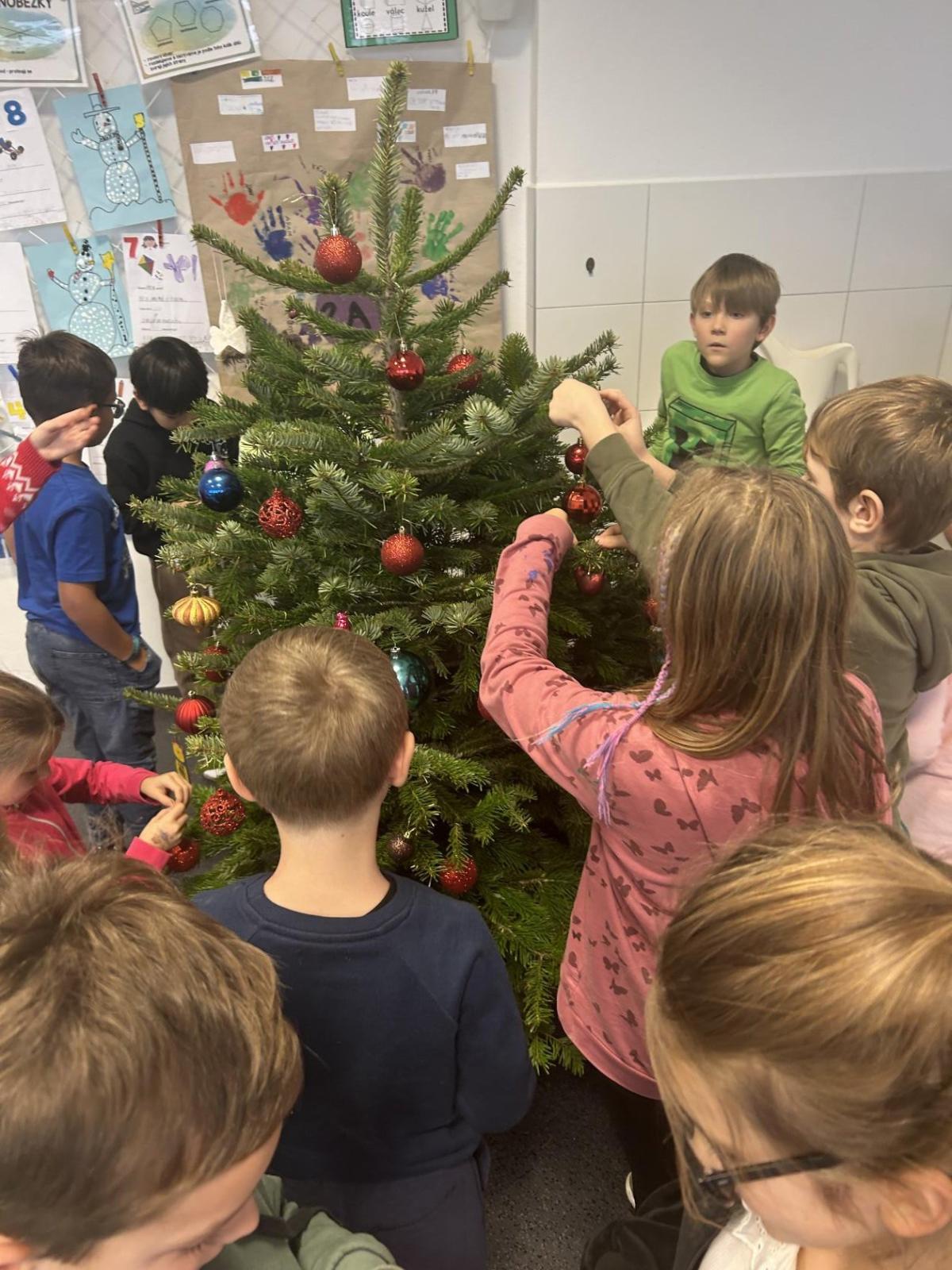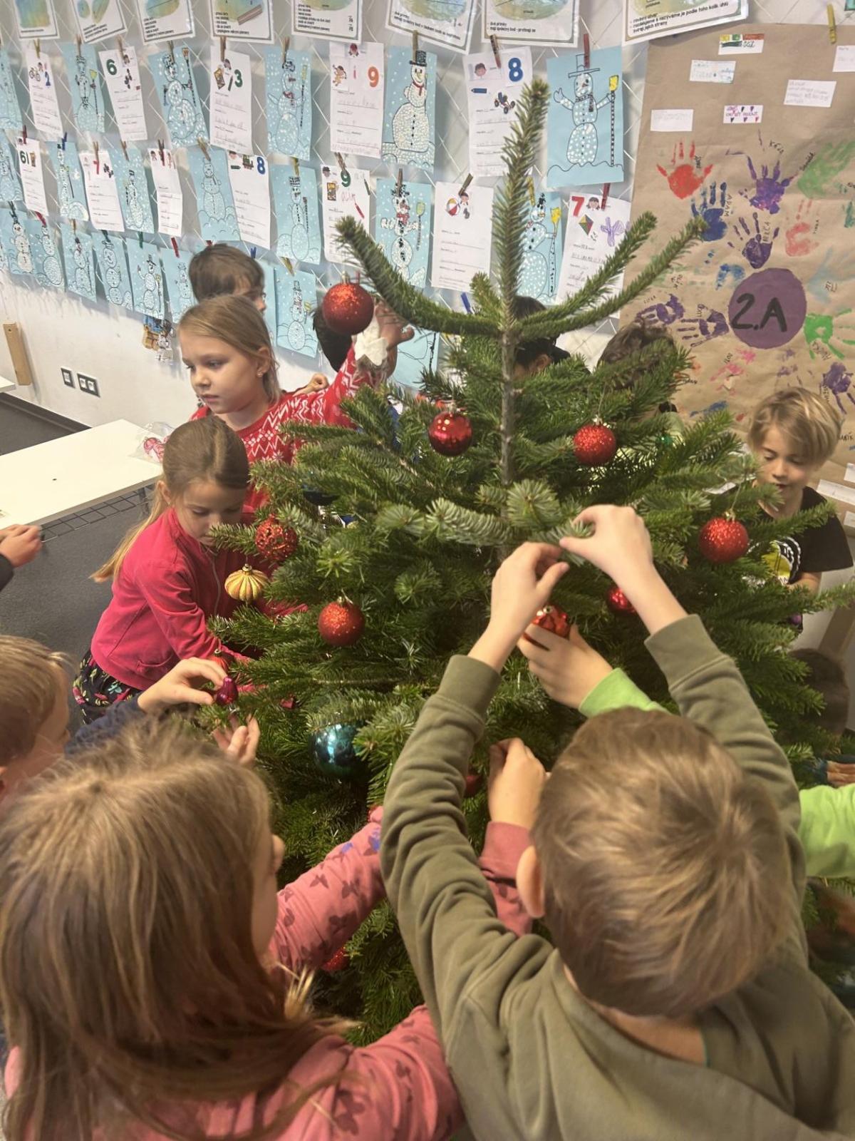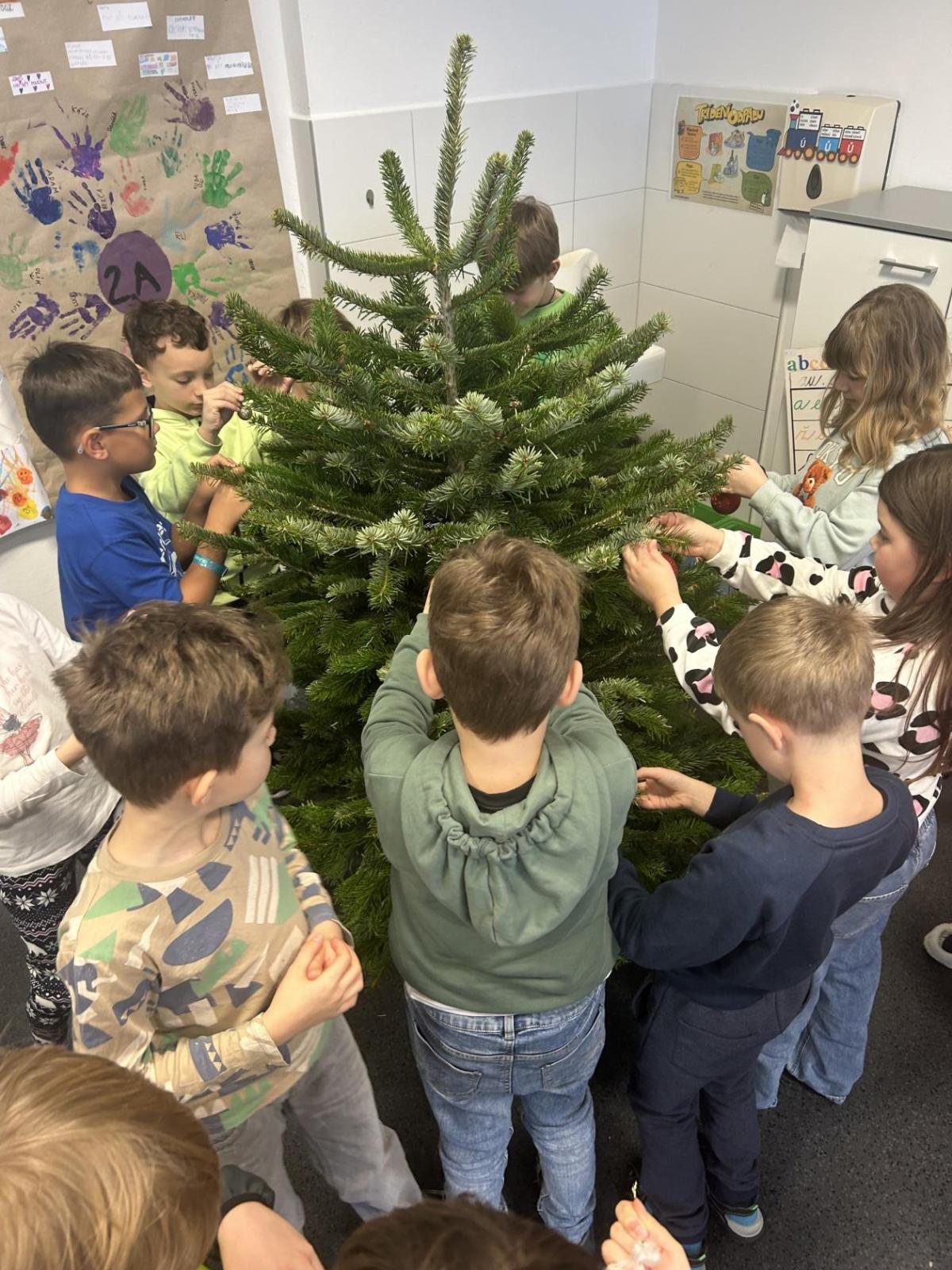 Ve škole nám pan školník usadil stromeček do stojánku. Poté přišla ta nejhezčí část – zdobení. Druháčci si přinesli vánoční ozdoby, společně si vyrobili papírový řetěz a paní učitelka přinesla bezdrátové barevné svíčky. Pak už u nás ve třídě svítil nádherně ozdobený vánoční stromek a hned bylo znát, že Vánoce se opravdu blíží.