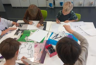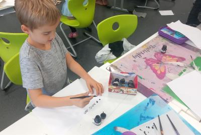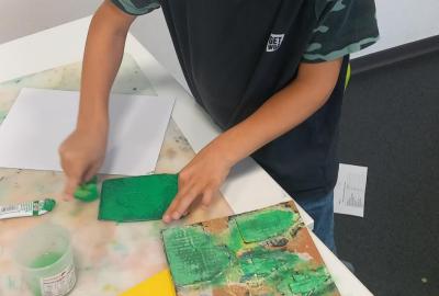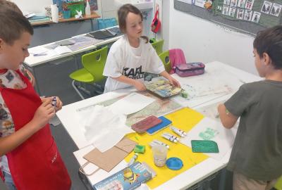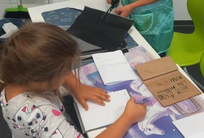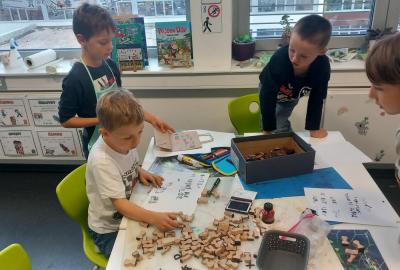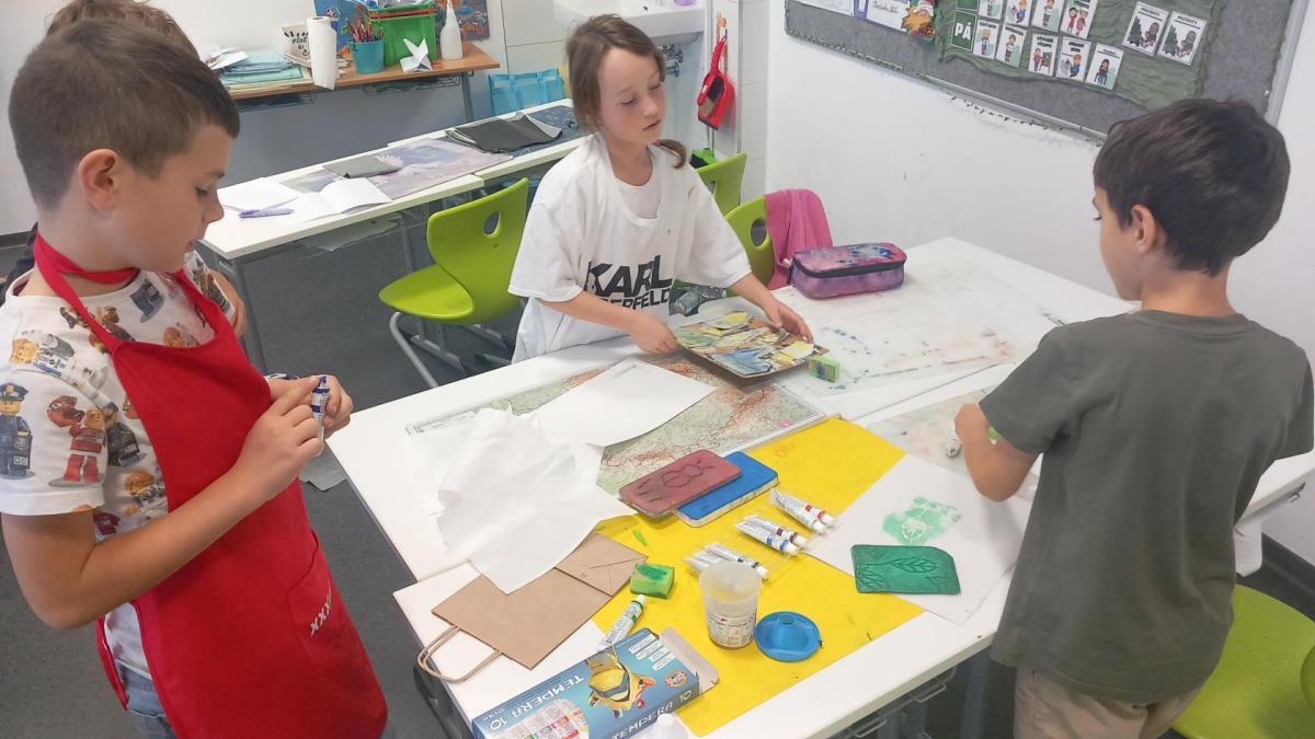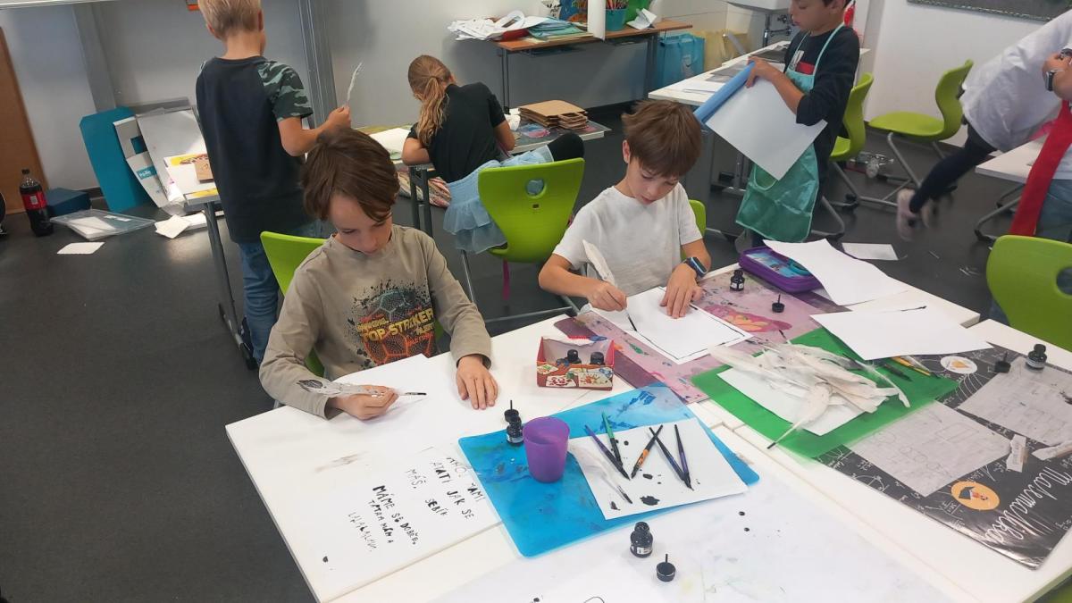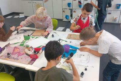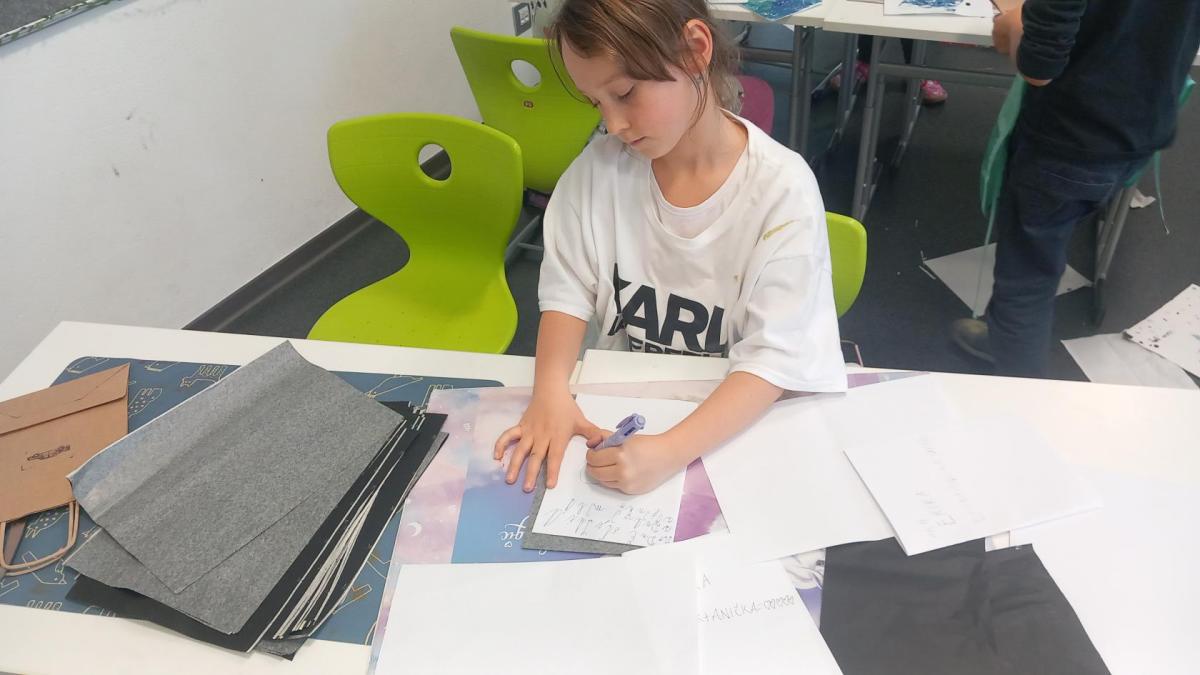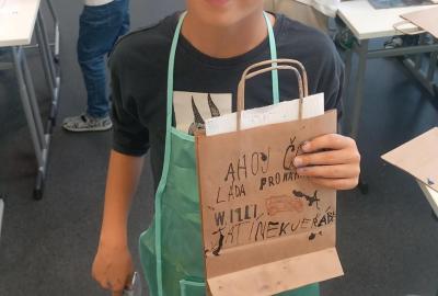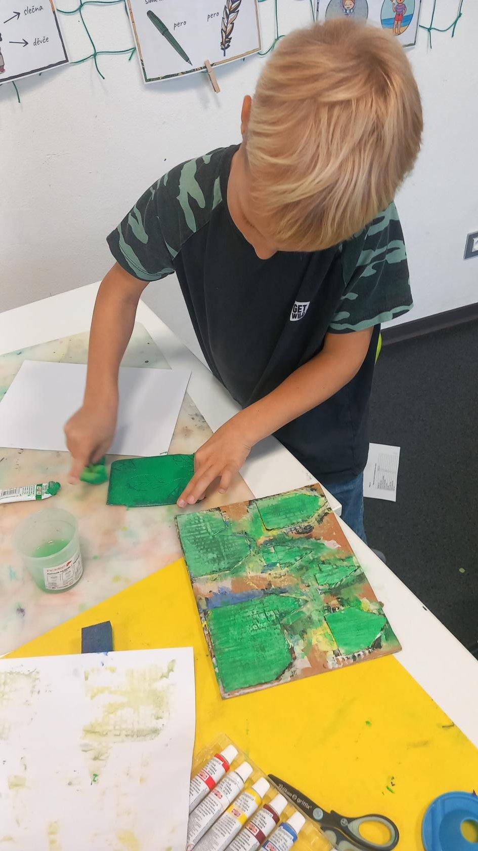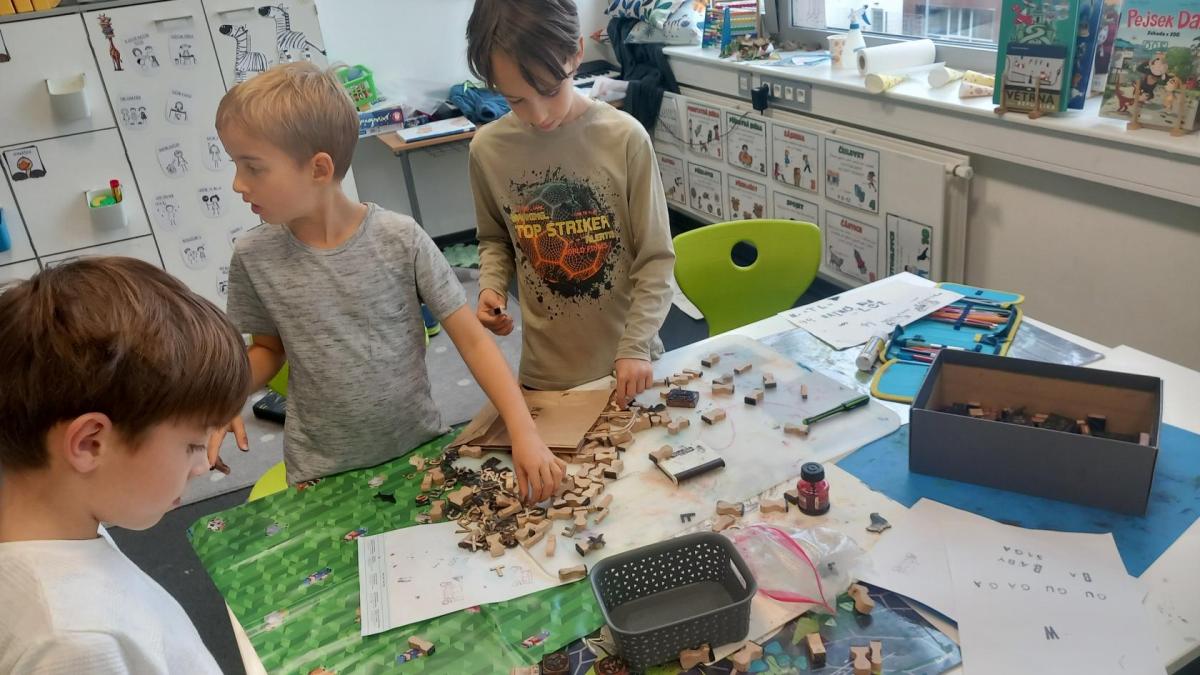 Měsíc jsme na projektové výuce probírali způsoby komunikace a vývoj písma od jeskynních maleb až po současné fungování offsetové tiskárny v závodech s metodou CMYK. Závěrečný workshop projektu měl u dětí velký úspěch. Rozdělili jsme si třídu na několik stanovišť, kde bylo možné si vyzkoušet různé metody písma, psacích nástrojů a tiskařských technik. Jak se psalo písařům na hradě, jak to měl Gutenberg vychytané a co nám přinesla moderní technika? Jaké tiskařské metody máme dnes a jak se asi psalo našim babičkám a dědečkům ve škole? To vše jsme si vyzkoušeli a vytvořili si malé dárečky. Jen ten úklid :D