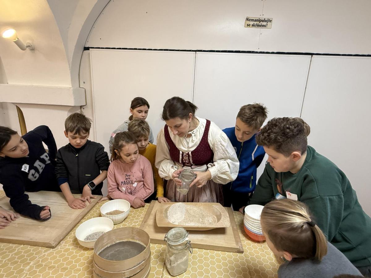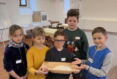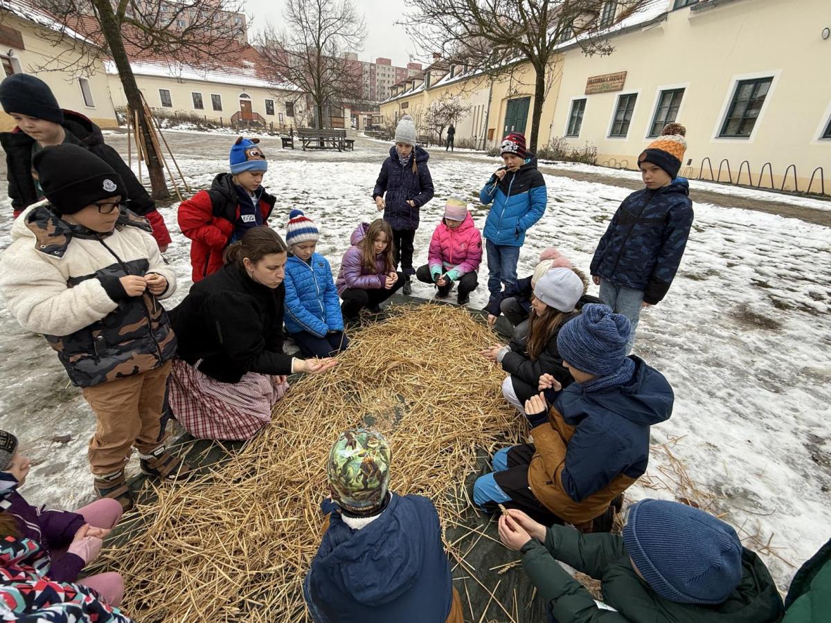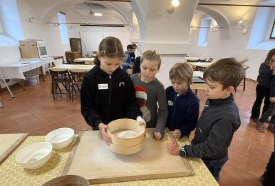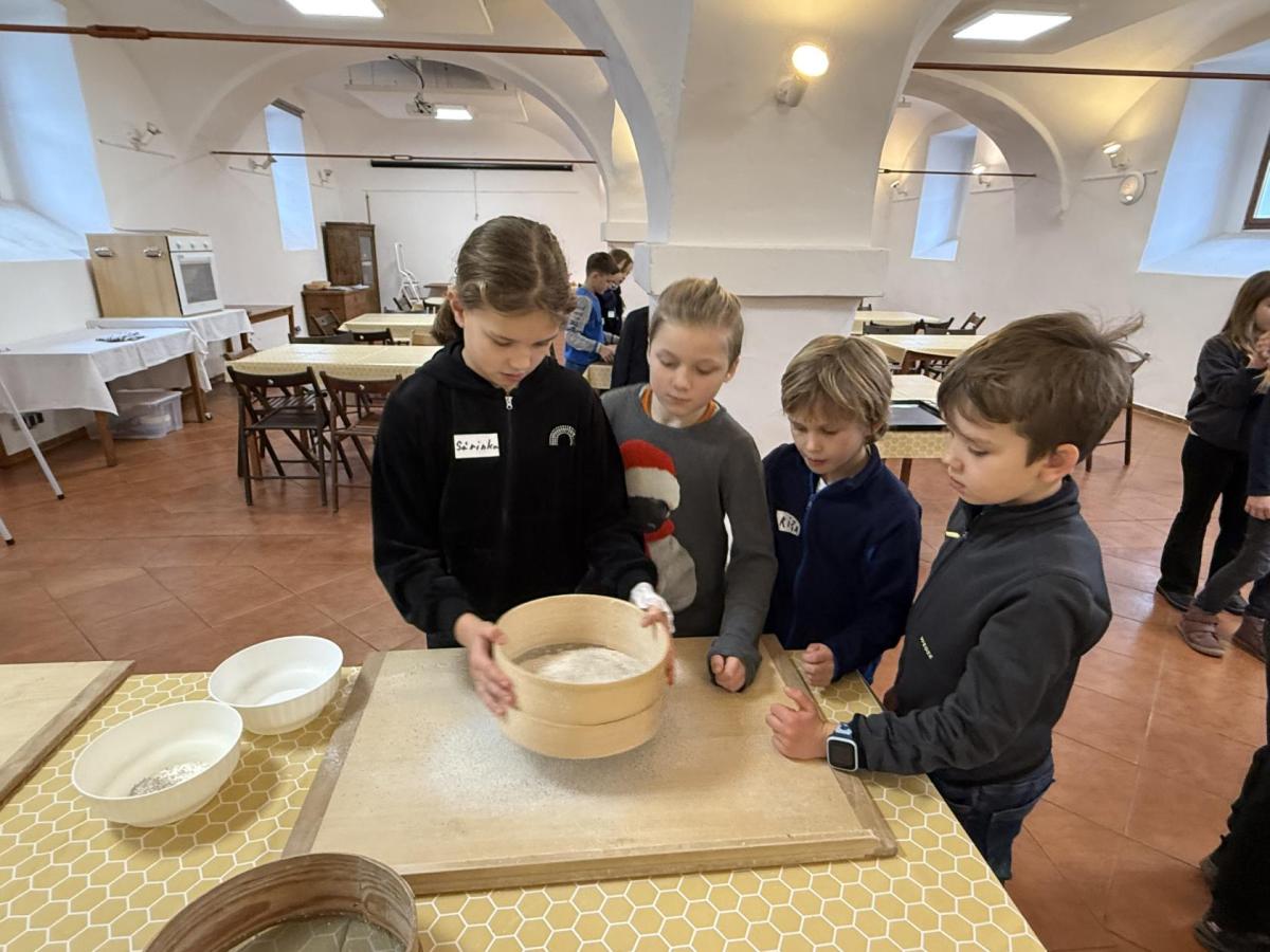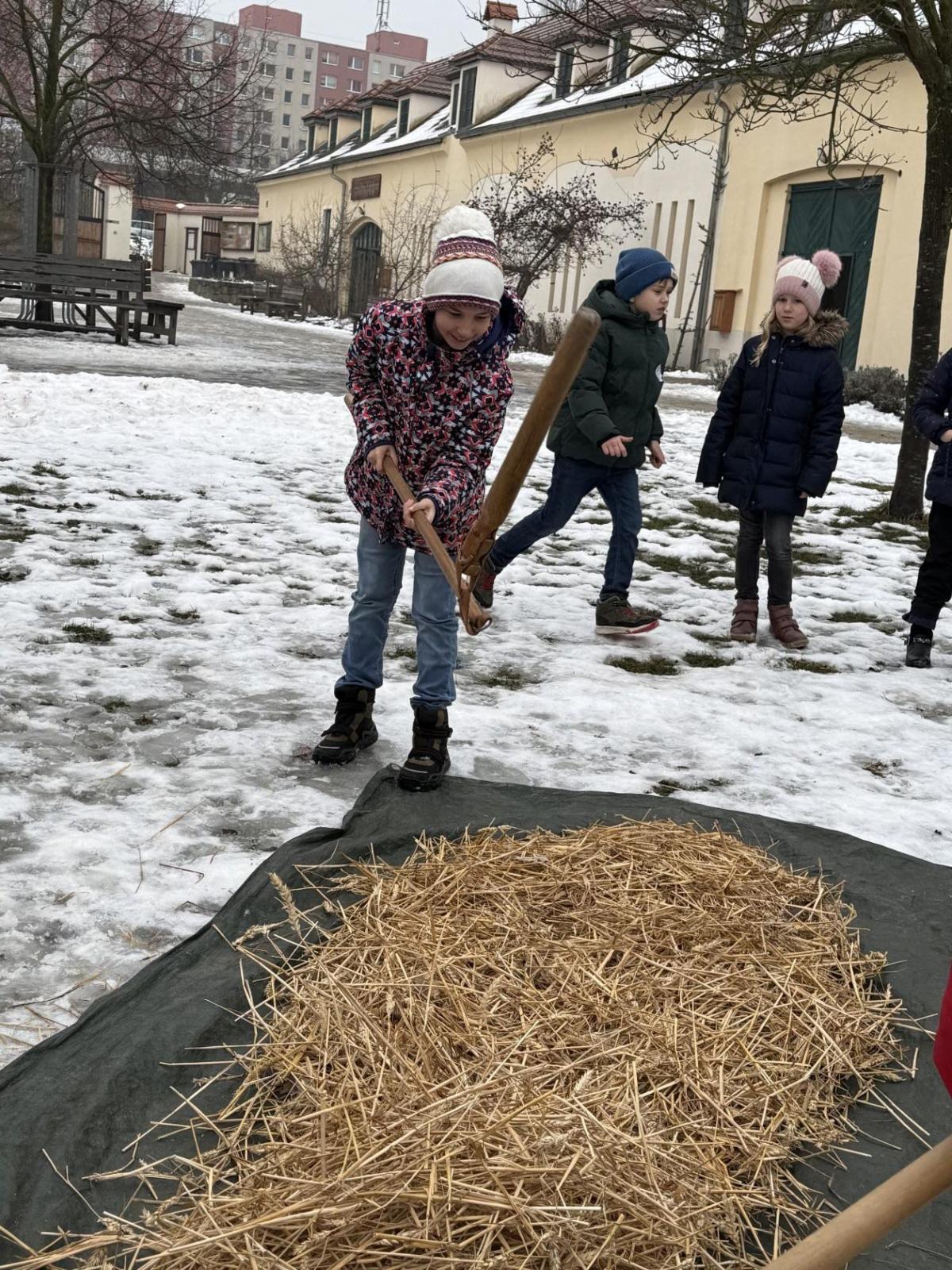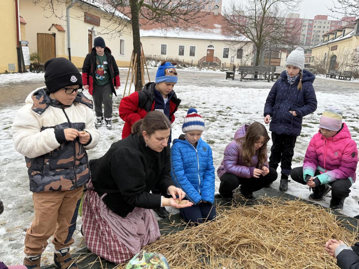 S dětmi jsme se vydali do Toulcova dvora na výukový program Cesta k chlebu, kde si děti mohly vyzkoušet, kolik práce se skrývá za jedním malým bochníkem chleba. Děti se nejprve seznámily, jak se z klasu obilí vymlátí zrno, tedy oddělí zrno od klasu. Následovalo mletí mouky, při kterém si uvědomily, jak je to těžká a poctivá práce. Umletou mouku přesely, aby byla jemná a připravená na samotné pečení. Poté zadělaly na těsto a upekly si svůj vlastní chleba. Některé děti nevydržely a chleba snědly už po cestě do školy. Ve škole jsme si ještě společně vysvětlili poměry surovin, aby si děti dokázaly představit, jak se liší chleba žitný a pšeničný a mohly si přizpůsobit chleba své chuti.