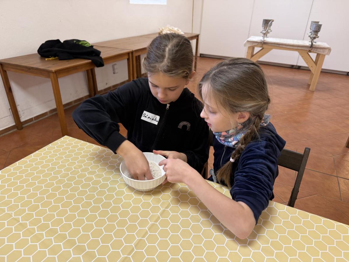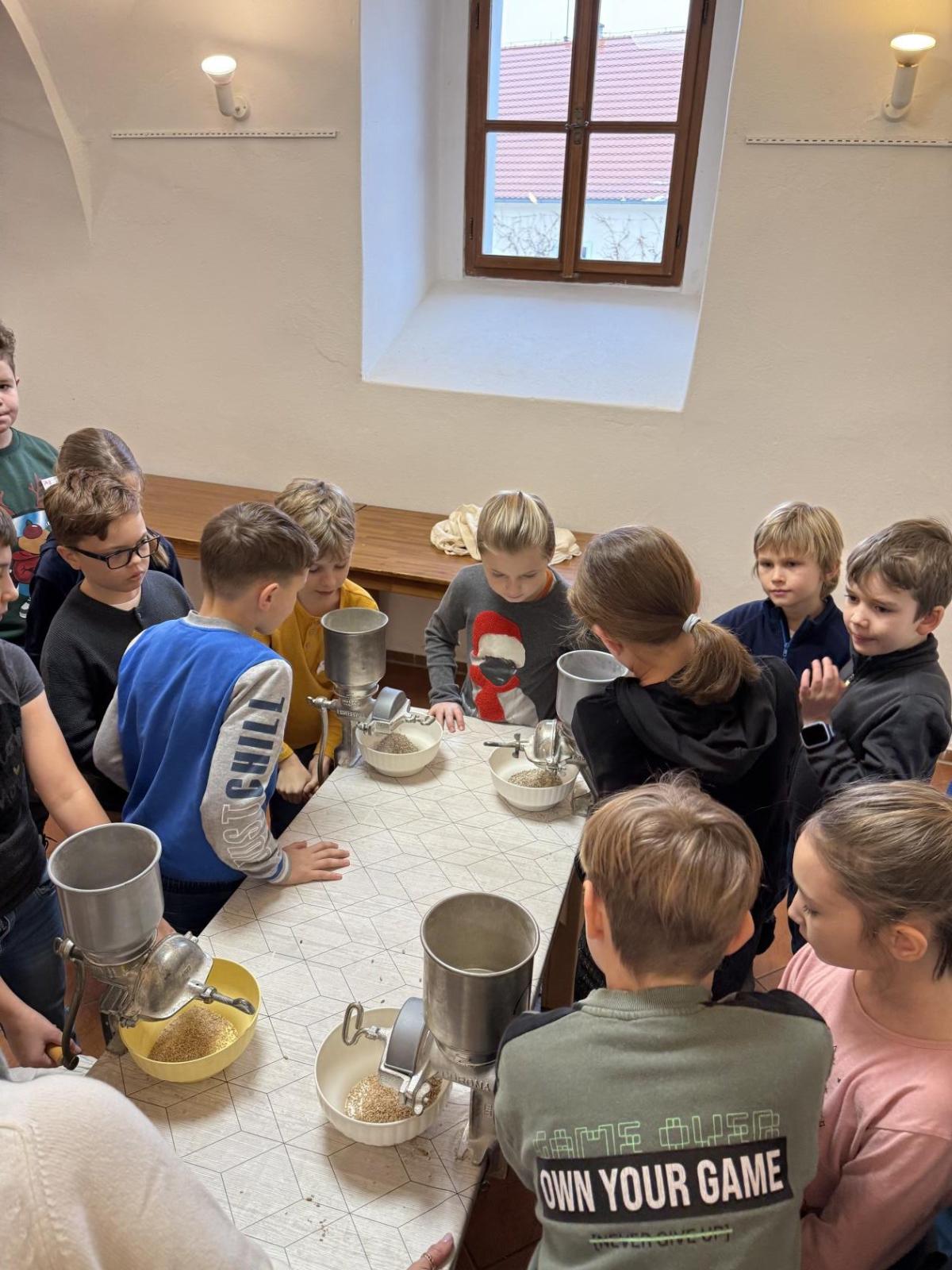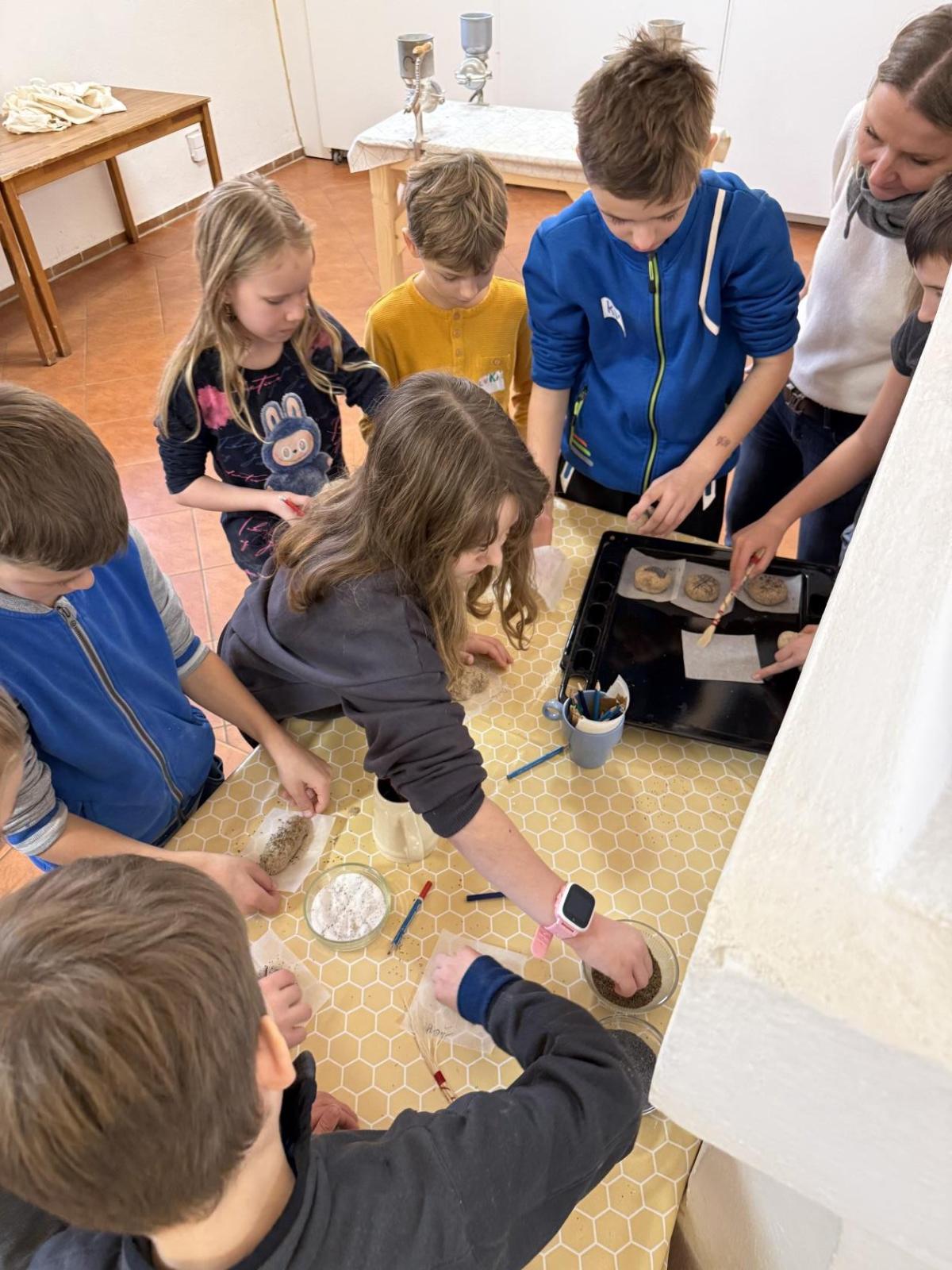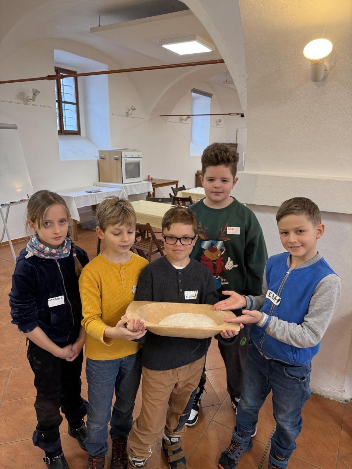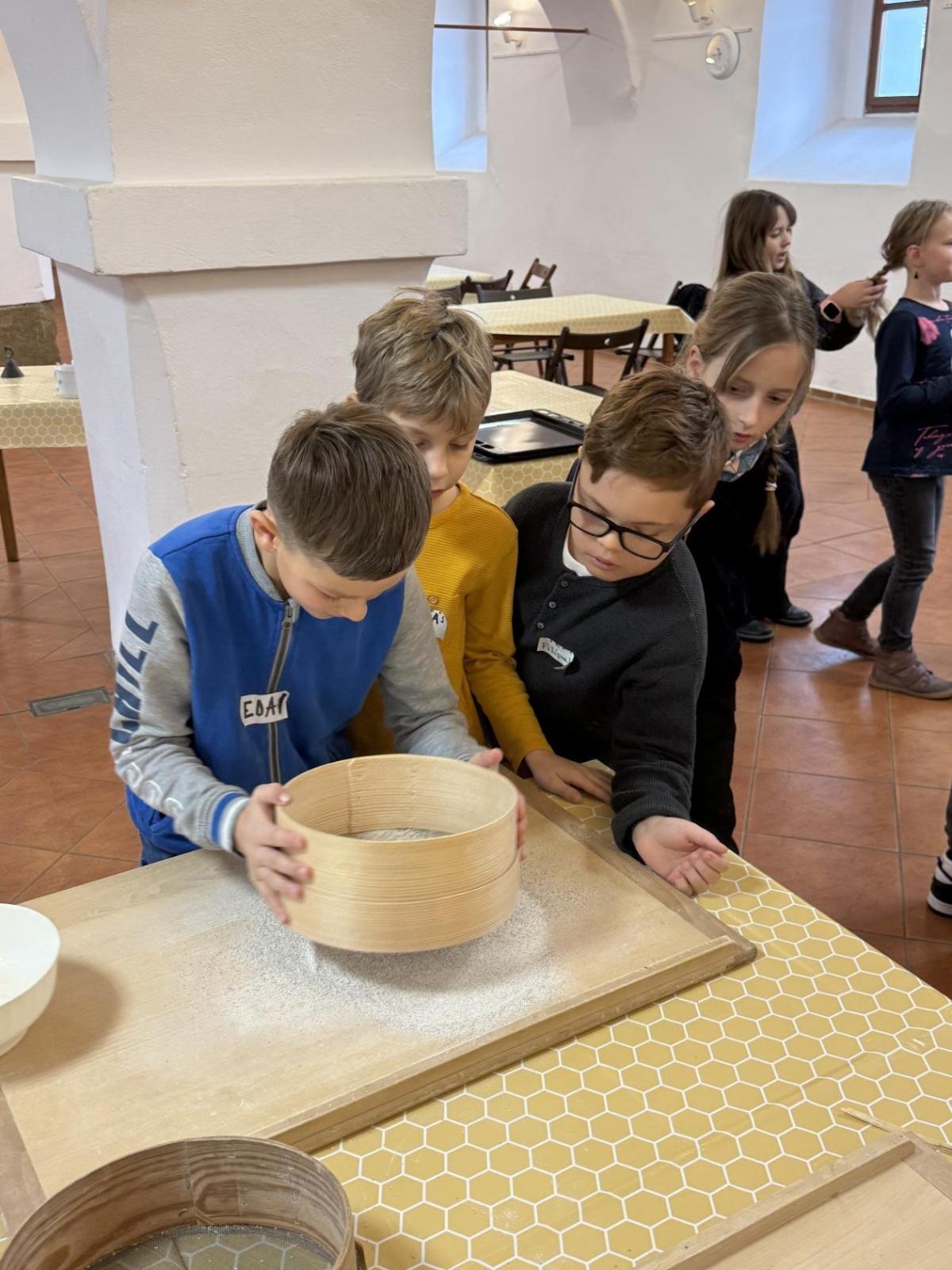 S dětmi jsme se vydali do Toulcova dvora na výukový program Cesta k chlebu, kde si děti mohly vyzkoušet, kolik práce se skrývá za jedním malým bochníkem chleba. Děti se nejprve seznámily, jak se z klasu obilí vymlátí zrno, tedy oddělí zrno od klasu. Následovalo mletí mouky, při kterém si uvědomily, jak je to těžká a poctivá práce. Umletou mouku přesely, aby byla jemná a připravená na samotné pečení. Poté zadělaly na těsto a upekly si svůj vlastní chleba. Některé děti nevydržely a chleba snědly už po cestě do školy. Ve škole jsme si ještě společně vysvětlili poměry surovin, aby si děti dokázaly představit, jak se liší chleba žitný a pšeničný a mohly si přizpůsobit chleba své chuti.