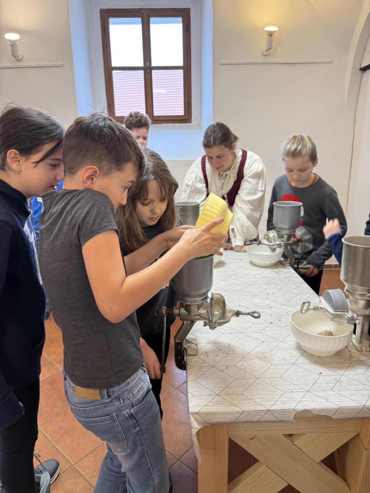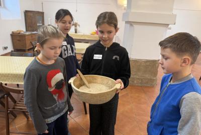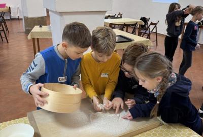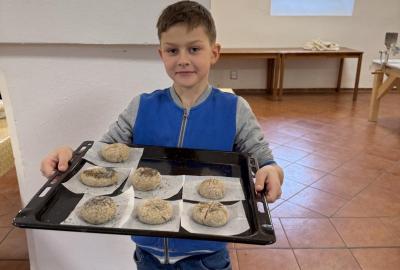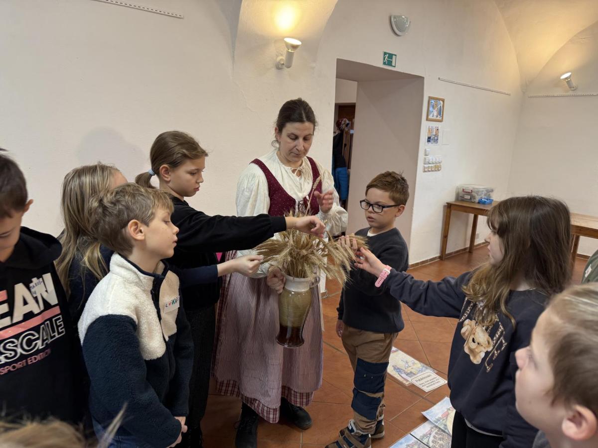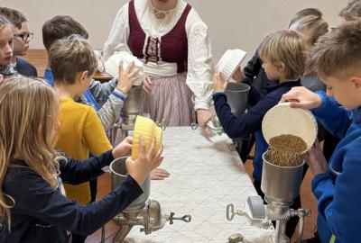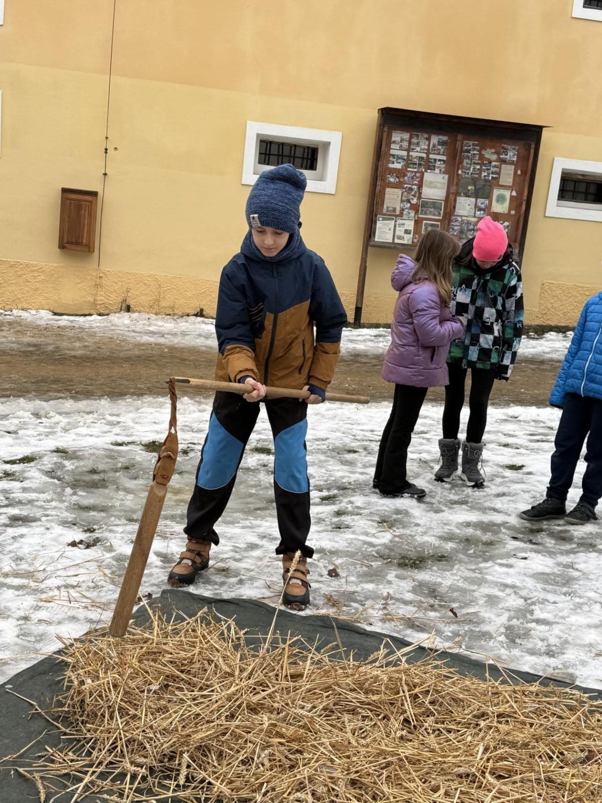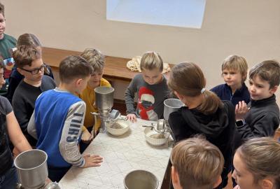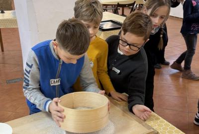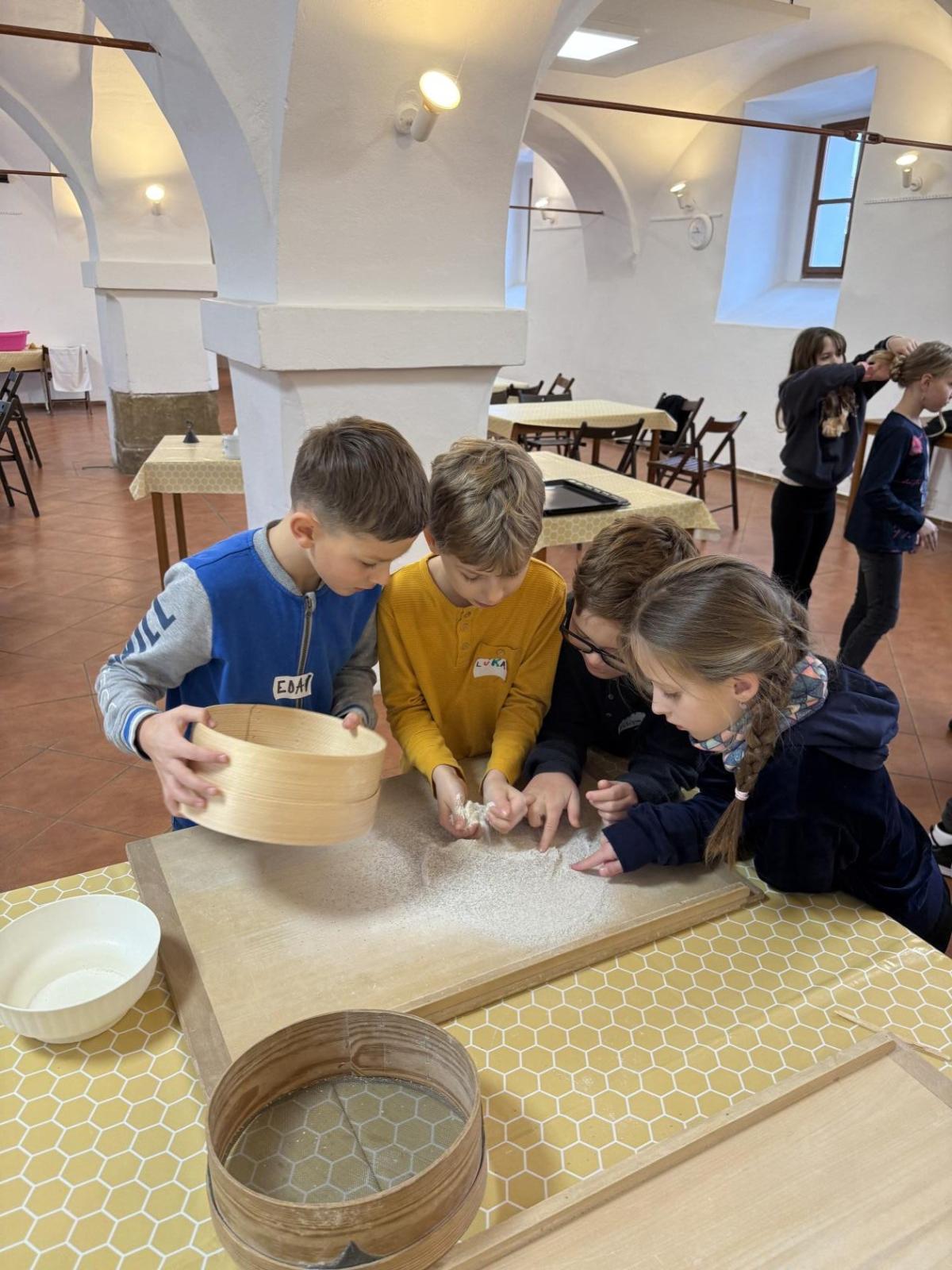S dětmi jsme se vydali do Toulcova dvora na výukový program Cesta k chlebu, kde si děti mohly vyzkoušet, kolik práce se skrývá za jedním malým bochníkem chleba. Děti se nejprve seznámily, jak se z klasu obilí vymlátí zrno, tedy oddělí zrno od klasu. Následovalo mletí mouky, při kterém si uvědomily, jak je to těžká a poctivá práce. Umletou mouku přesely, aby byla jemná a připravená na samotné pečení. Poté zadělaly na těsto a upekly si svůj vlastní chleba. Některé děti nevydržely a chleba snědly už po cestě do školy. Ve škole jsme si ještě společně vysvětlili poměry surovin, aby si děti dokázaly představit, jak se liší chleba žitný a pšeničný a mohly si přizpůsobit chleba své chuti.