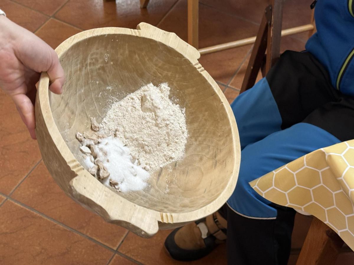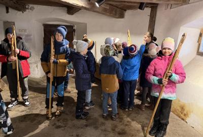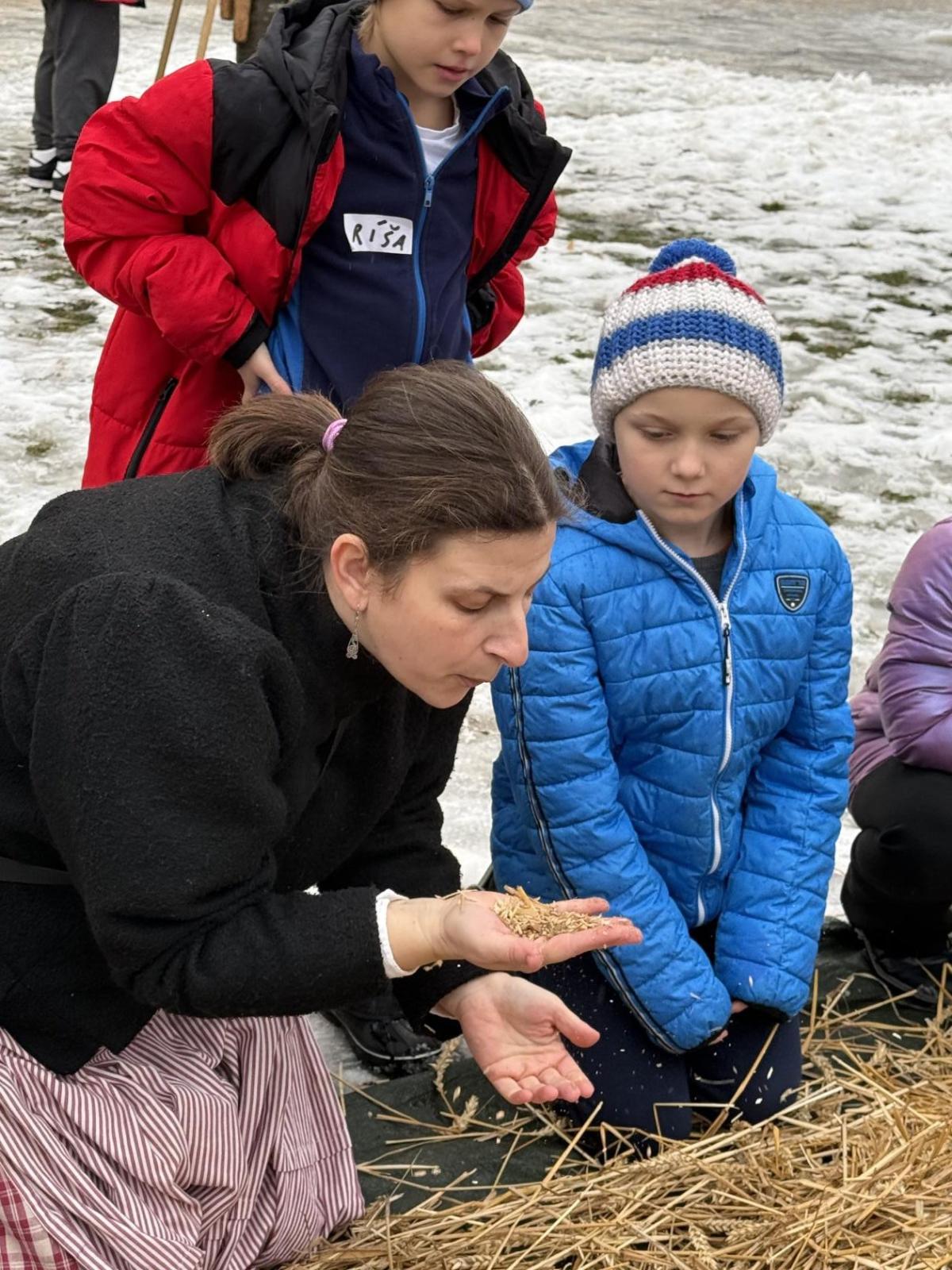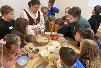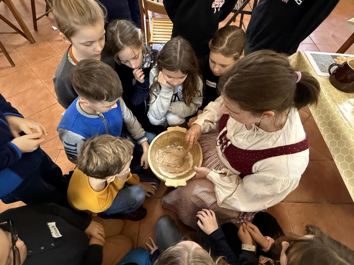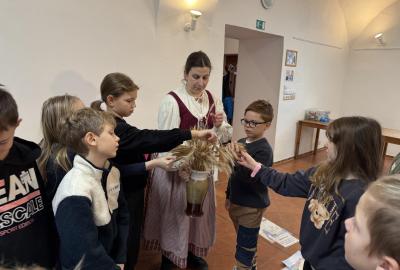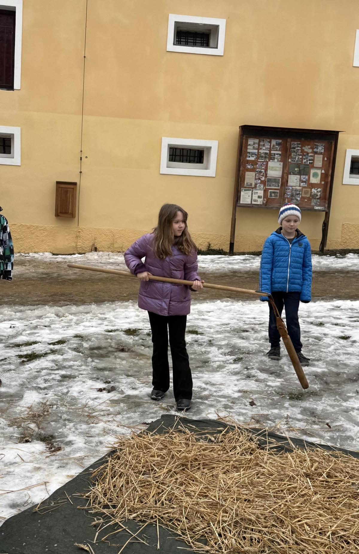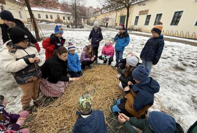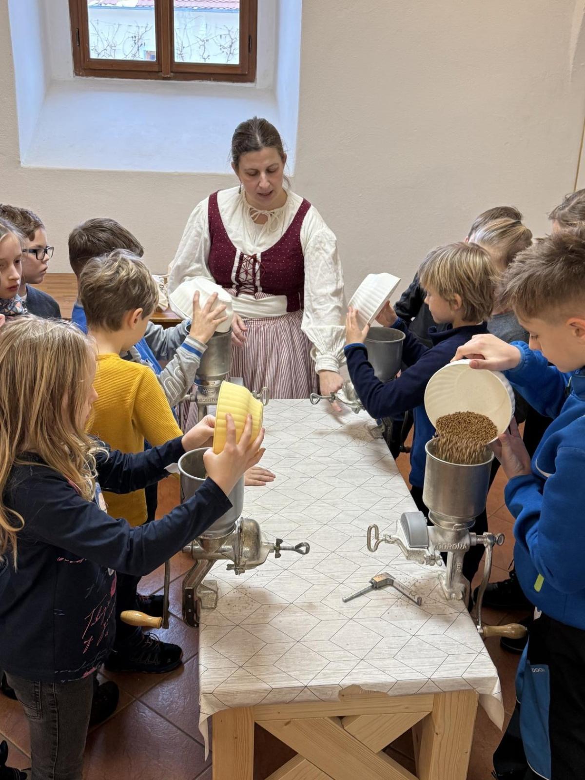 S dětmi jsme se vydali do Toulcova dvora na výukový program Cesta k chlebu, kde si děti mohly vyzkoušet, kolik práce se skrývá za jedním malým bochníkem chleba. Děti se nejprve seznámily, jak se z klasu obilí vymlátí zrno, tedy oddělí zrno od klasu. Následovalo mletí mouky, při kterém si uvědomily, jak je to těžká a poctivá práce. Umletou mouku přesely, aby byla jemná a připravená na samotné pečení. Poté zadělaly na těsto a upekly si svůj vlastní chleba. Některé děti nevydržely a chleba snědly už po cestě do školy. Ve škole jsme si ještě společně vysvětlili poměry surovin, aby si děti dokázaly představit, jak se liší chleba žitný a pšeničný a mohly si přizpůsobit chleba své chuti.