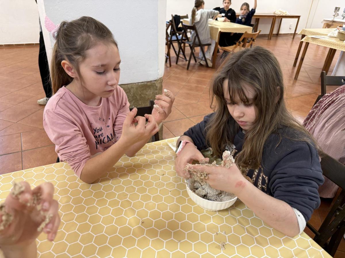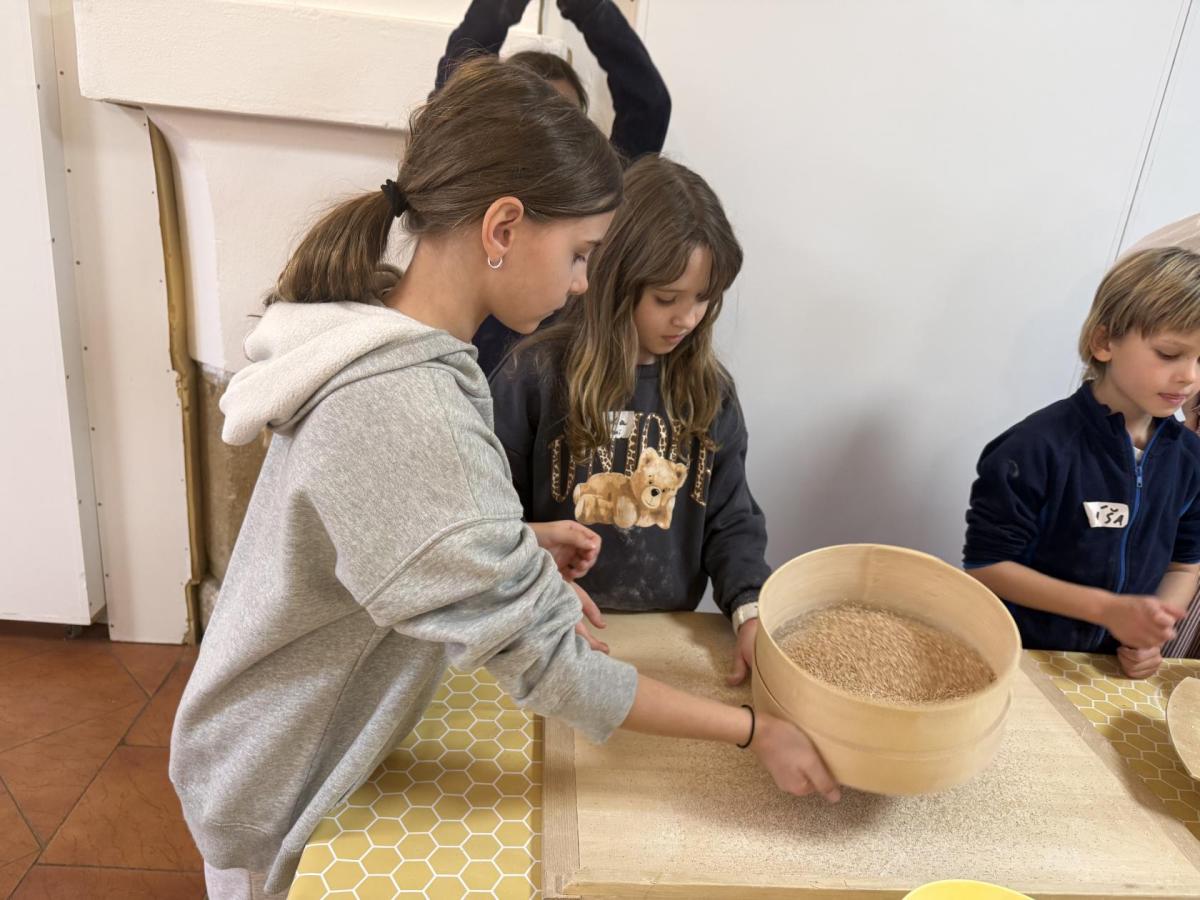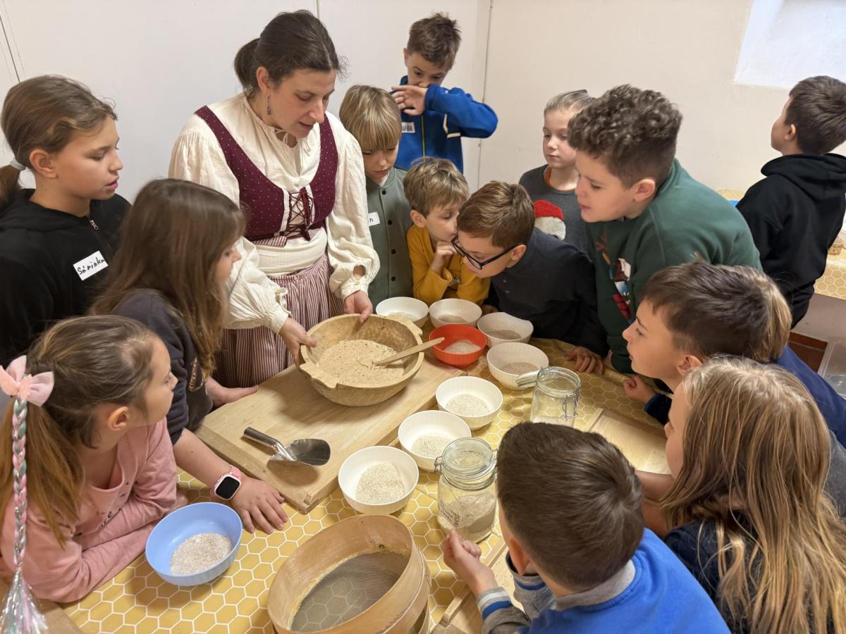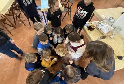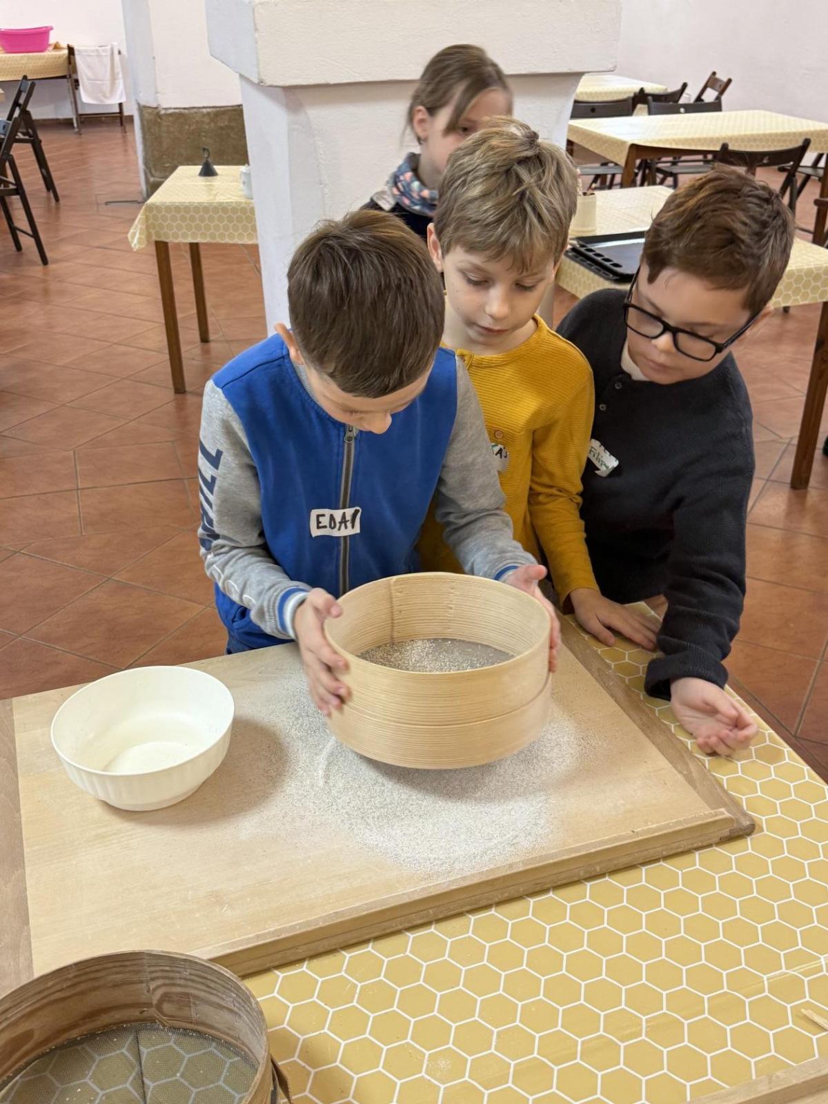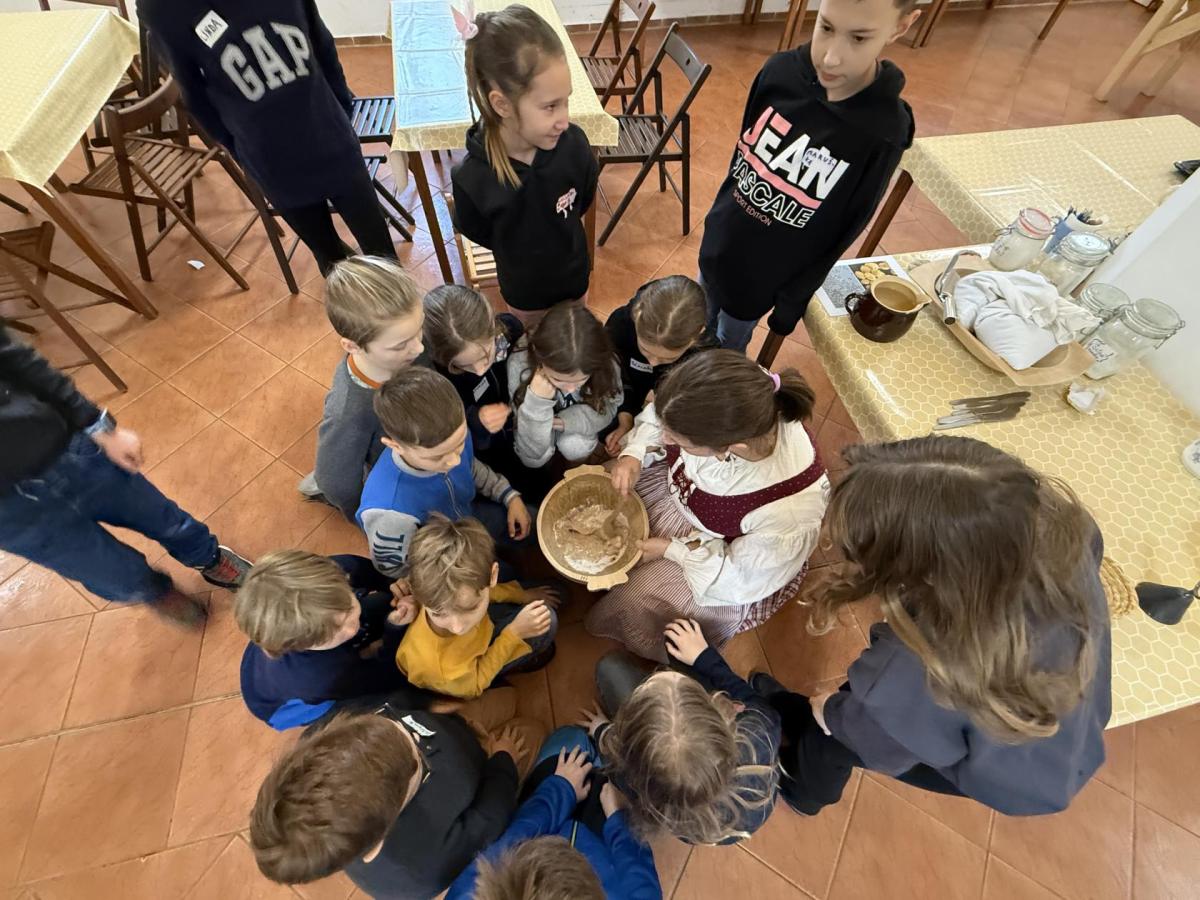 S dětmi jsme se vydali do Toulcova dvora na výukový program Cesta k chlebu, kde si děti mohly vyzkoušet, kolik práce se skrývá za jedním malým bochníkem chleba. Děti se nejprve seznámily, jak se z klasu obilí vymlátí zrno, tedy oddělí zrno od klasu. Následovalo mletí mouky, při kterém si uvědomily, jak je to těžká a poctivá práce. Umletou mouku přesely, aby byla jemná a připravená na samotné pečení. Poté zadělaly na těsto a upekly si svůj vlastní chleba. Některé děti nevydržely a chleba snědly už po cestě do školy. Ve škole jsme si ještě společně vysvětlili poměry surovin, aby si děti dokázaly představit, jak se liší chleba žitný a pšeničný a mohly si přizpůsobit chleba své chuti.