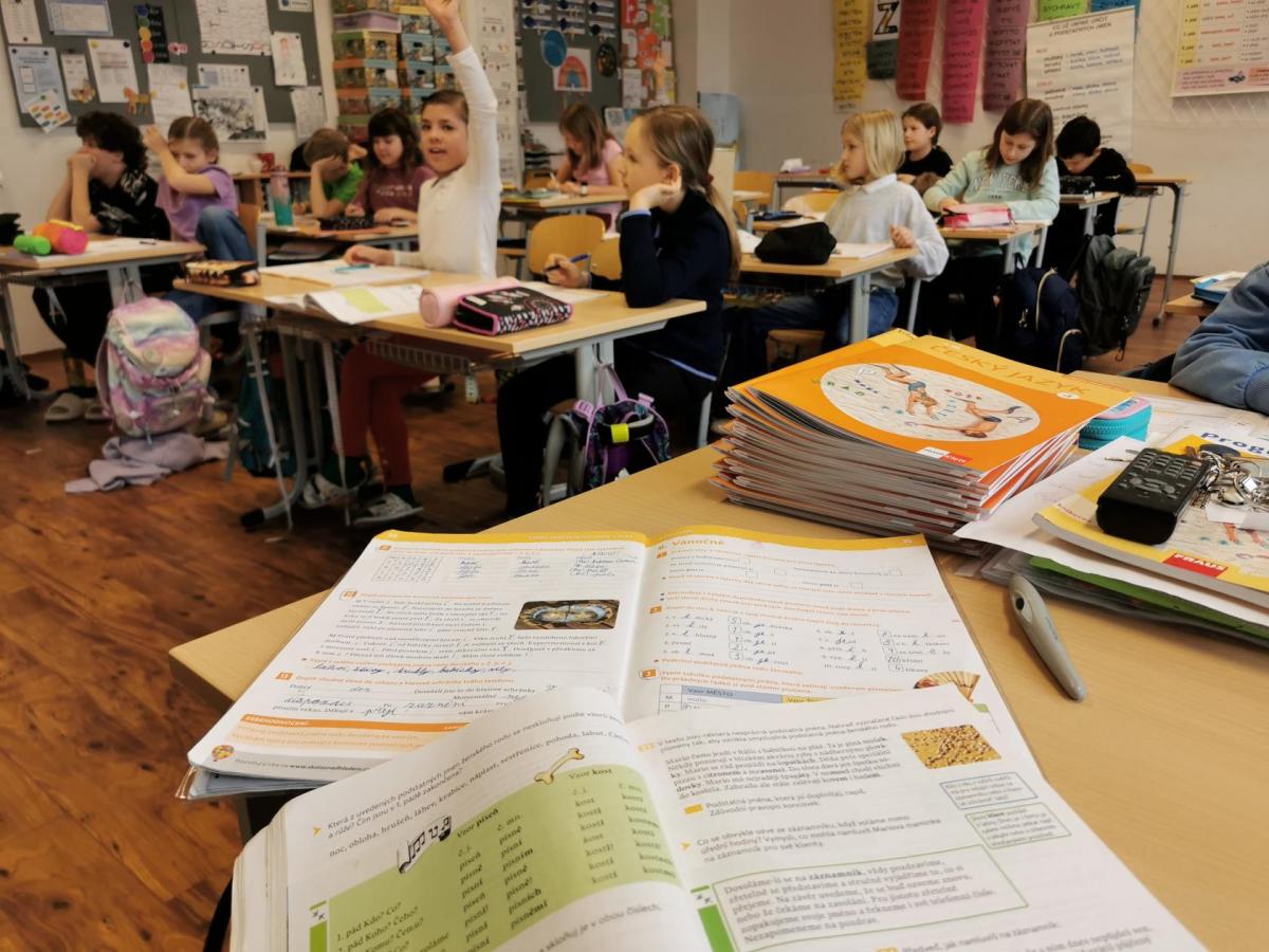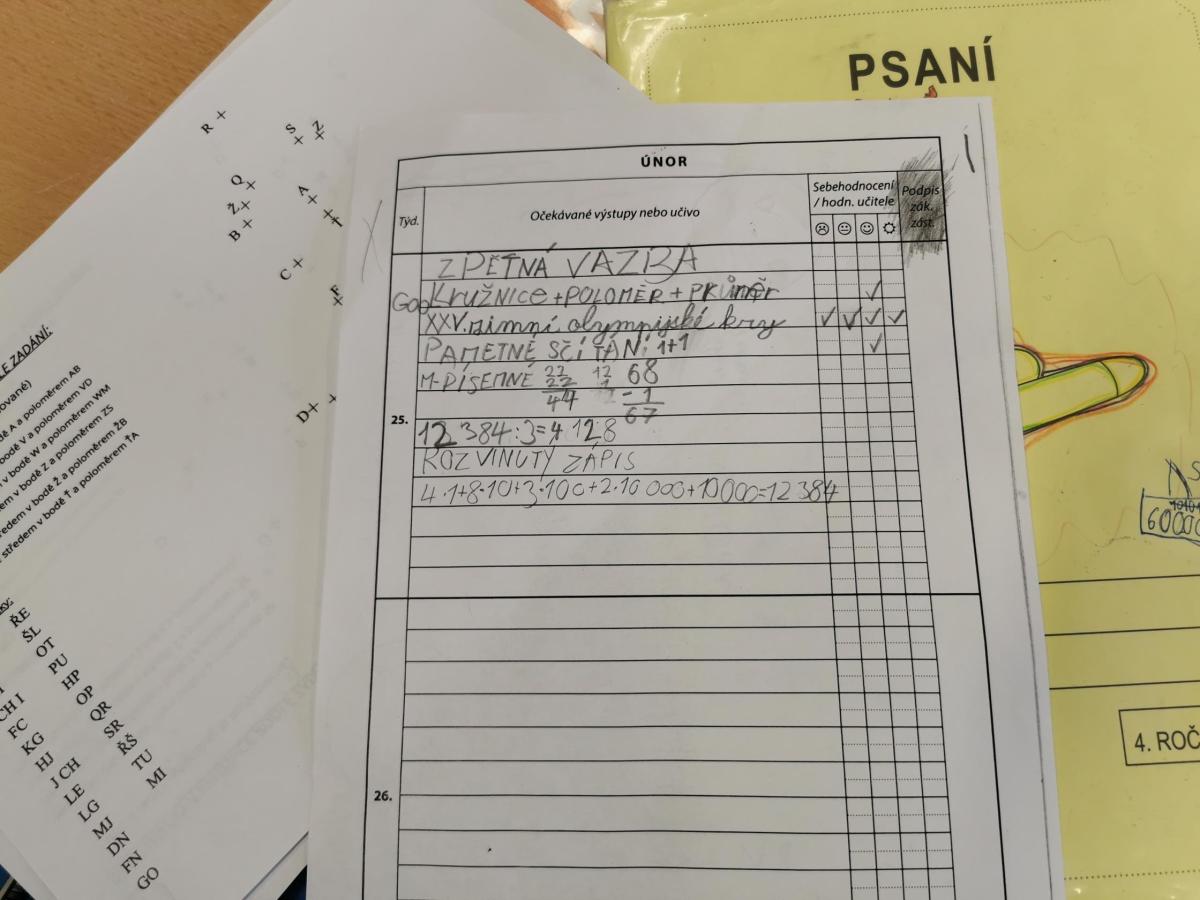 Ve vlastivědě vybarvujeme časovou osu od pravěku až po posledního Přemyslovce, Václav III.. K tomu musíme zvládnout římské číslice a každý den si spočítat pětiminutovku příkladů v sešitě minutovky. Domácích úkolů není mnoho – když člověk pracuje ve škole, doma je to pak hračka.
