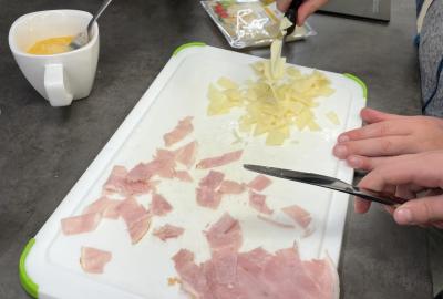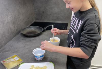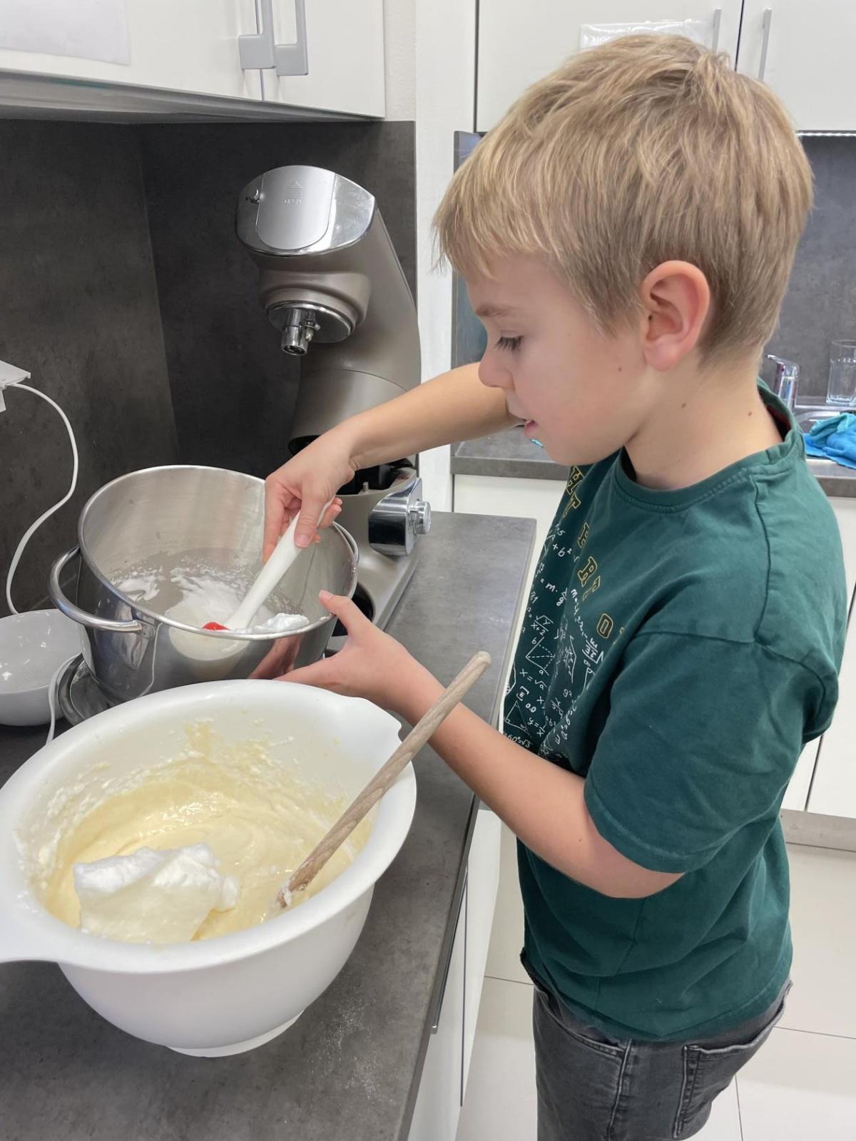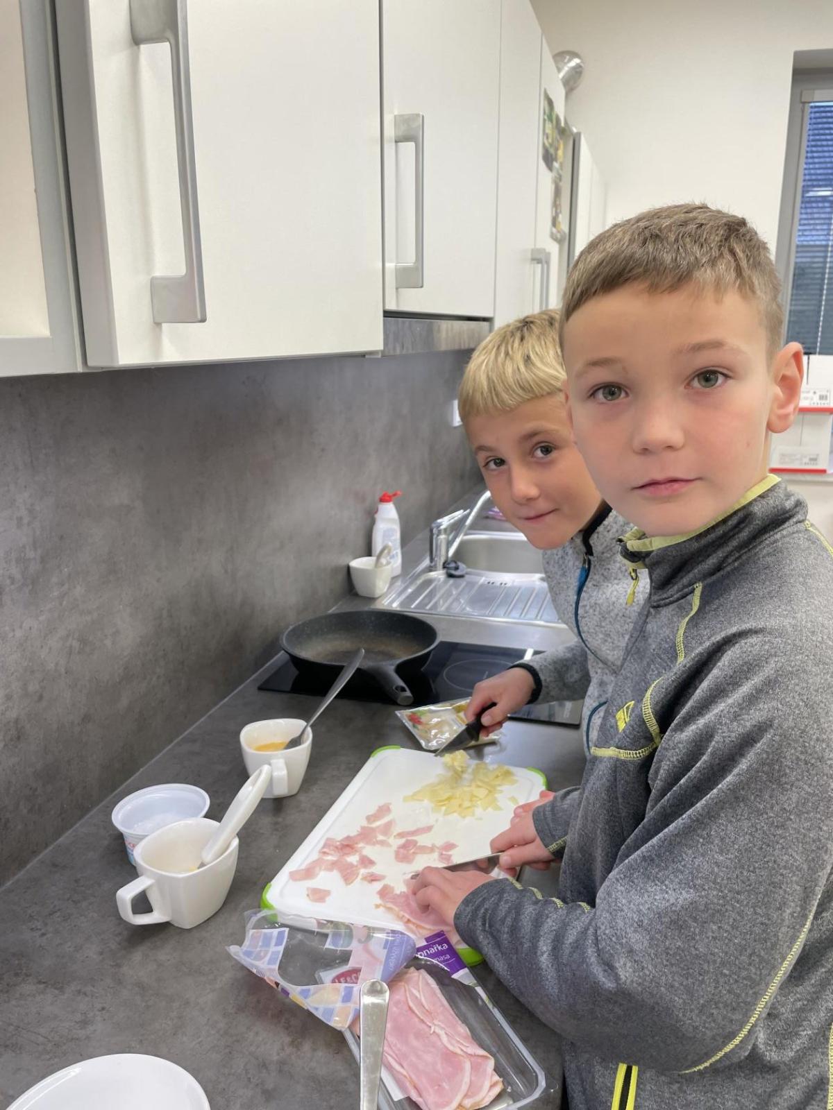 Již v minulém roce si děti vyzkoušely v kuchyňce připravit jednoduchý pokrm - vaječnou omeletu se šunkou a sýrem. To jsem jim jěště hodně pomáhala, ale dnes, kdy už jsou o rok starší, bylo potřeba, aby již práce byla samostatná. A tak tématem přípravy byla opět vaječná omeleta se šunkou a sýrem, to abych zjistila, jak budou děti již samostatně pracovat.Ale aby to nebylo až tak jednoduché, naplánovala jsem jěště připravit piškot. Práci jsme si rozdělili po částech - samostatná příprava omelet a společná příprava těsta na piškot. Nejdříve si chlapci připravovali omelety - bylo vidět, že už jim to šlo o poznání lépe, vlastně mohu konstatovat, že výborně. Děvčata připravovala se mnou těsto na piškot. Pomáhal jim Láďa. A když jsme těsto na piškot dali péci do trouby, to už kluci měli omelety hotové, týmy se v práci vystřídaly, tedy omelety šla dělat skupina, co se mnou připravovala těsto na piškot. Musím moc a moc pochválit "piškoťáky" /děti, co připravovaly těsto na piškot- daly si záležet/. Piškot krásně "vyběhl", byl nadýchaný, prostě takový , no mňam - všichni ho chválili, tak moc chutnal /budeme znovu připravovat/.