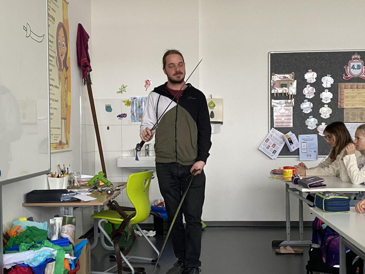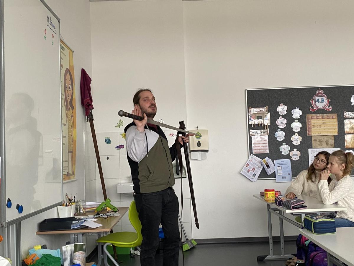 Do třídy zavítal šermíř a dětem přiblížil historické zbraně i umění šermu.