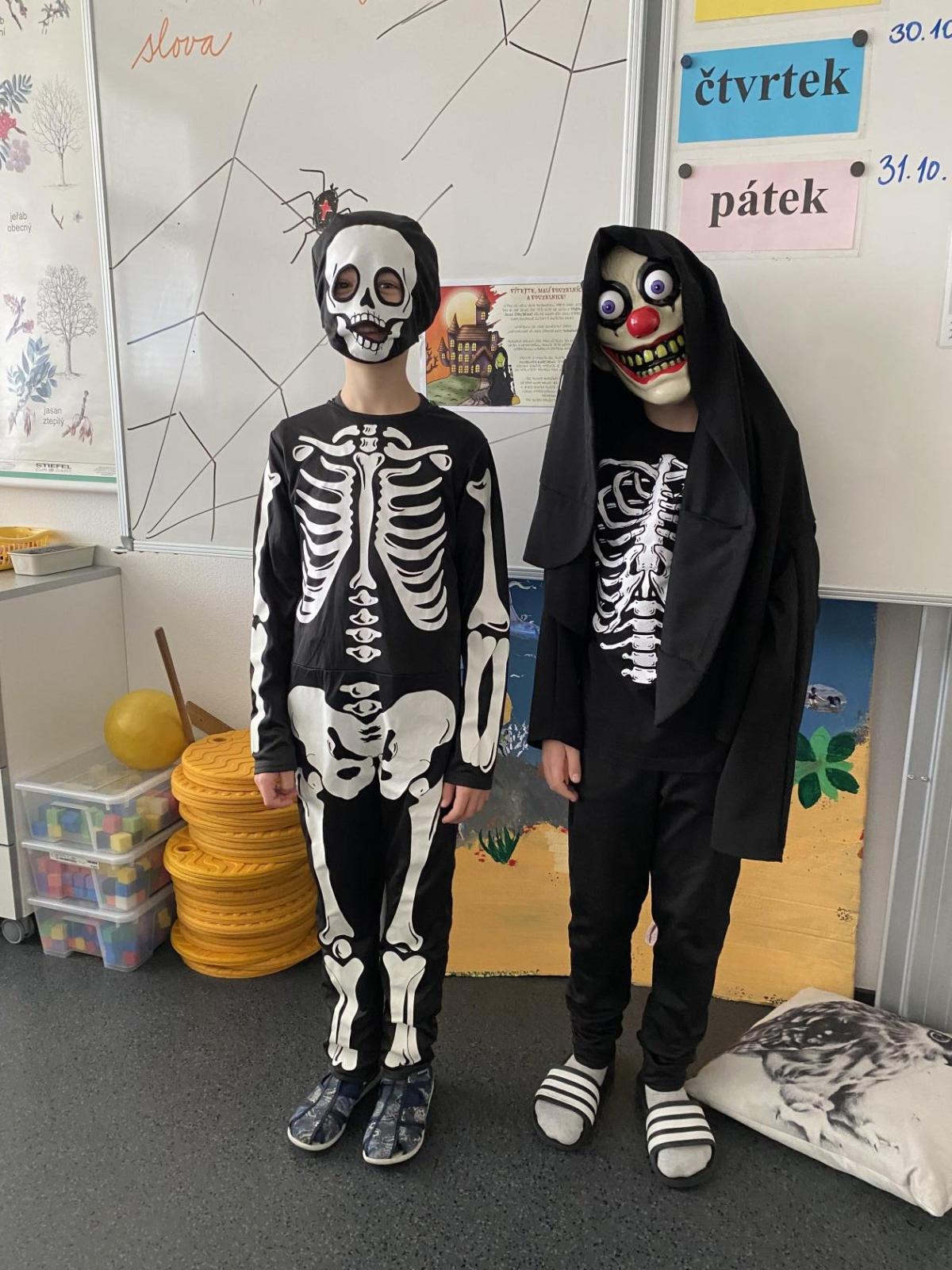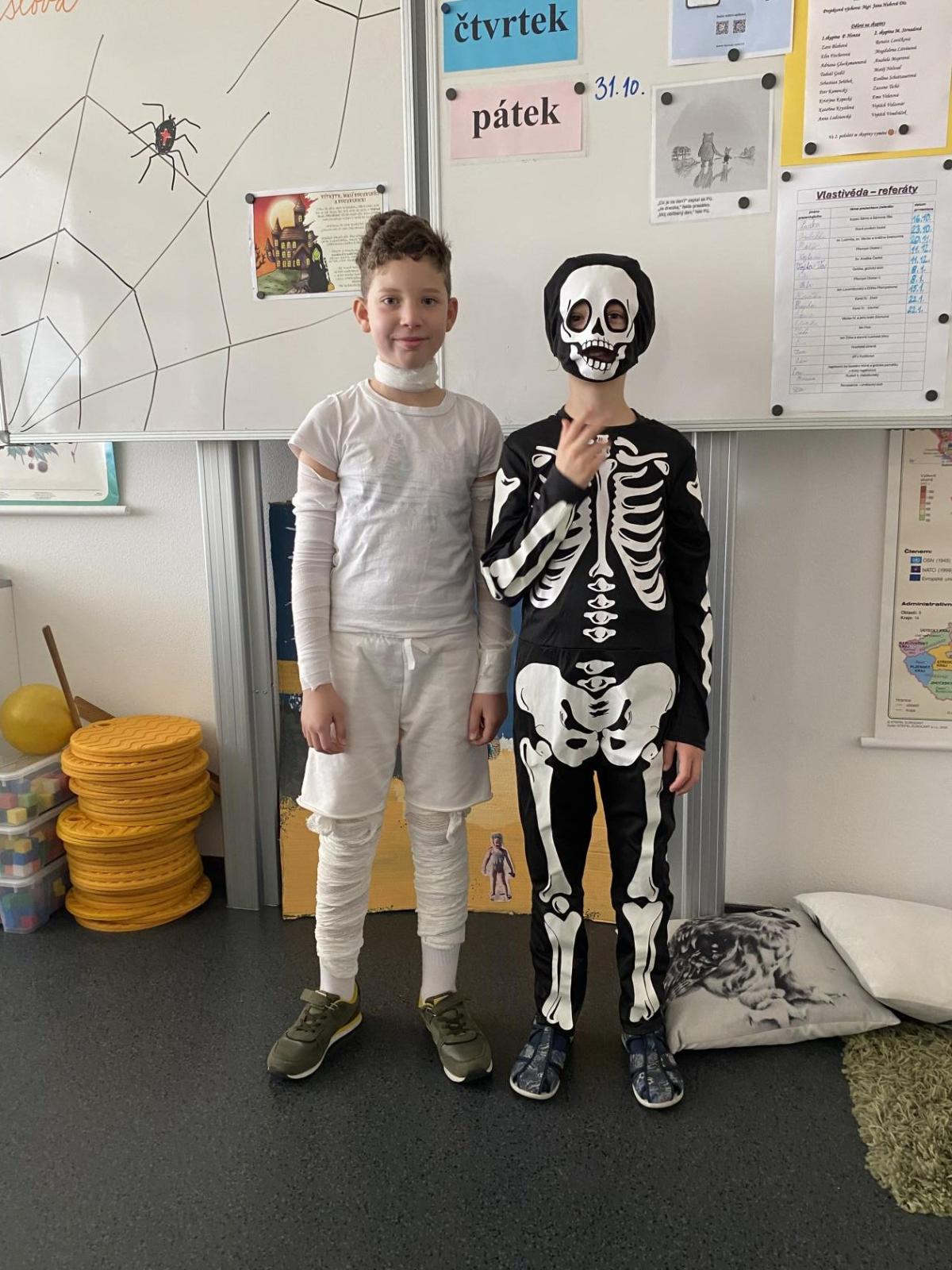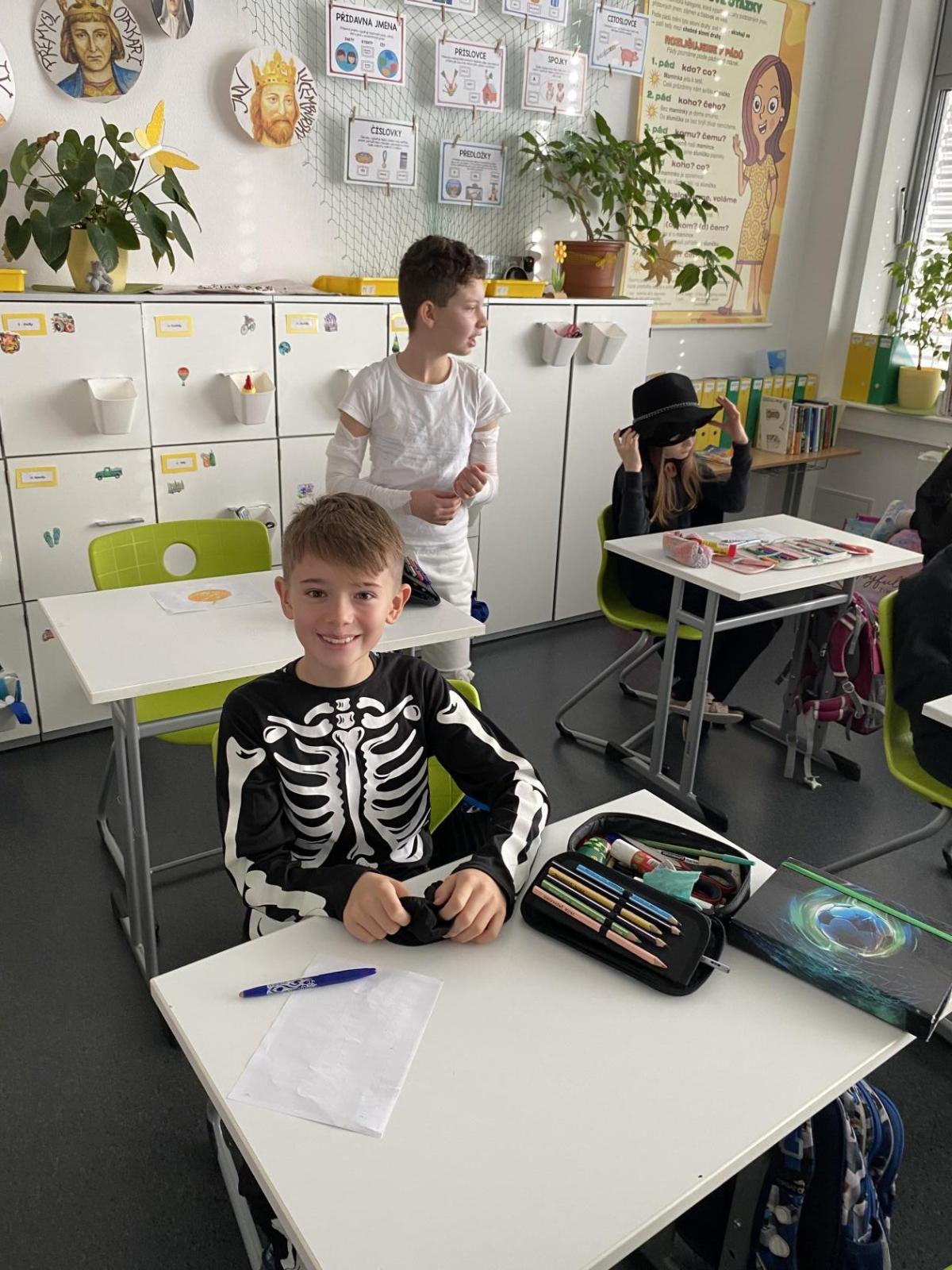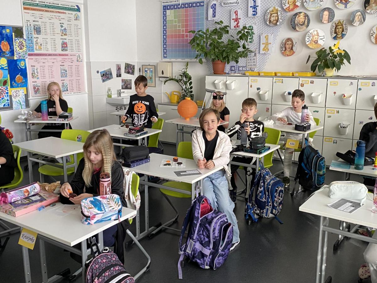 I tentokrát jsme pustili za dveře dávné Kelty a 31. říjen pojali jako jejich svátek s historií sahající až do doby před naším letopočtem. Hranici mezi létem a zimou, hranici mezi světem živých a mrtvých. My jsme u nás ve třídě zahráli na tu veselejší notu. Převlékli jsme se do rozpustile strašidelných kostýmů, plnili úkoly únikové hry, abychom vysvobodili naši paní učitelku z čarodějnického zakletí a pochutnali si na pravé halloweenské pochoutce! Nesměli jsme samozřejmě vynechat ani školní povinnosti - opakování vyjmenovaných slov, až se kostlivcům kosti třásly a trénovali jsme také rýsování kolmic a rovnoběžek, až z toho mumii povolily obvazy! Dnes dopoledne jsme si na Halloween jen zahráli, ale večer mnohé z nás čeká lampionový průvod vesnicí a v neděli potom tichá vzpomínka a zapálení svíček za všechny, které stále nosíme v našich srdcích, i když už tu s námi nejsou.