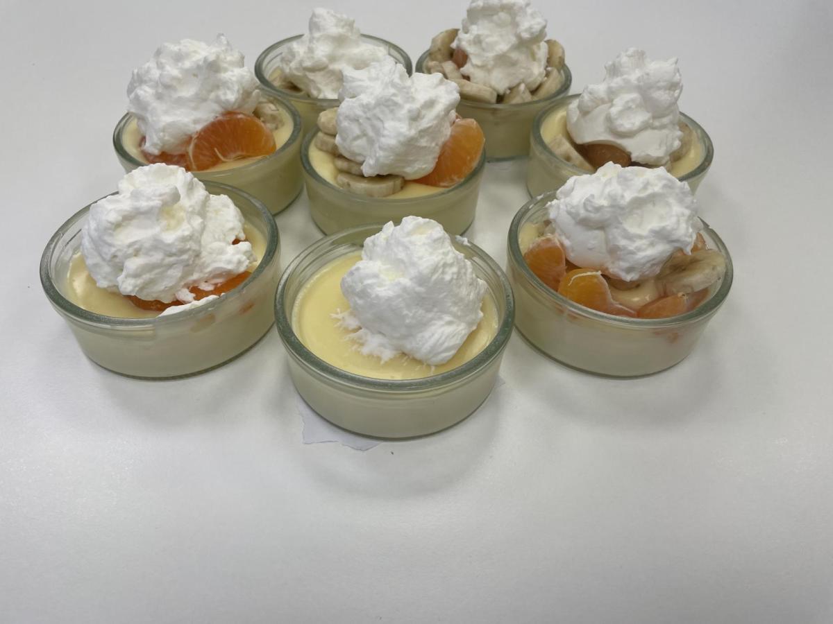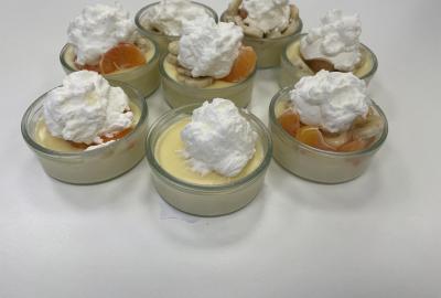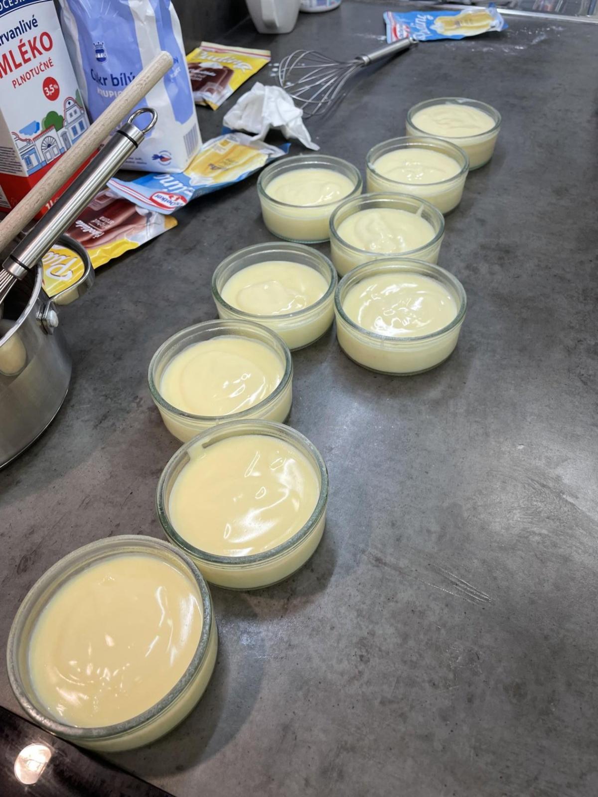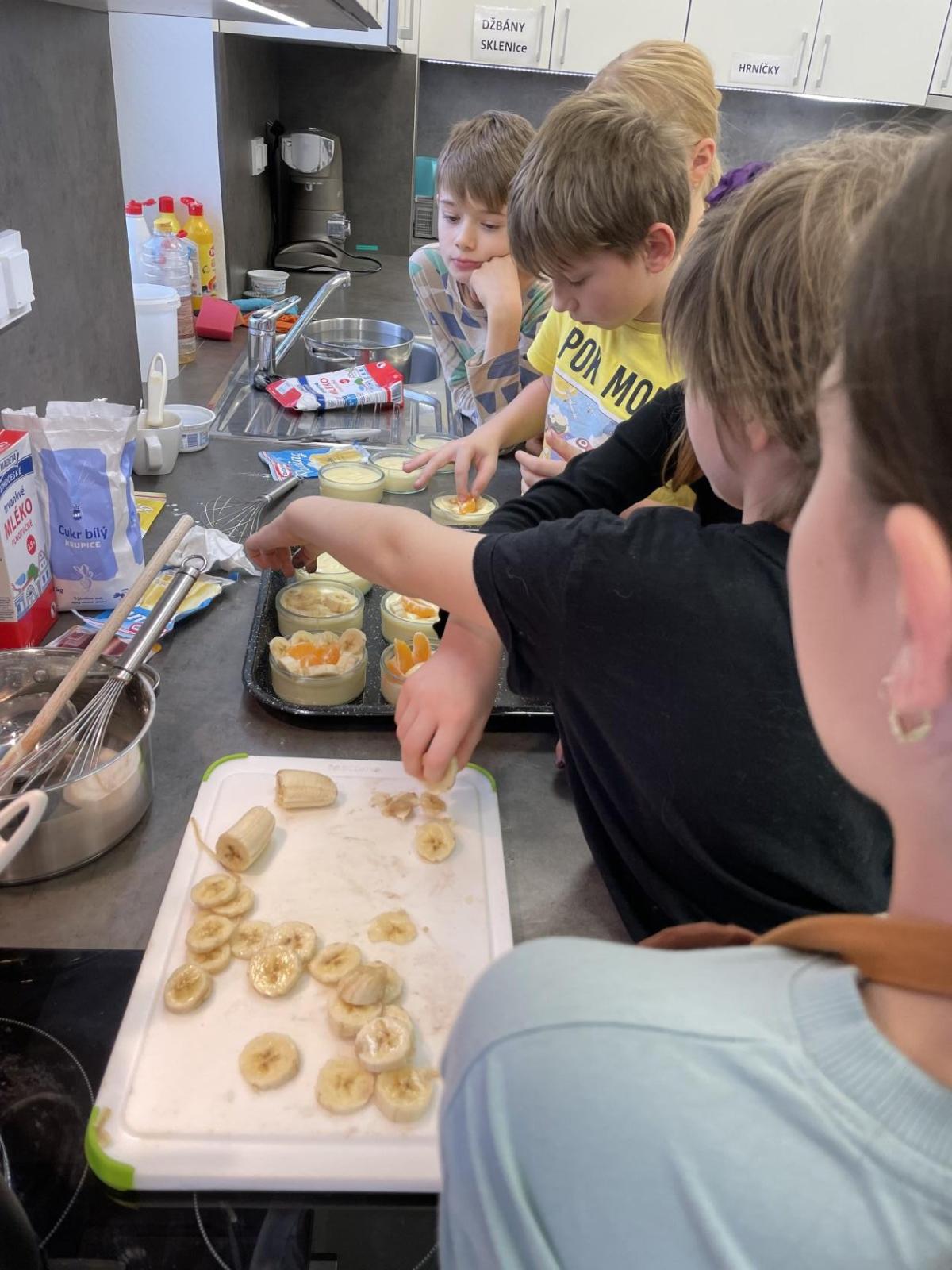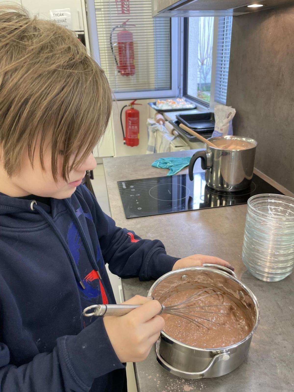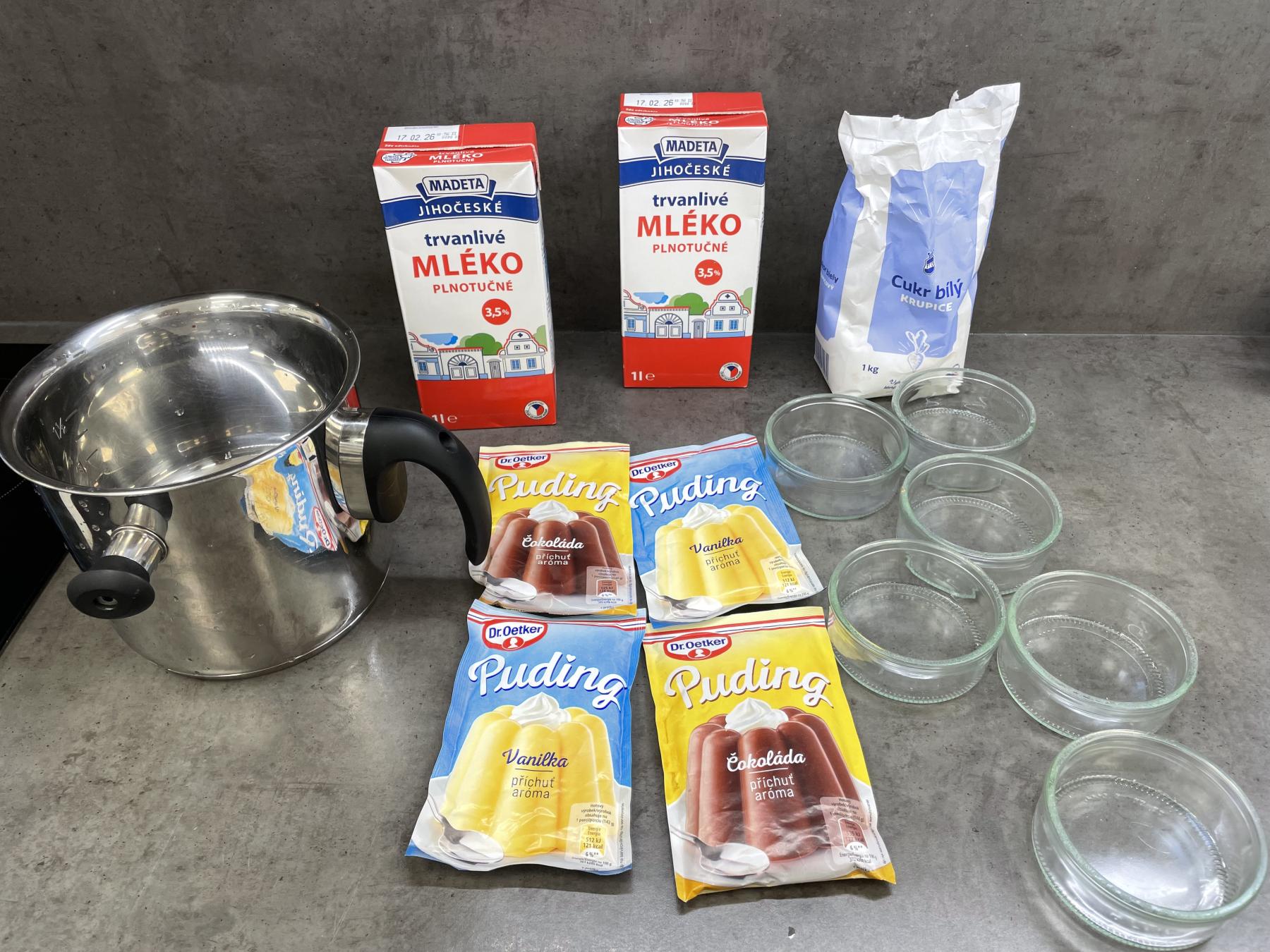 Dnes jsme v kuchyňce připravovali vanilkový i čokoládový puding. Na přípravu jsme použili hrnec - zvaný mlékovar. Ten hrnec je báječnou pomůckou, když se vaří mléko, neb v této nádobě se vám mléko nepřipálí. Hrnec je dvoustěnný, což znamená, že mezi stěny hrnce se hubičkou naleje voda, hubička se uzavře píšťalkou, do nádoby se naleje mléko a hrnec dáte na plotýnku. Když začne mléko vařit, voda mezi stěnami vytvoří páru, která stoupá přes uzávěr tzv. píšťalku. Píšťalka vydá pískavý signál, což znamená, že mléko vaří......Podle návodu na sáčku zvládne uvařit puding každý. Nalít puding do mističek, dozdobit ovocem, nechat vychladit, dozdobit šlehačkou a dílo je hotové. Byla to dobrá svačina pro všechny.