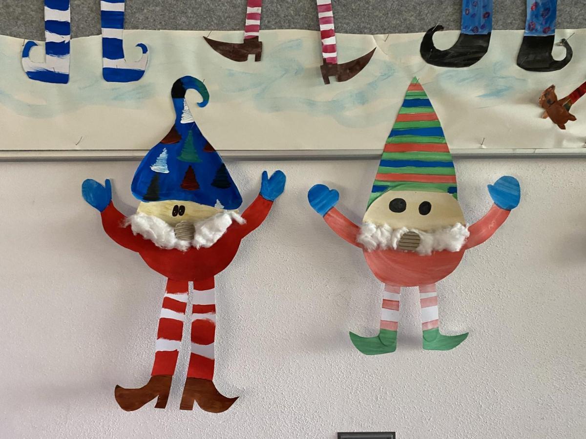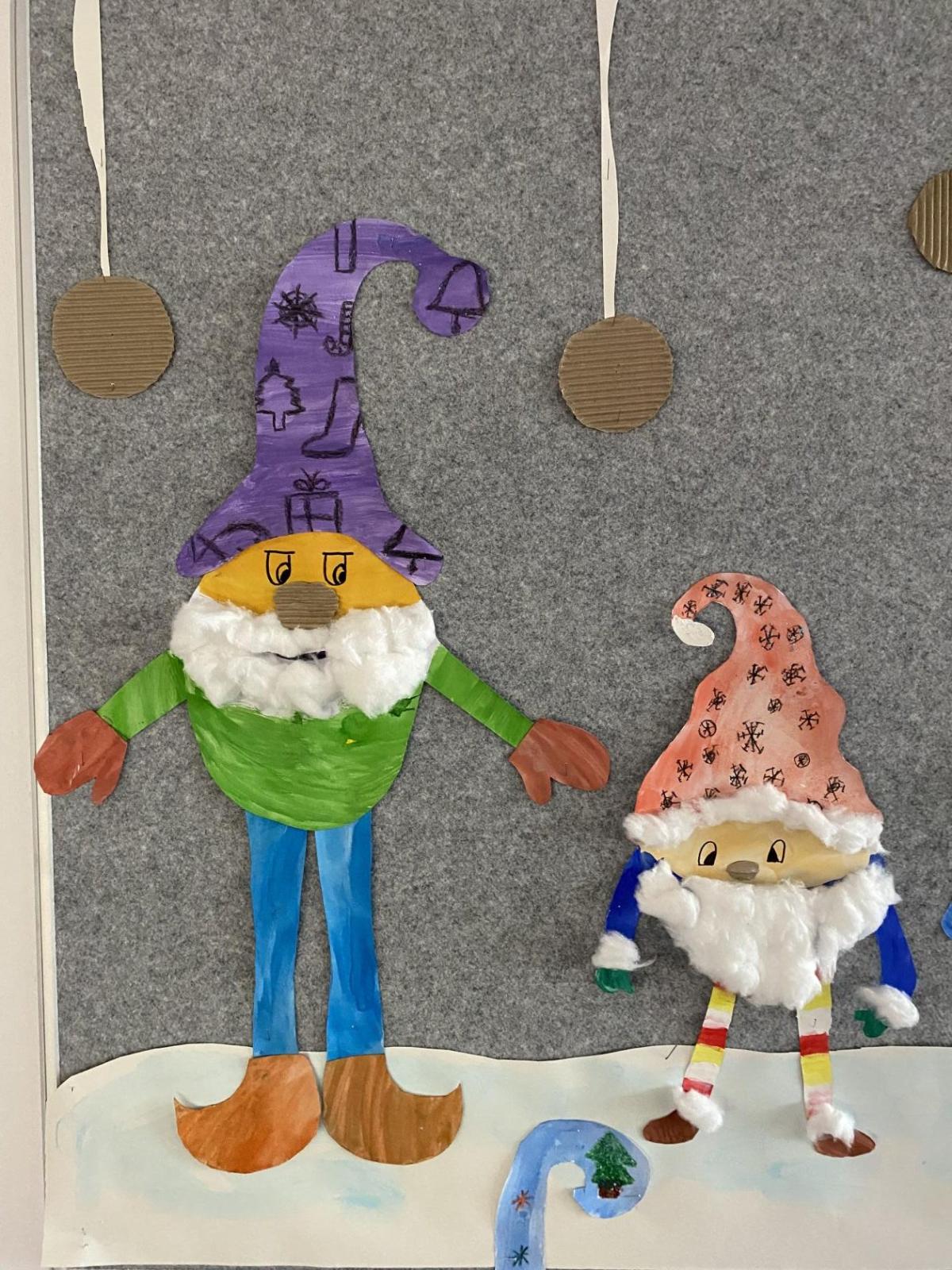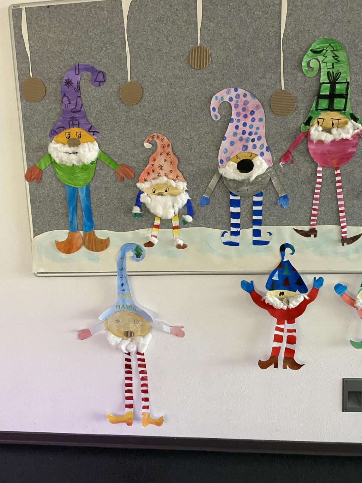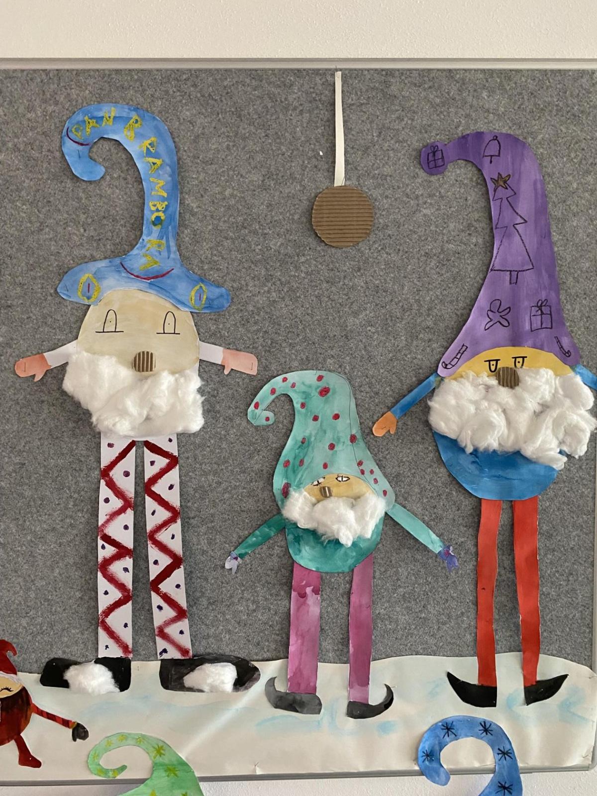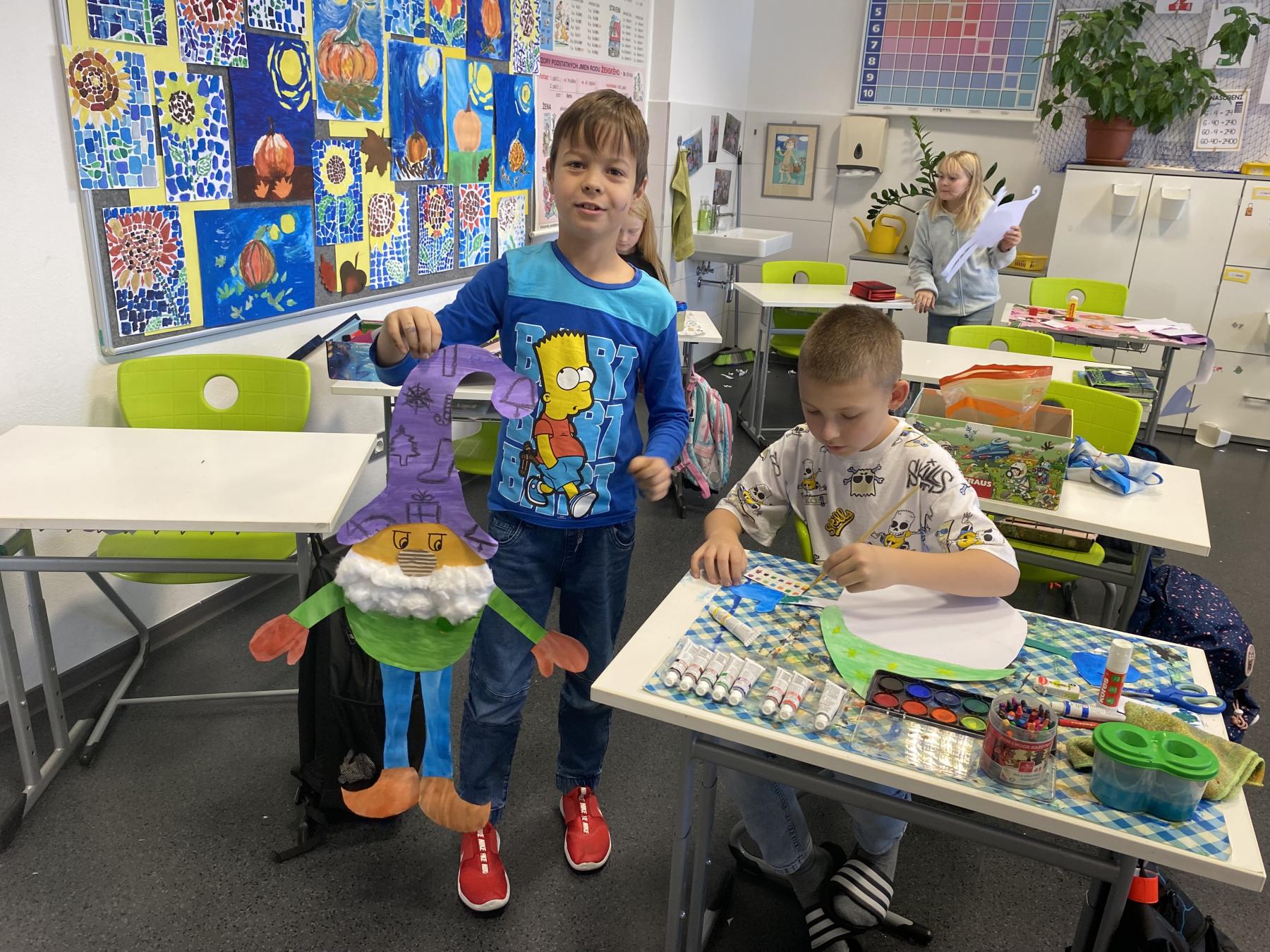 Výtvarku jsme tento čtvrtek pojali hodně předvánočně. Sotva jsme zamávali sv. Martinovi a jeho doprovodu, začali jsme přemýšlet, jak vyzdobit třídu a chodbu, abychom se rozloučili s podzimem a pomalu se začali chystat na to nejkrásnější období - na Vánoce. Výtvarnou výchovu máme letos jen jednou za čtrnáct dní, takže času moc nezbývá. Paní učitelka tedy navrhla, že bychom si mohli namalovat a vyrobit malého skřítka, který zamává podzimu a později přivítá advent. A tak jsme se do toho dali! Připravili jsme si čtvrtky, barvy, nůžky, vatu...... a další potřebný materiál. Vybrali si ten správný prostor a začali kreslit, stříhat a barvit skřítkovo tělíčko. Po dvou hodinách se to naší chodbou začalo mihotat různými podižvíky. To se naši skřítkové čile hlásili k světu! Zuzka navrhla, že bychom jim mohli udělat z role papíru sněhovou cestičku, aby se jim na naší nástěnce líbilo :). Paní učitelka ji za nápad pochválila a dala se do jeho realizace. A když jsme přišli v pátek ráno do školy, už se na nás skřítci z nástěnky hezky usmívali.
