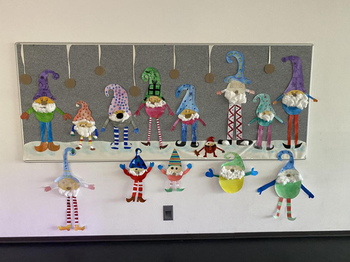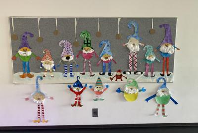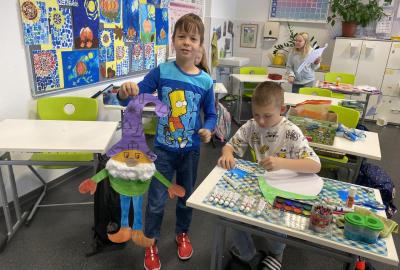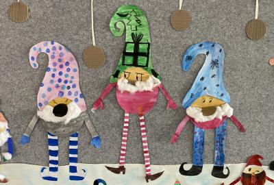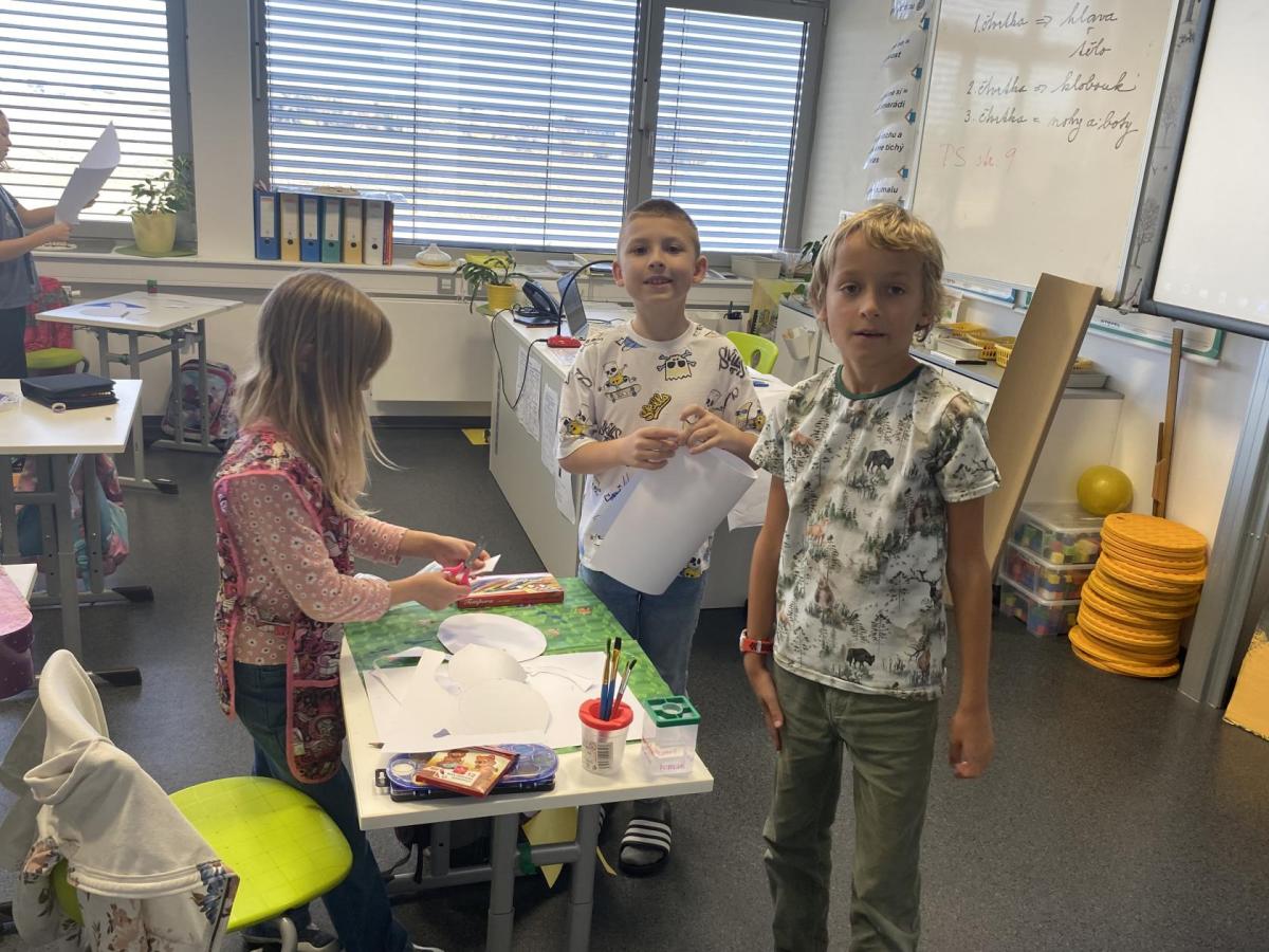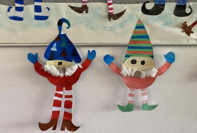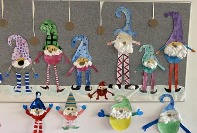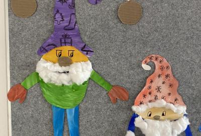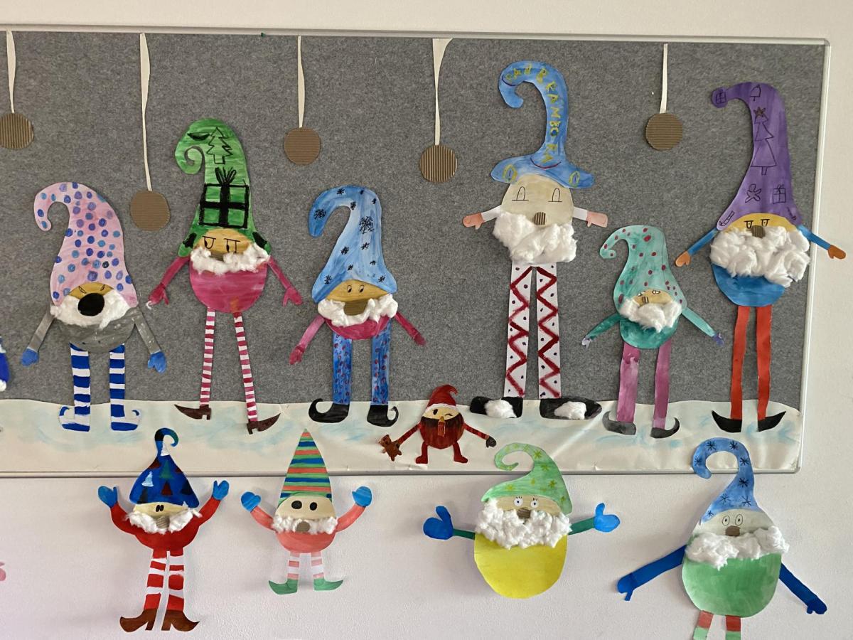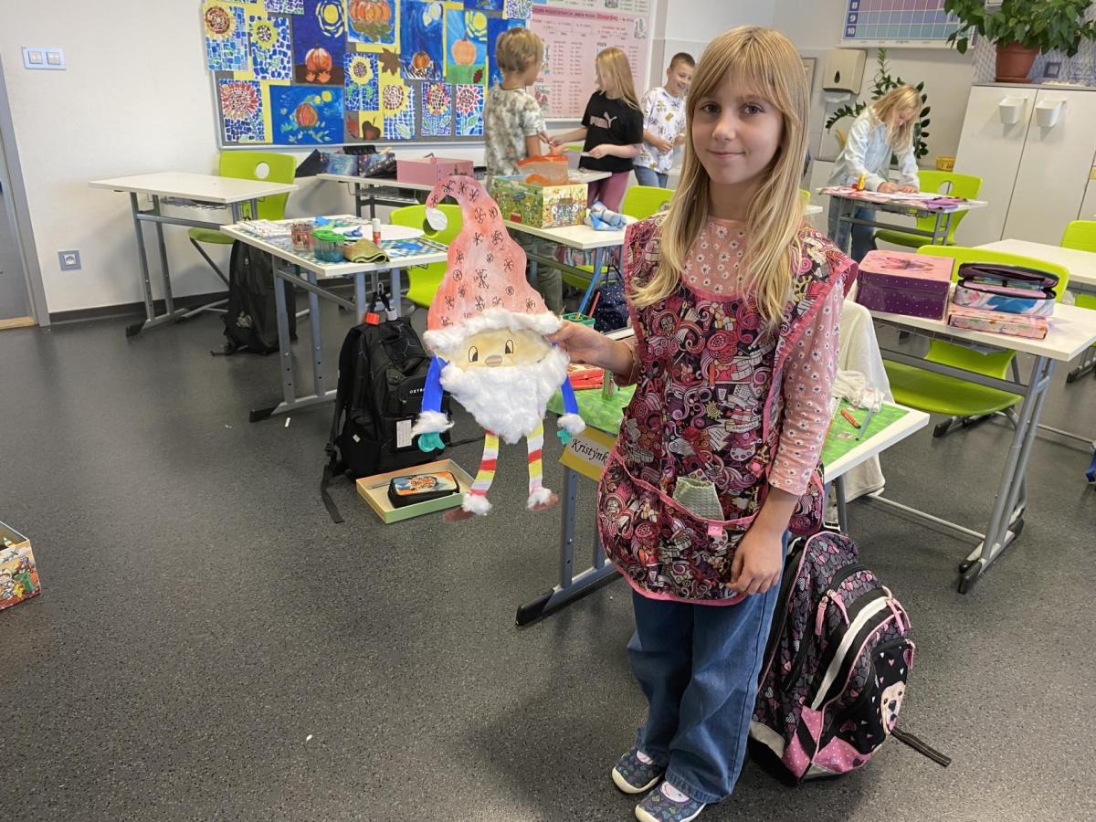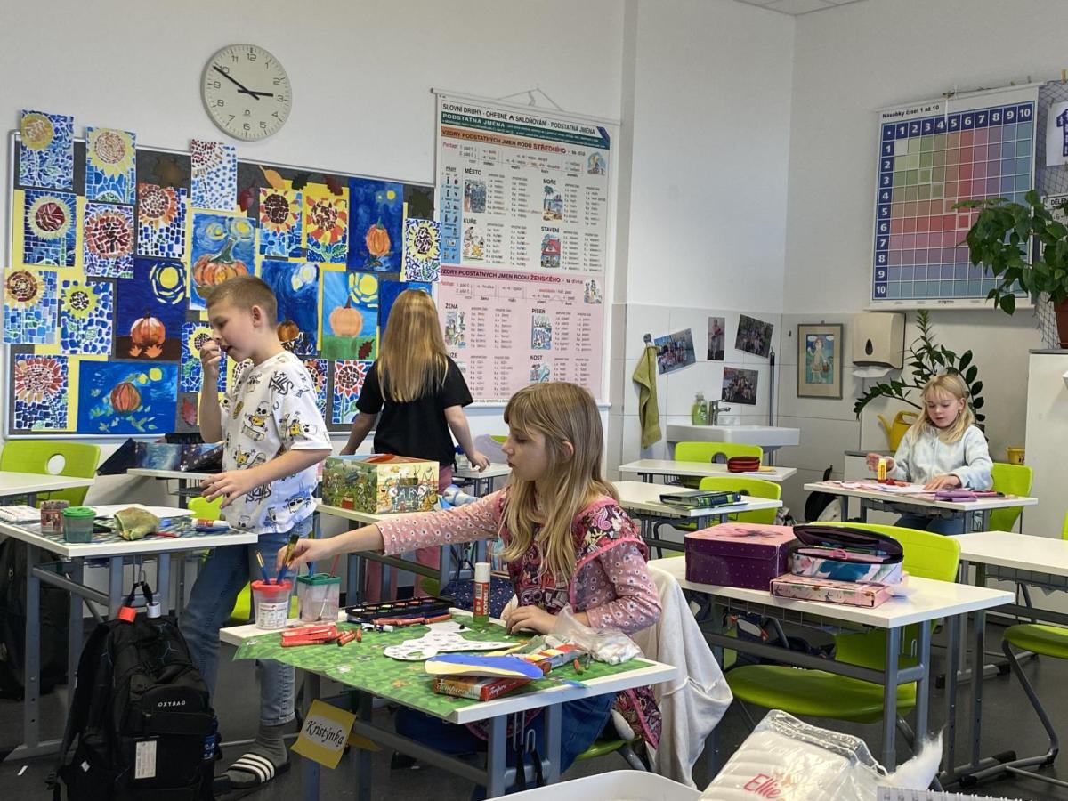 Výtvarku jsme tento čtvrtek pojali hodně předvánočně. Sotva jsme zamávali sv. Martinovi a jeho doprovodu, začali jsme přemýšlet, jak vyzdobit třídu a chodbu, abychom se rozloučili s podzimem a pomalu se začali chystat na to nejkrásnější období - na Vánoce. Výtvarnou výchovu máme letos jen jednou za čtrnáct dní, takže času moc nezbývá. Paní učitelka tedy navrhla, že bychom si mohli namalovat a vyrobit malého skřítka, který zamává podzimu a později přivítá advent. A tak jsme se do toho dali! Připravili jsme si čtvrtky, barvy, nůžky, vatu...... a další potřebný materiál. Vybrali si ten správný prostor a začali kreslit, stříhat a barvit skřítkovo tělíčko. Po dvou hodinách se to naší chodbou začalo mihotat různými podižvíky. To se naši skřítkové čile hlásili k světu! Zuzka navrhla, že bychom jim mohli udělat z role papíru sněhovou cestičku, aby se jim na naší nástěnce líbilo :). Paní učitelka ji za nápad pochválila a dala se do jeho realizace. A když jsme přišli v pátek ráno do školy, už se na nás skřítci z nástěnky hezky usmívali.