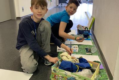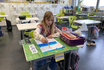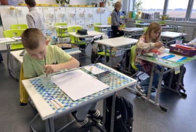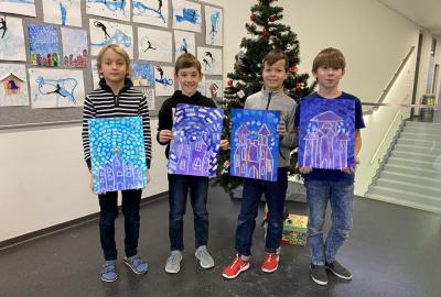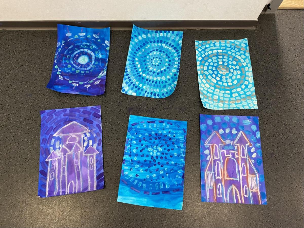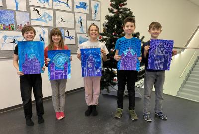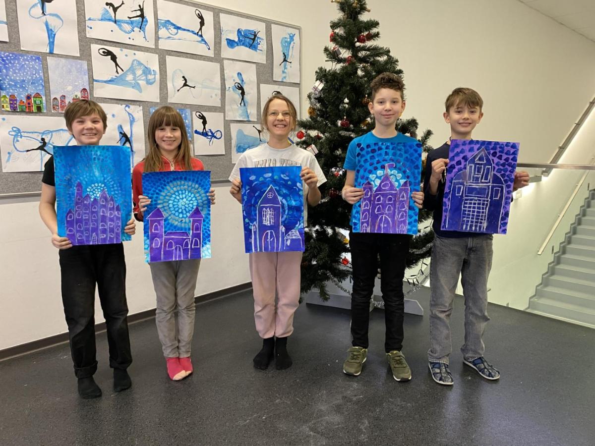 Tento týden jsme se pěkně "obuli" do zimy - malovali jsme Ledové království. S nadšením jsme si připravili temperové i anilinové barvy a vytvářeli jsme barevnou mozaiku pomocí otisků plochého štětce. Ta měla znázorňovat kouzelnou zimní krajinu. Do popředí jsme potom vlepili ledový zámek nakreslený pomocí suchých uměleckých kříd. Nejoblíbenější barvou se tentokrát stala stříbrná tempera, protože dodala našim obrázkům třpyt a zajímavou strukturu. Podařilo se nám vytvořit originální obrázky plné fantazie a zimní nálady. Tu máme nyní pokaždé, když procházíme do třídy kolem naší nástěnky.